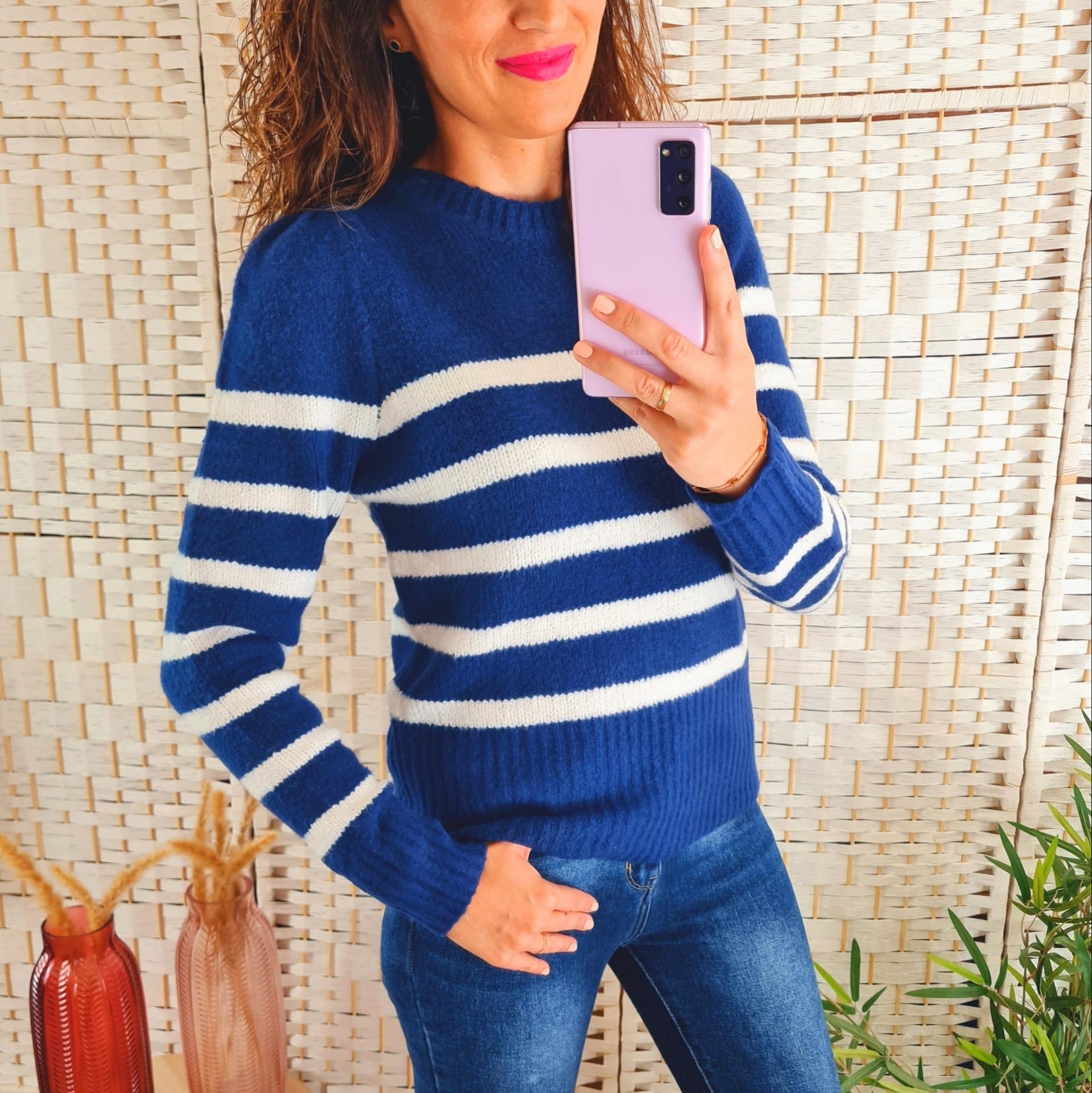 Jersey de color azul eléctrico con rayas blancas. Tiene cuello redondo y manga larga.