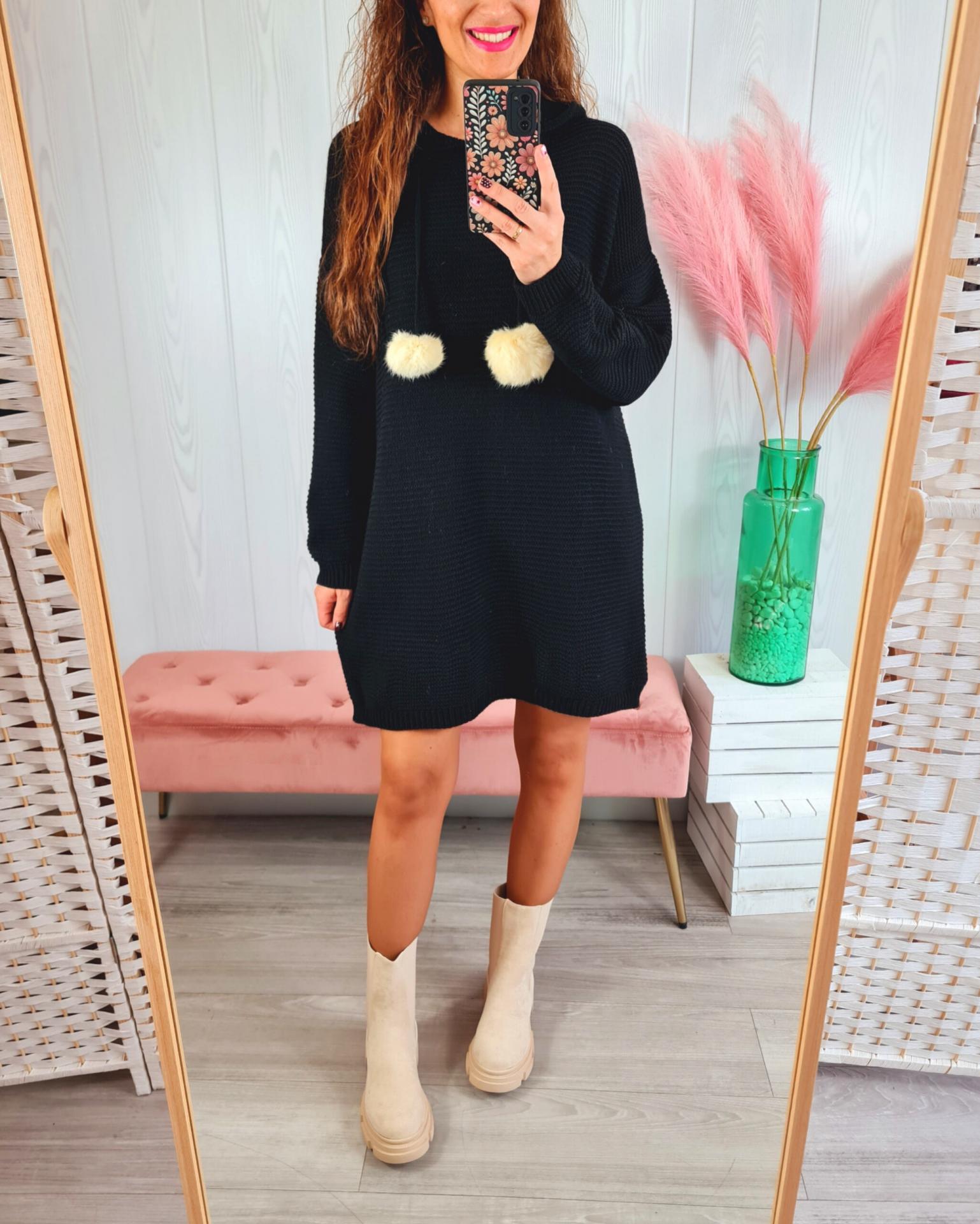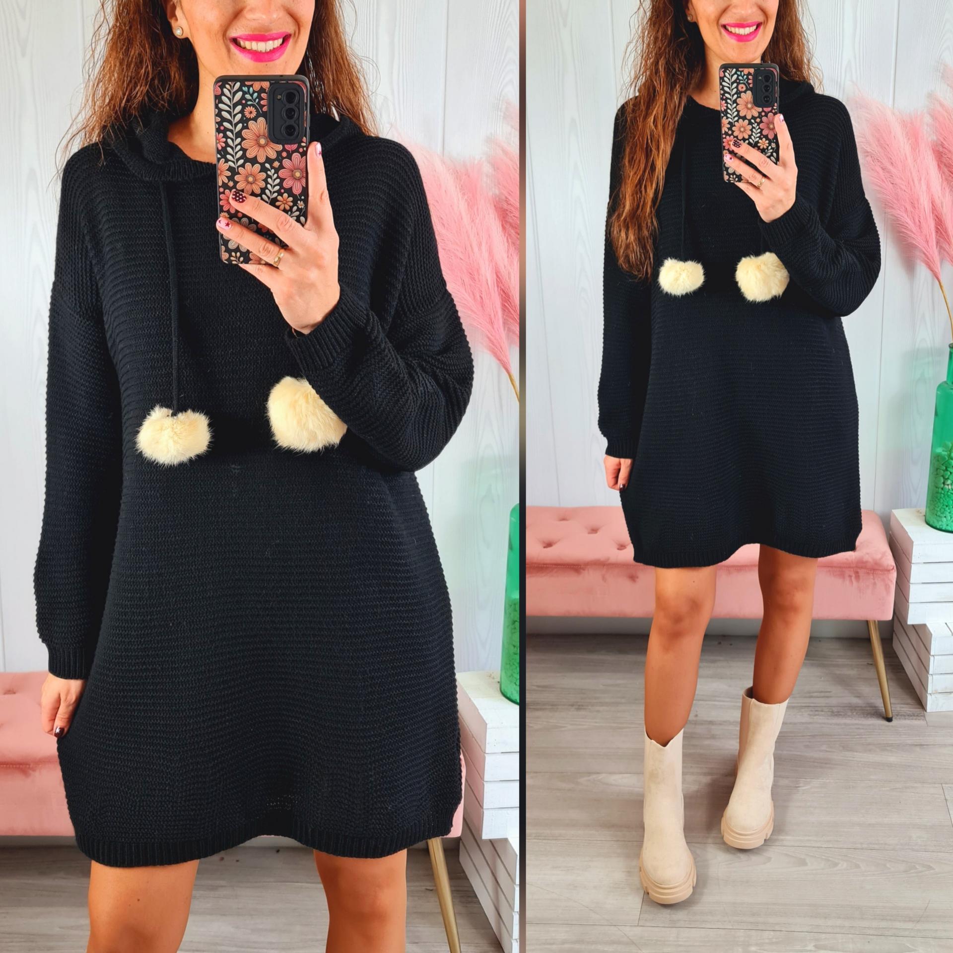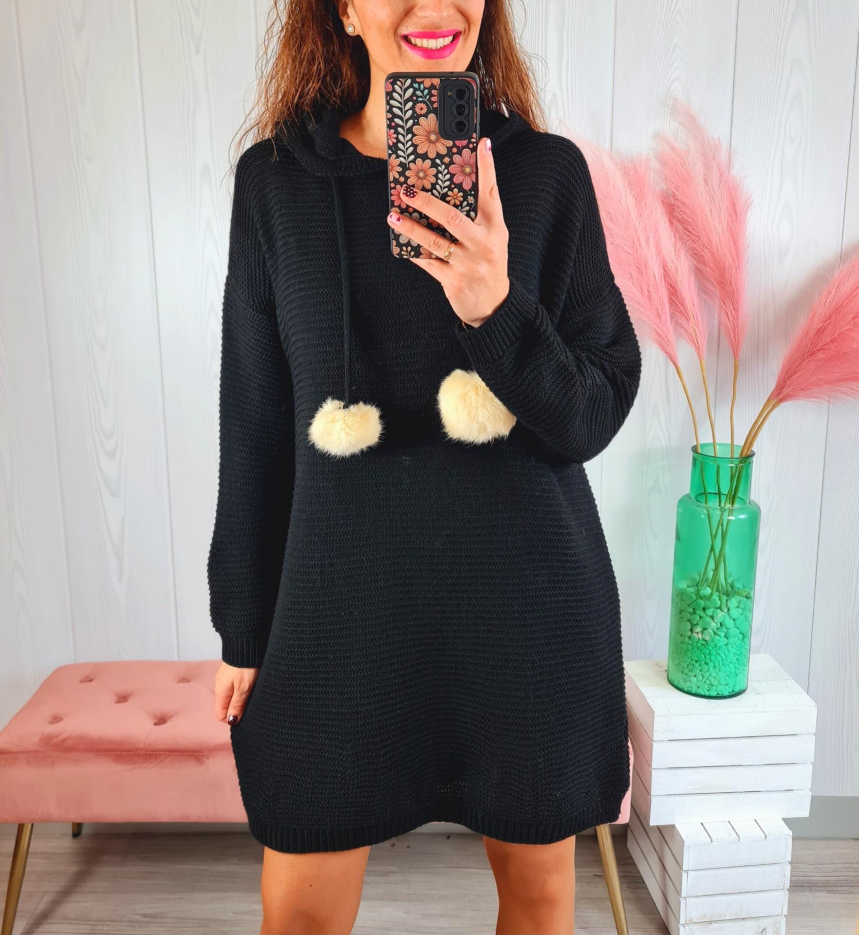 Vestido de punto en color negro. Tiene el cuello redondo, manga larga, capucha y pompones de adorno.
