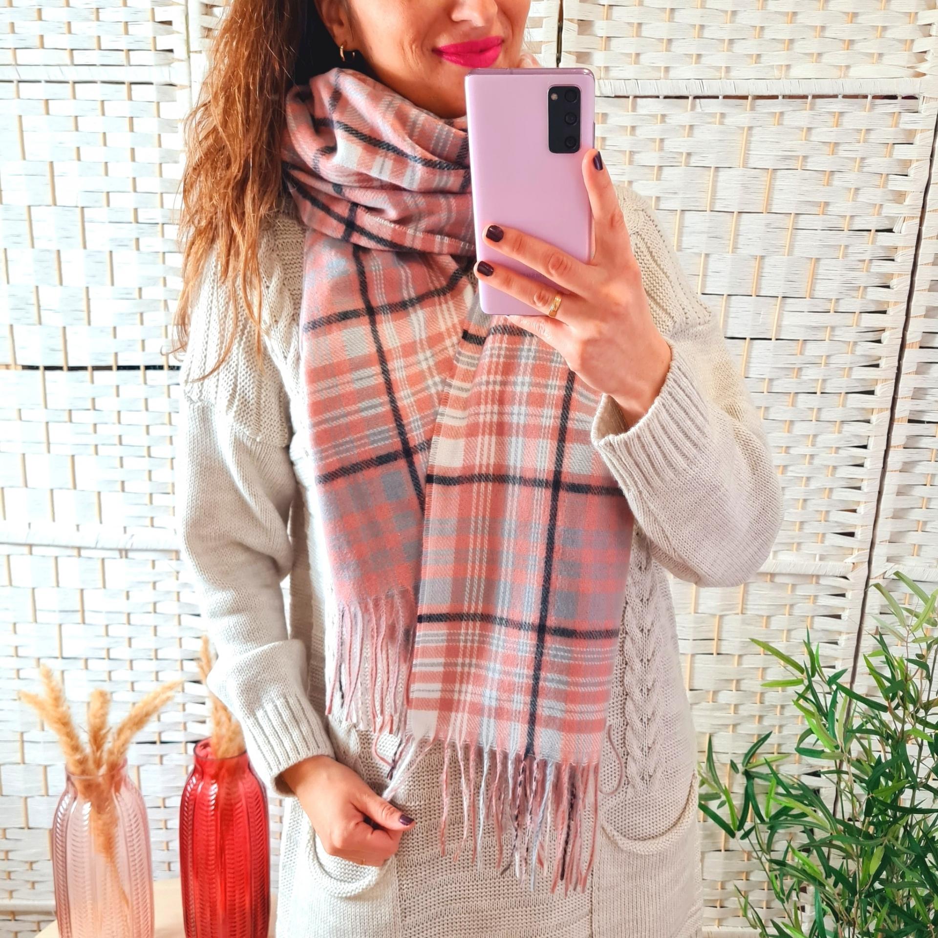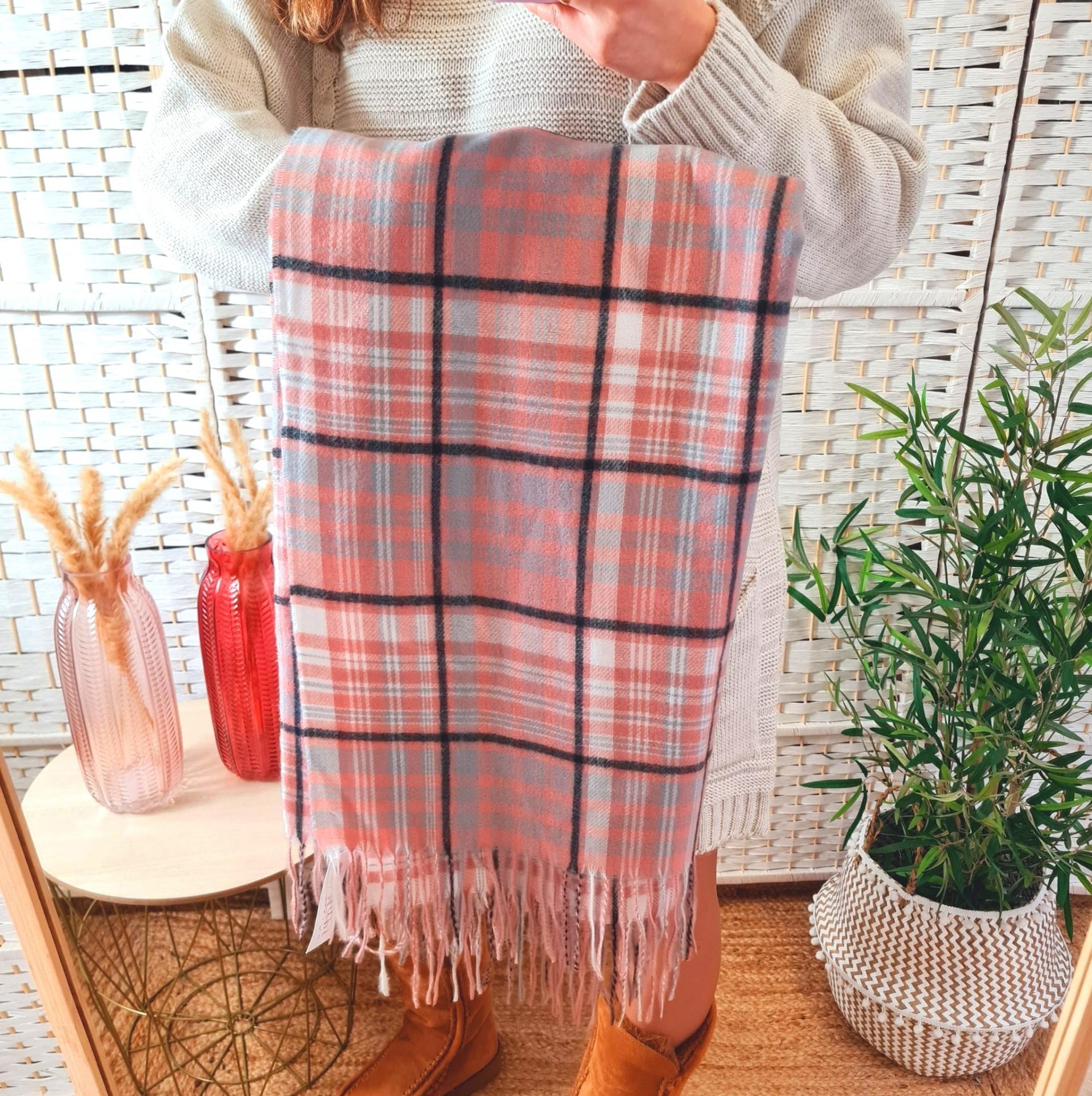 Bufanda calentita en color rosa con cuadros en tonos marrones y azules.