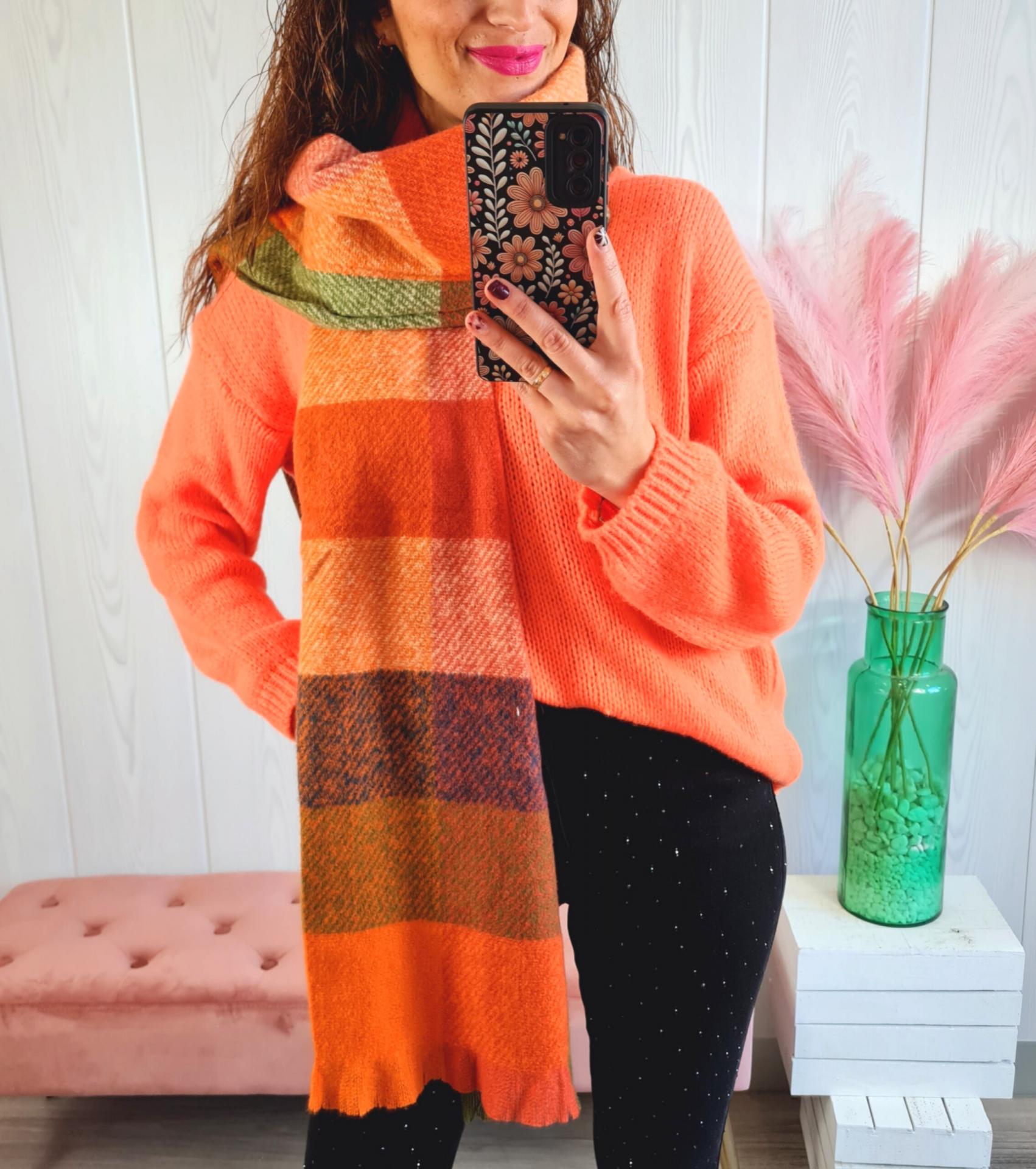 Bufanda de lana gordita super calentita a cuadros en tonos naranjas.