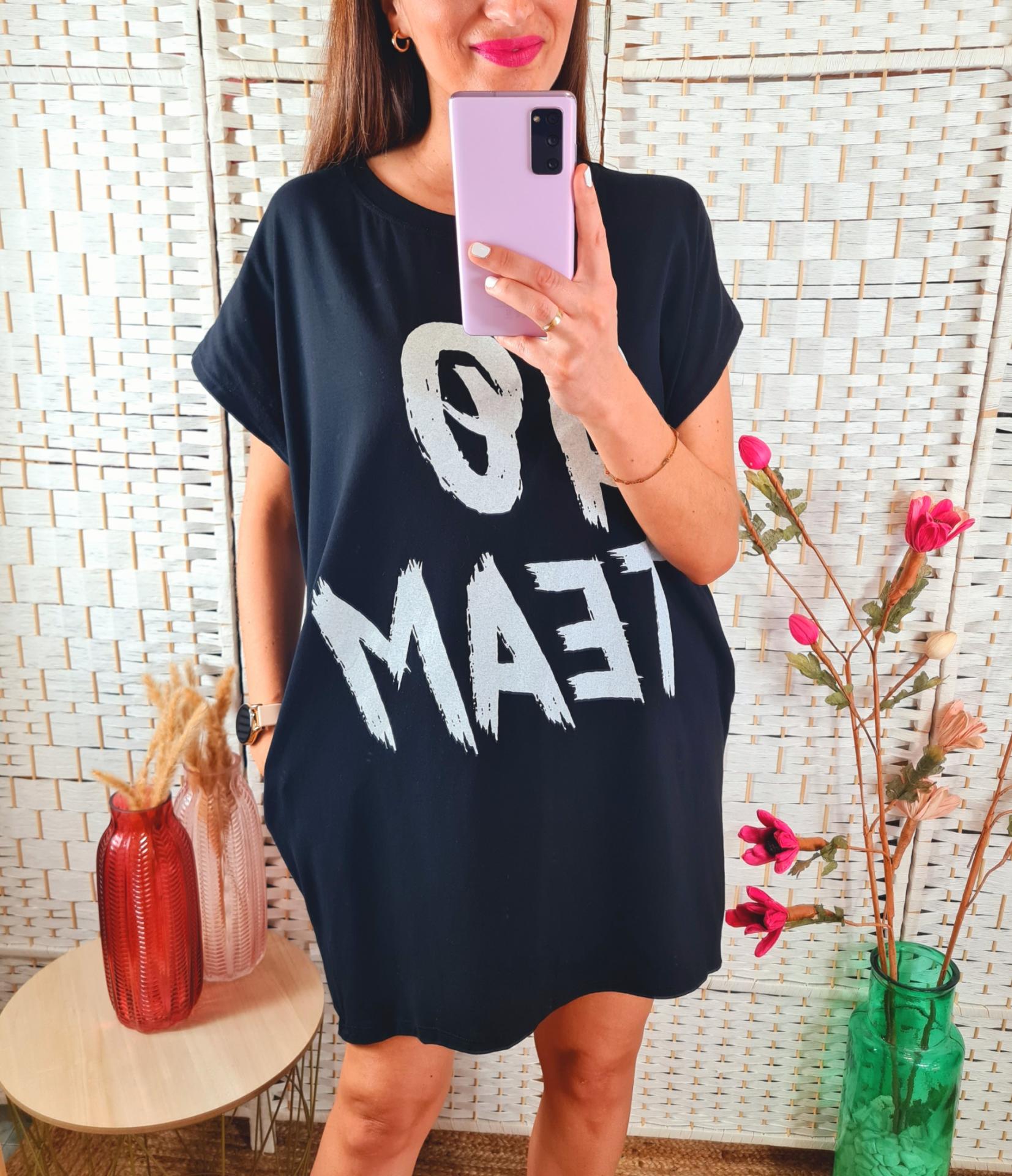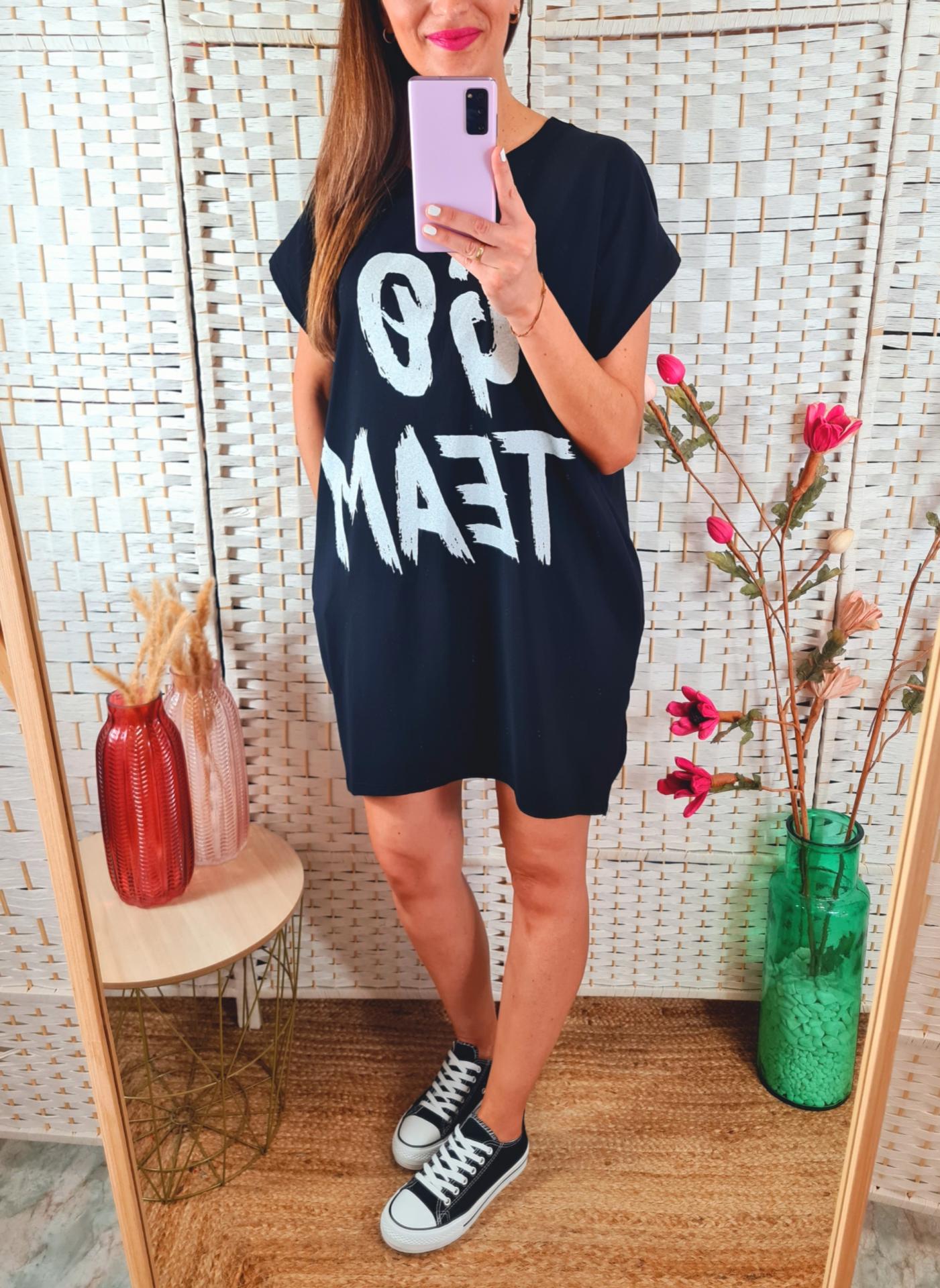 Vestido de sport en color negro con estampado impreso en el pecho, bolsillos laterales y manga corta.