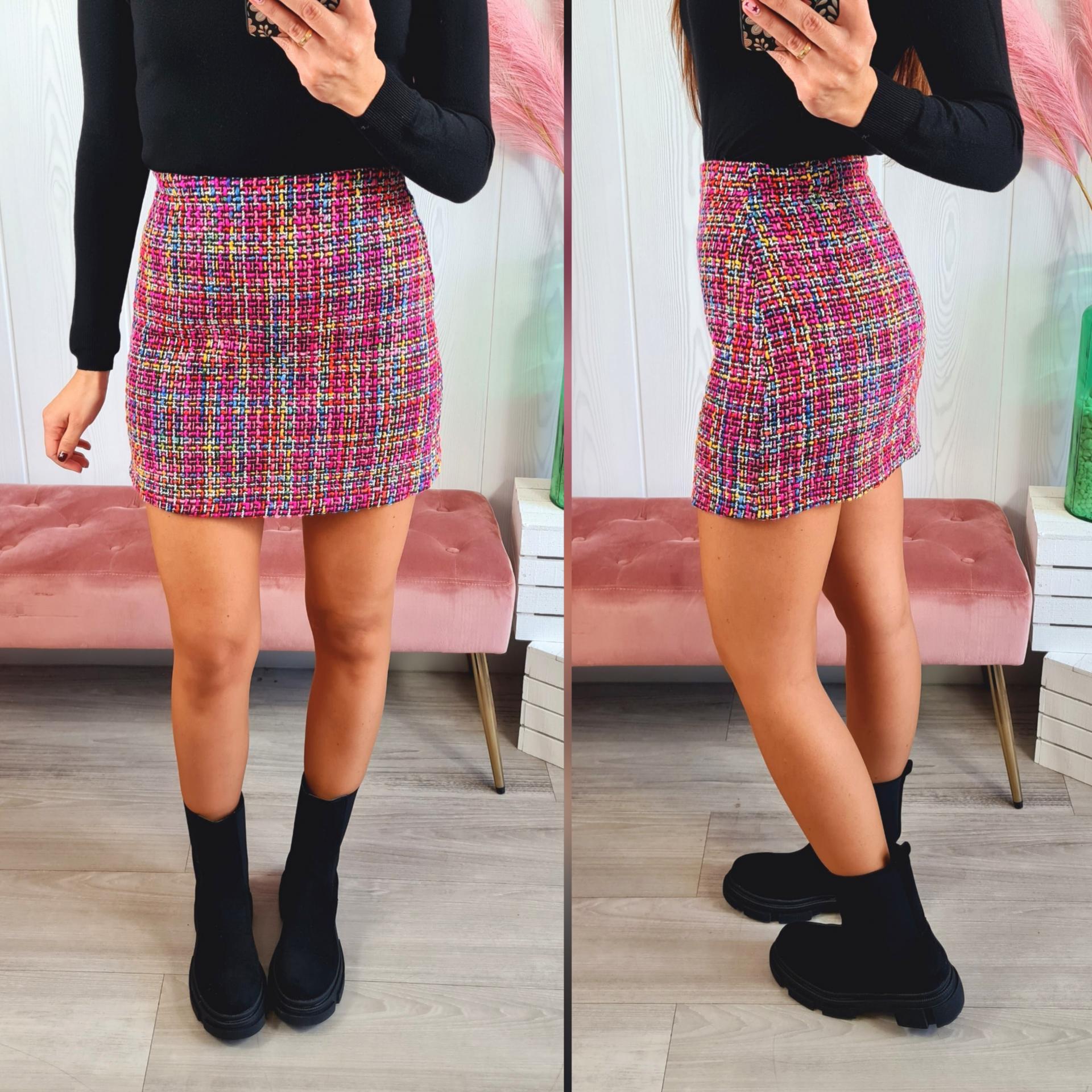 Falda corta en varios colores, tiene cremallera en la parte lateral y lleva forro interior.