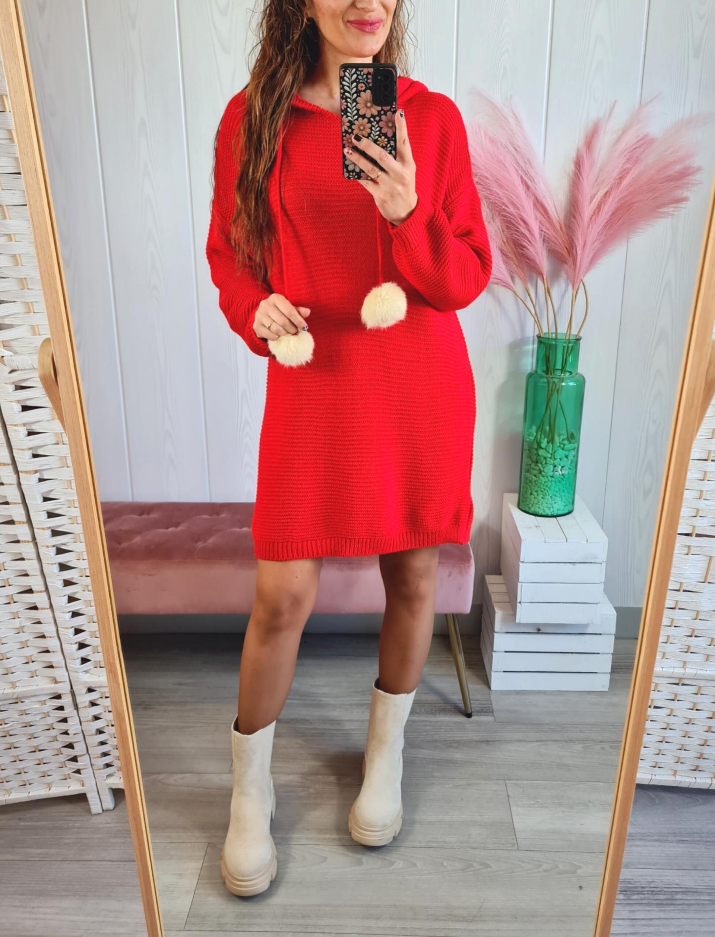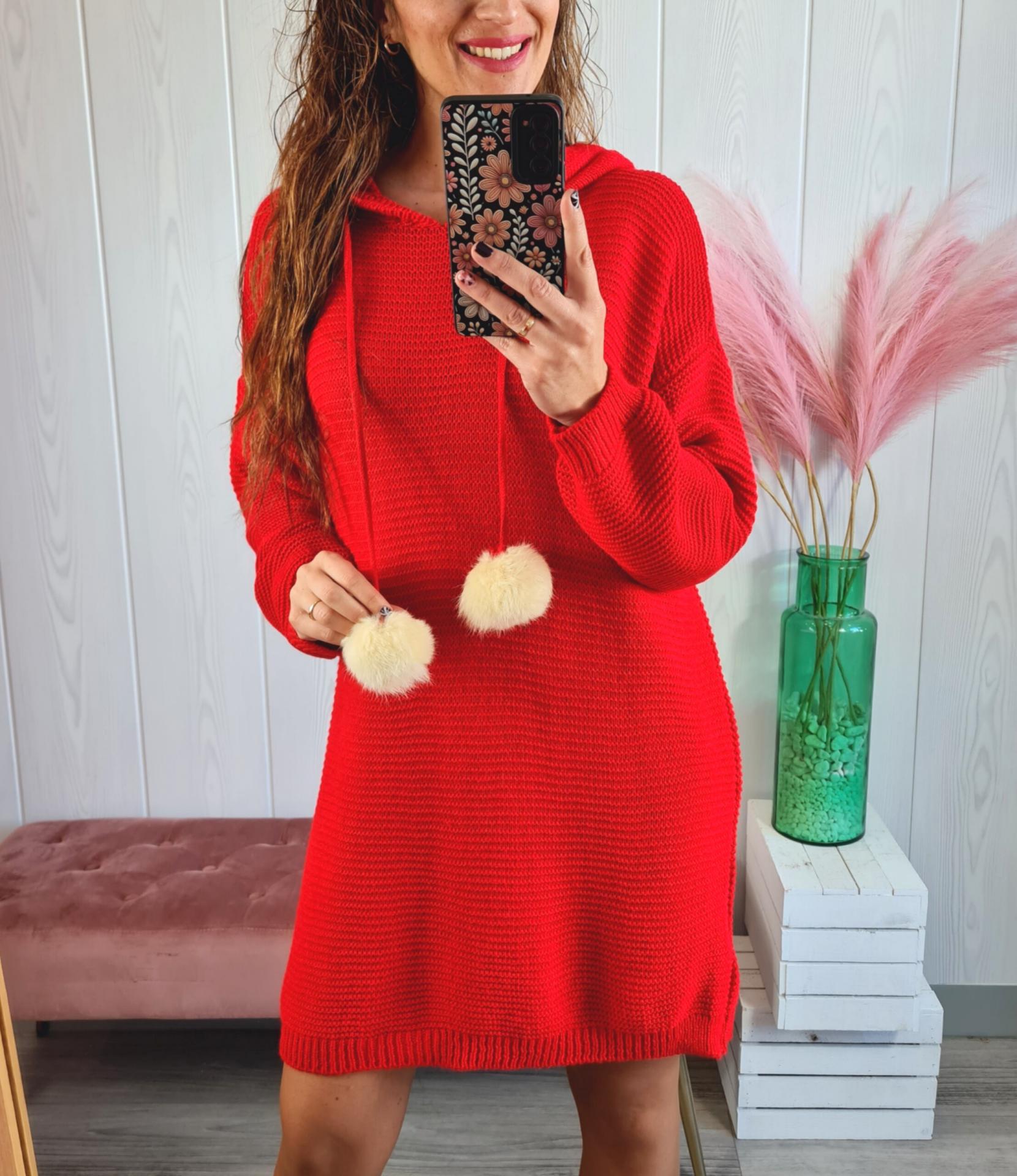 Vestido de punto en color rojo. Tiene el cuello redondo, manga larga, capucha y pompones de adorno.