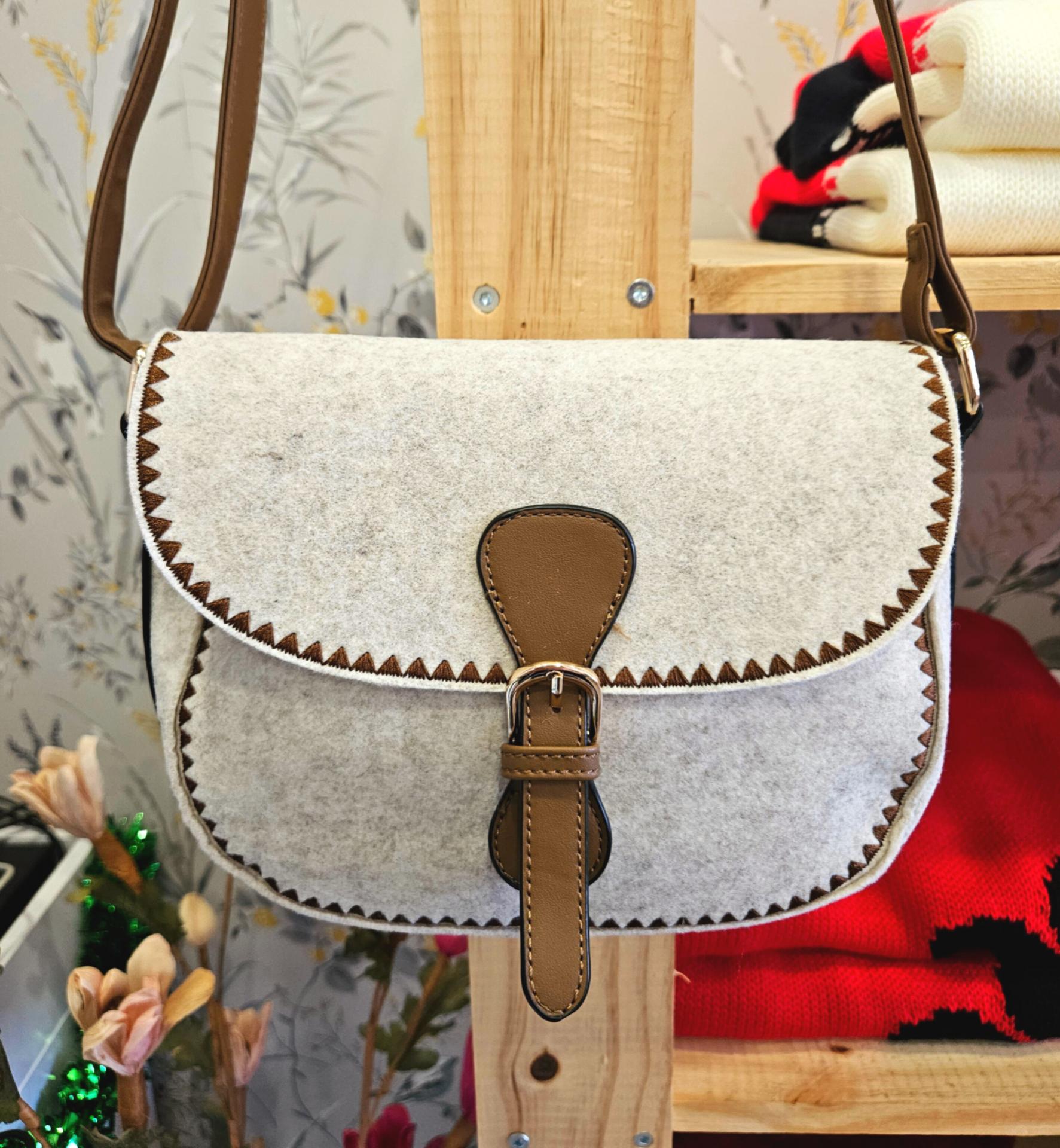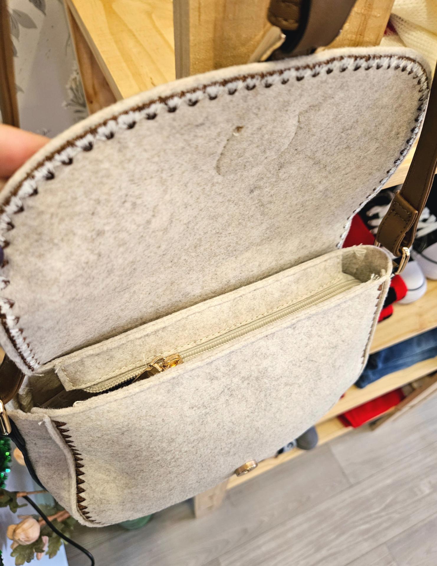 Bandolera en color beige, cierre con cremallera y solapa terminada en pespunte marrón y tiene asa ajustable de cuero marrón. Tiene forro interior y bolsillos con cremallera.