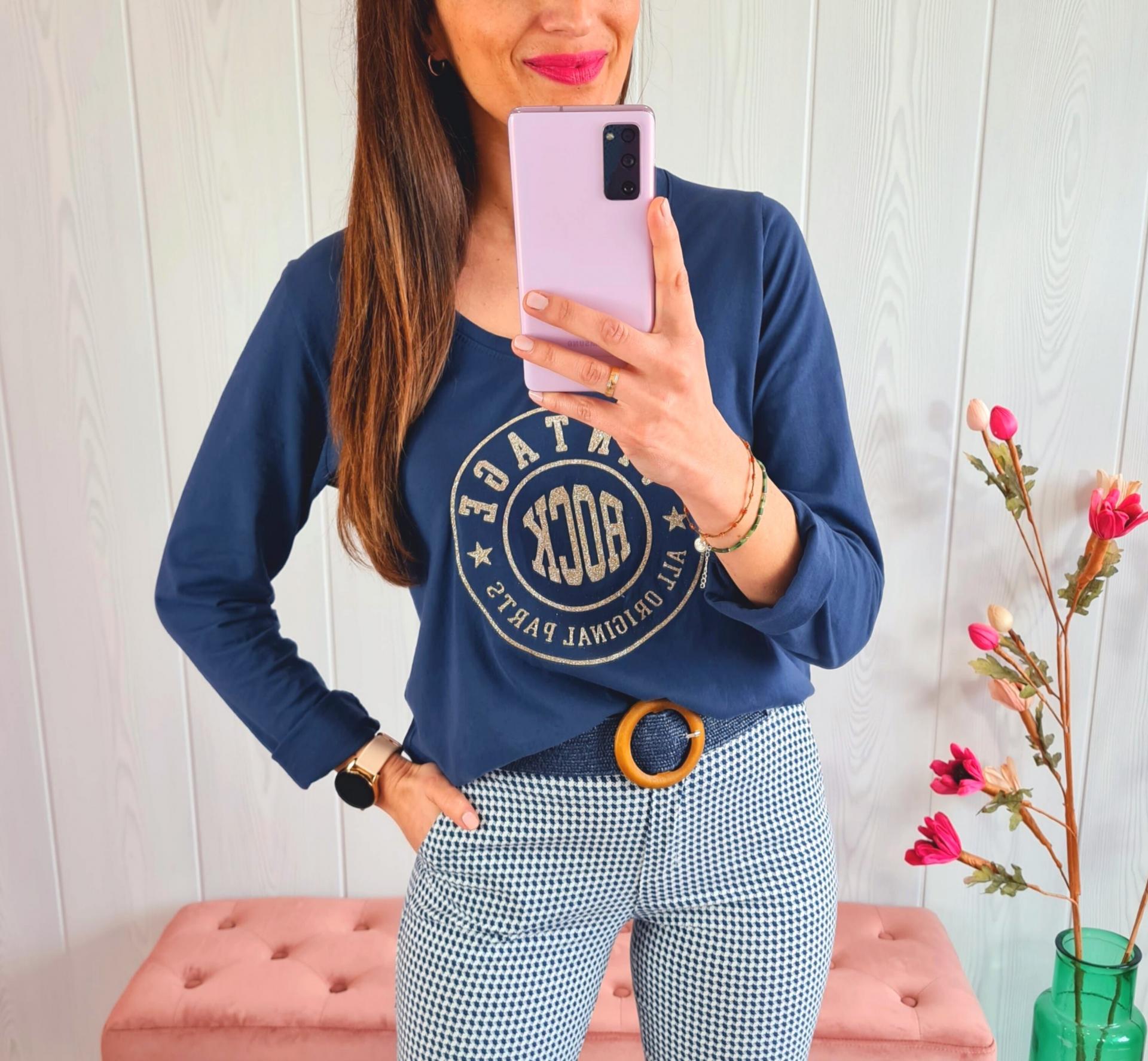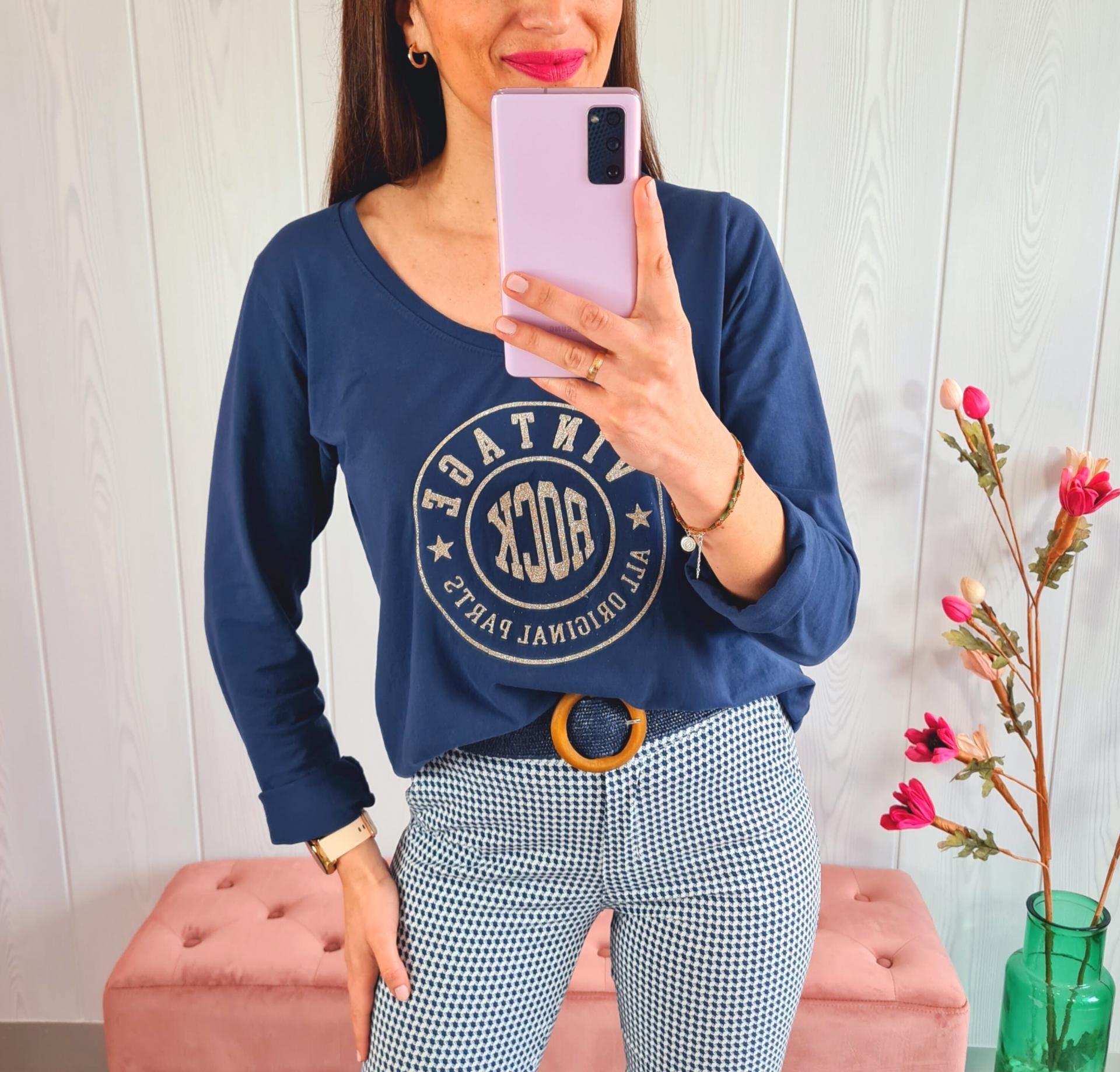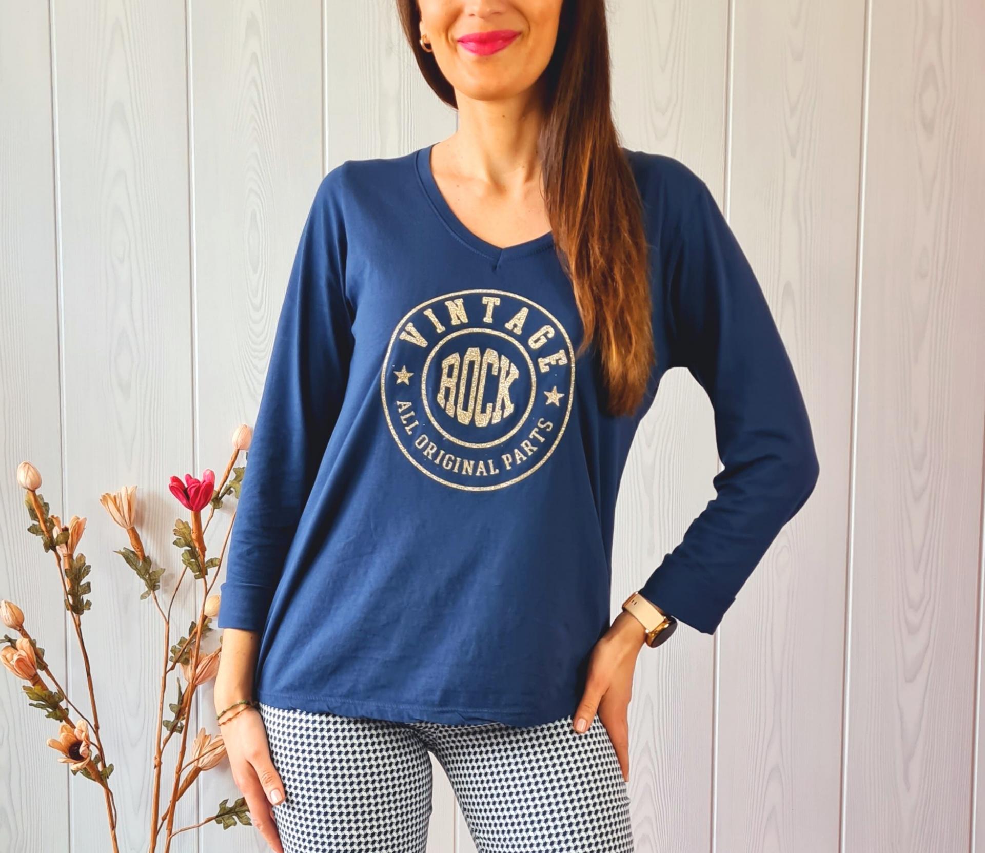 Camiseta de color azul marino con estampado impreso en el pecho en color dorado. Tiene cuello de pico y manga larga.