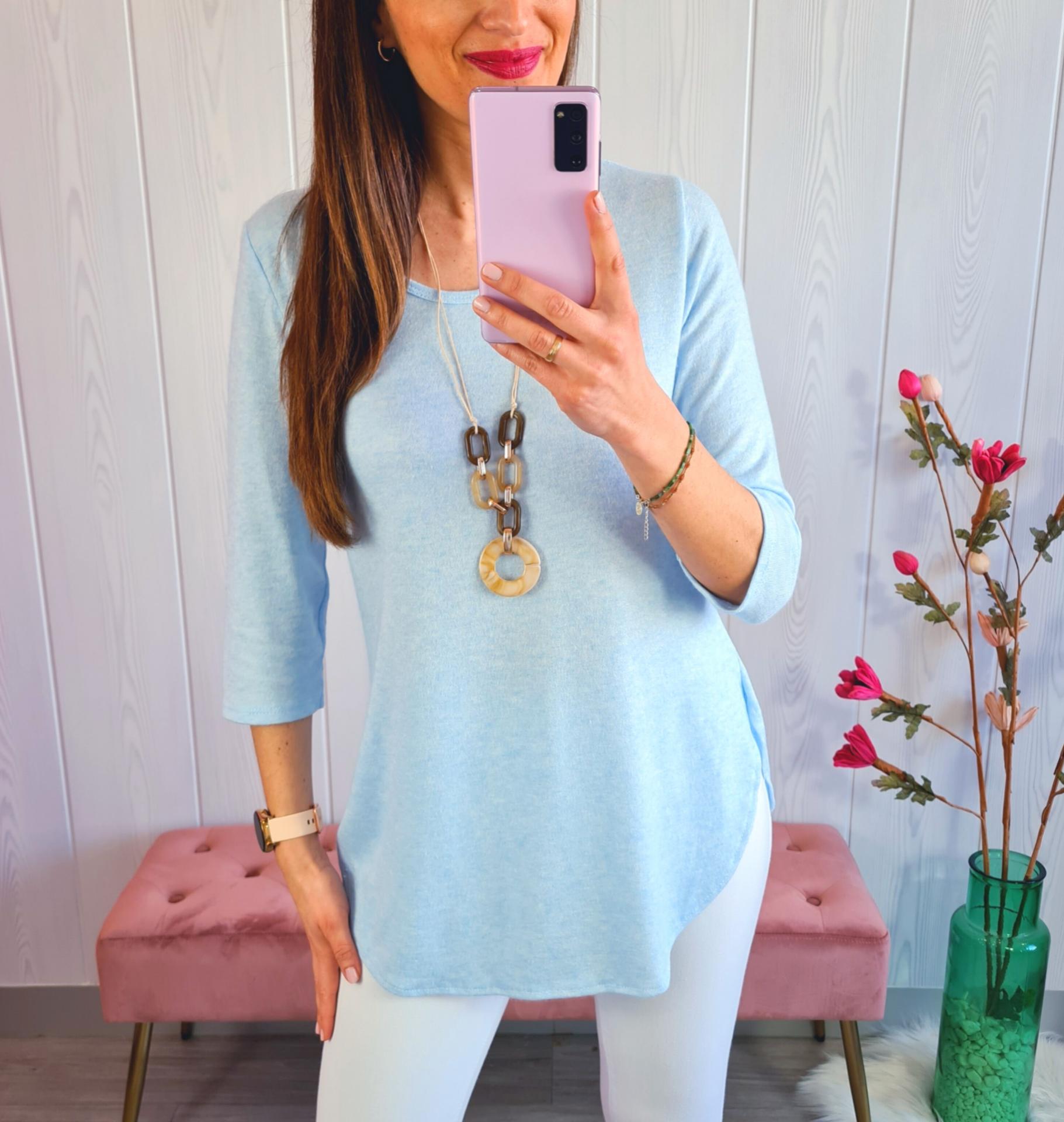 Suéter de color celeste, cuello redondo abierto y manga 3/4. El colgante está incluido.