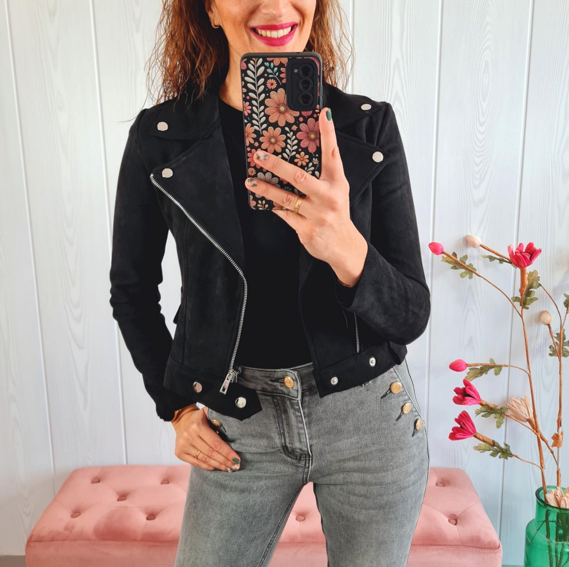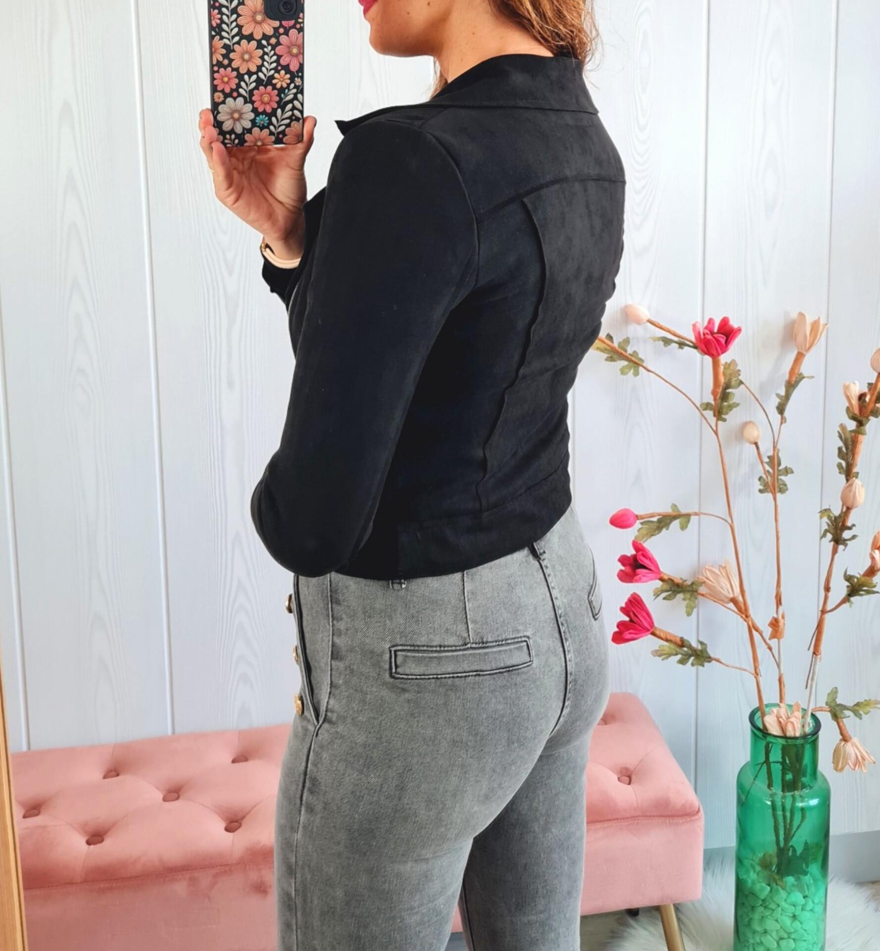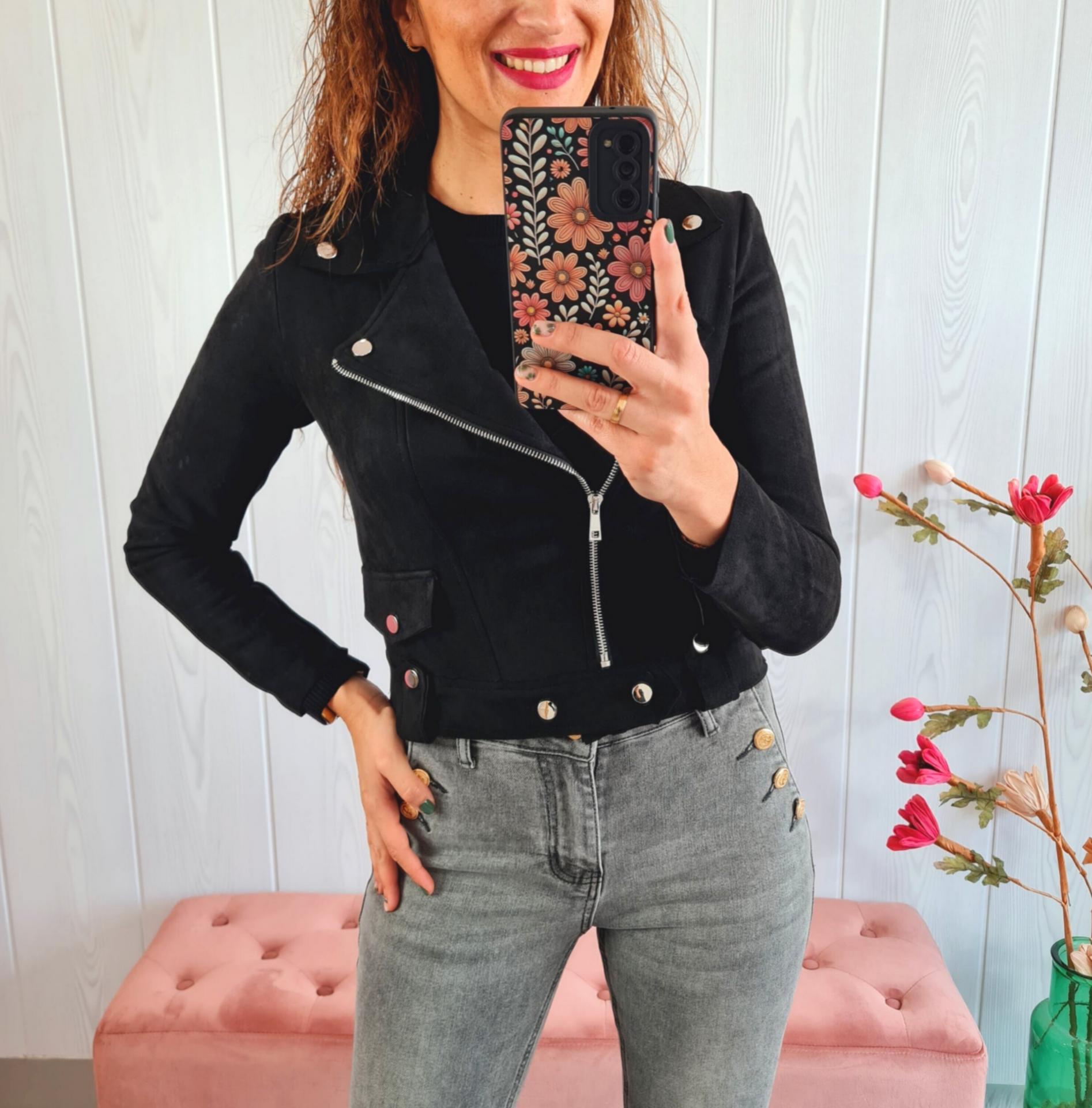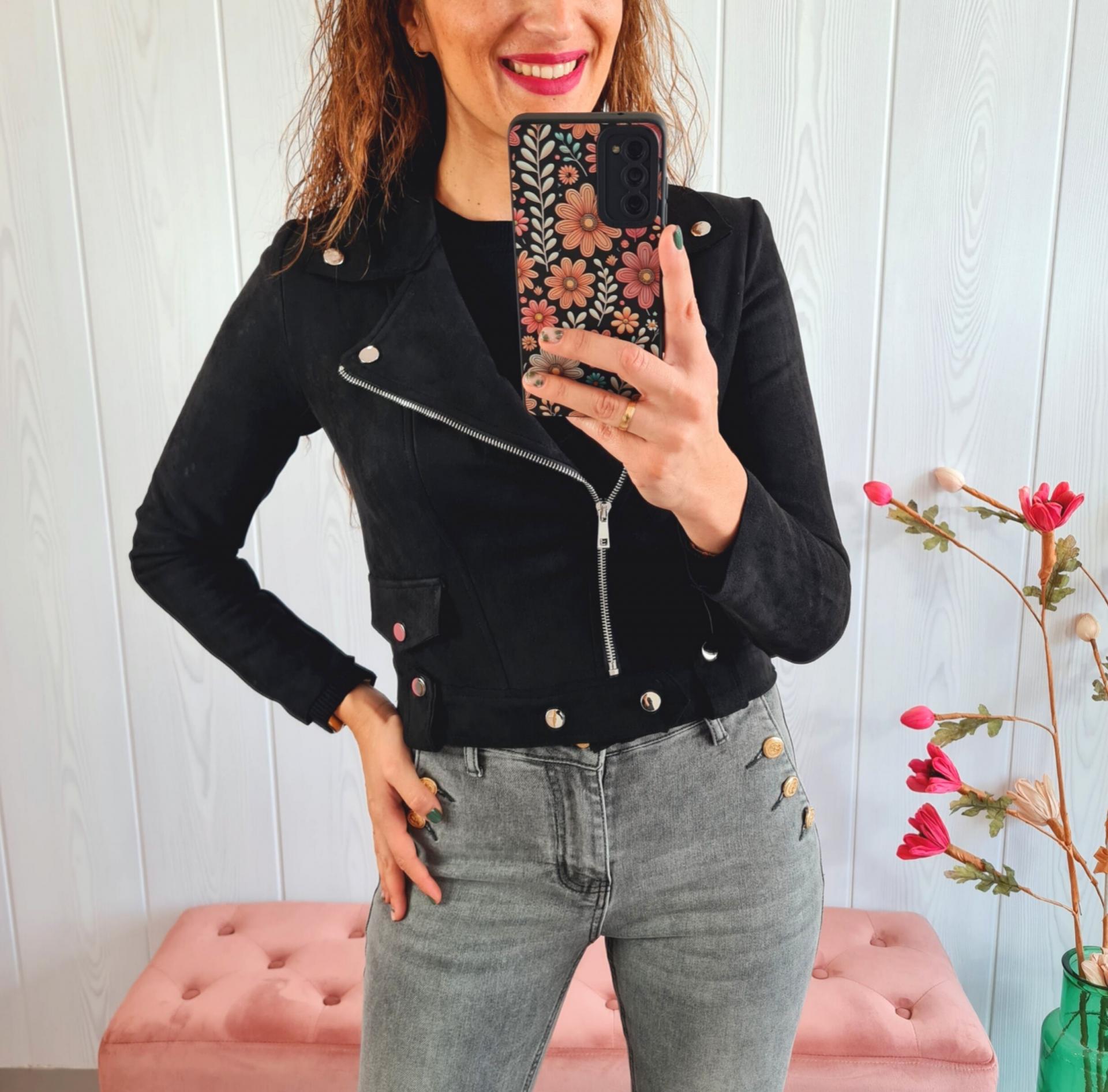 Chaqueta estilo biker en color negro de antelina. Tiene cierre mediante cremallera. No tiene forro interior.