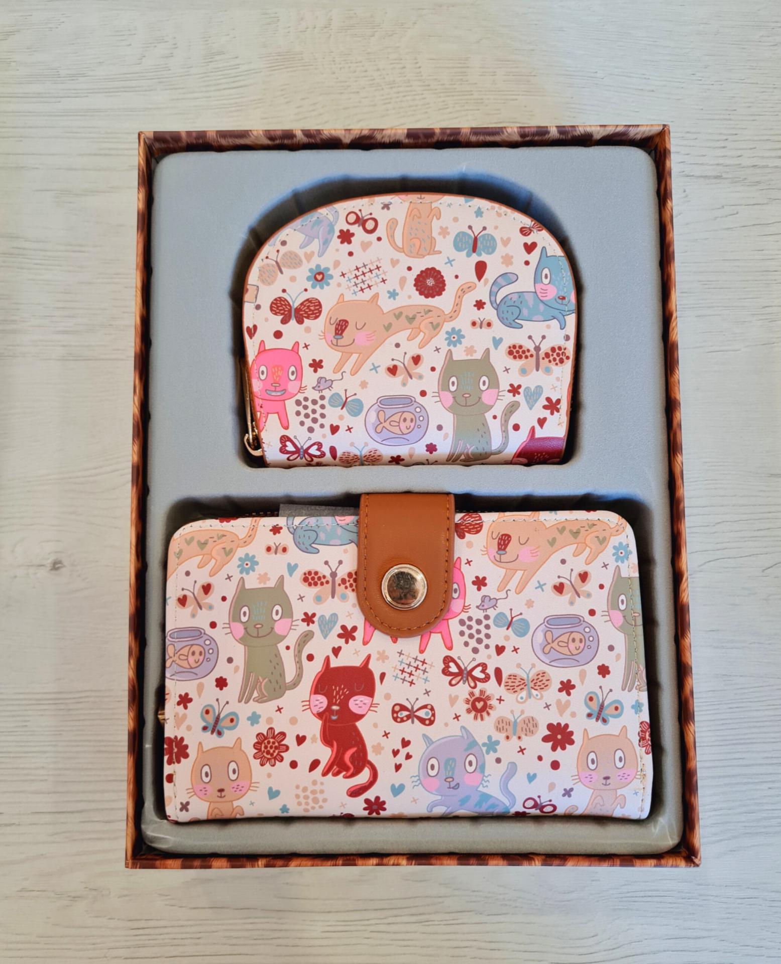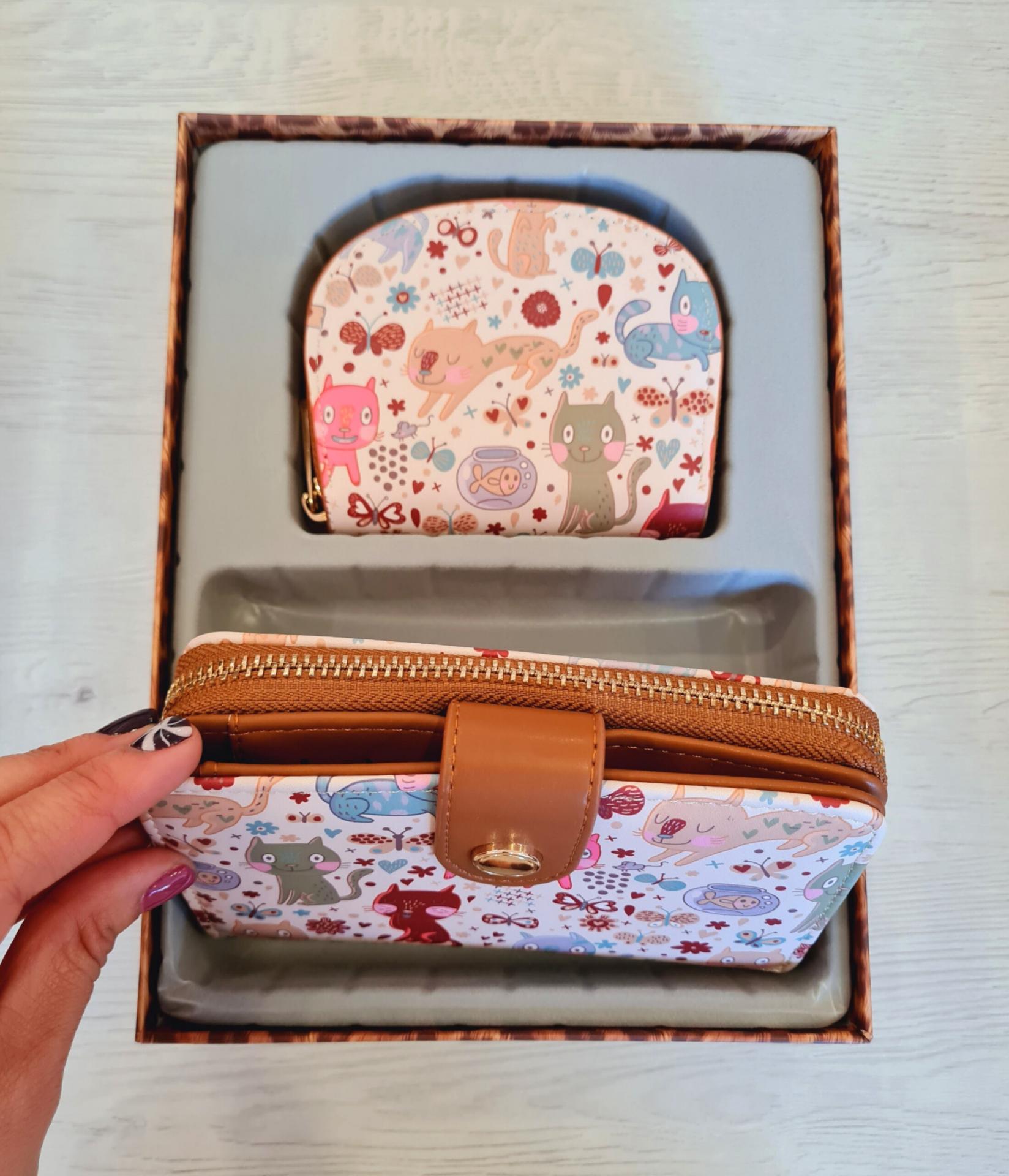 Cajita con conjunto de cartera y monedero con estampado de gatitos, ideal para regalo.