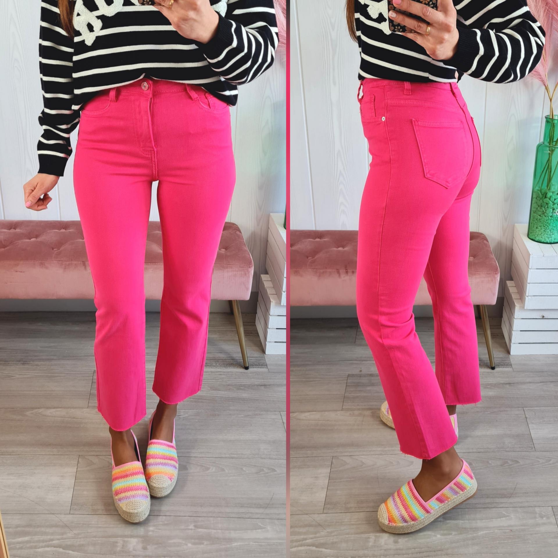 Pantalón vaquero de estilo flare pesqueros en color fucsia. Tiene cierre con botón y cremallera y bajo desflecado.