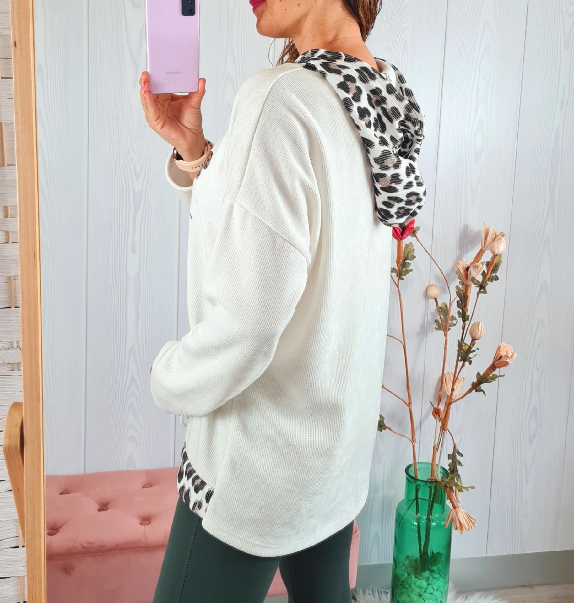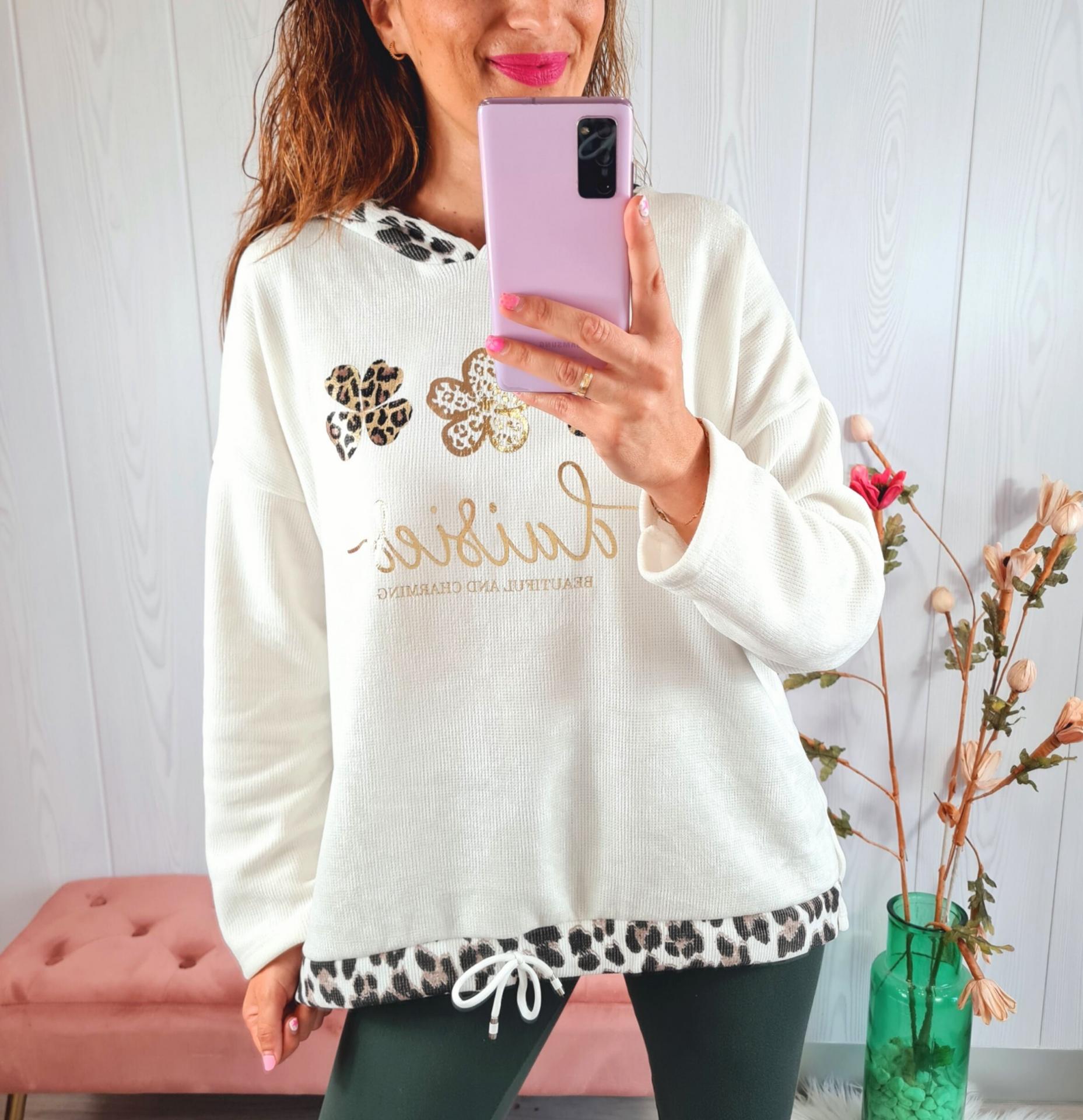 Sudadera de color blanca con estampado impreso en el pecho en color plateado, tiene capucha y manga larga. El bajo de la sudadera y la capucha tiene estampado print.