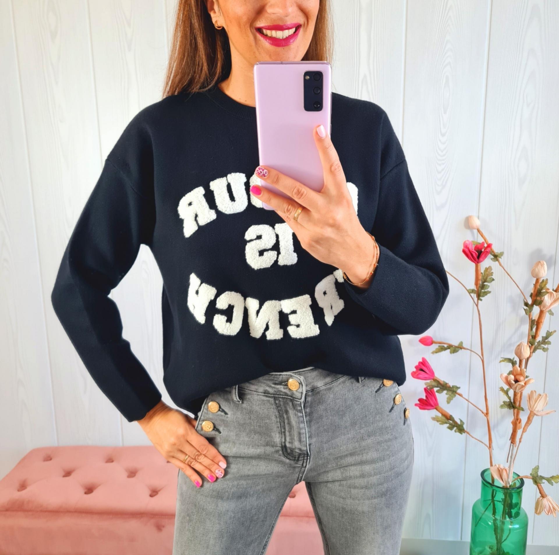 Jersey en color negro con letras relieve en el pecho en color blanco. Tiene cuello redondo y manga larga.