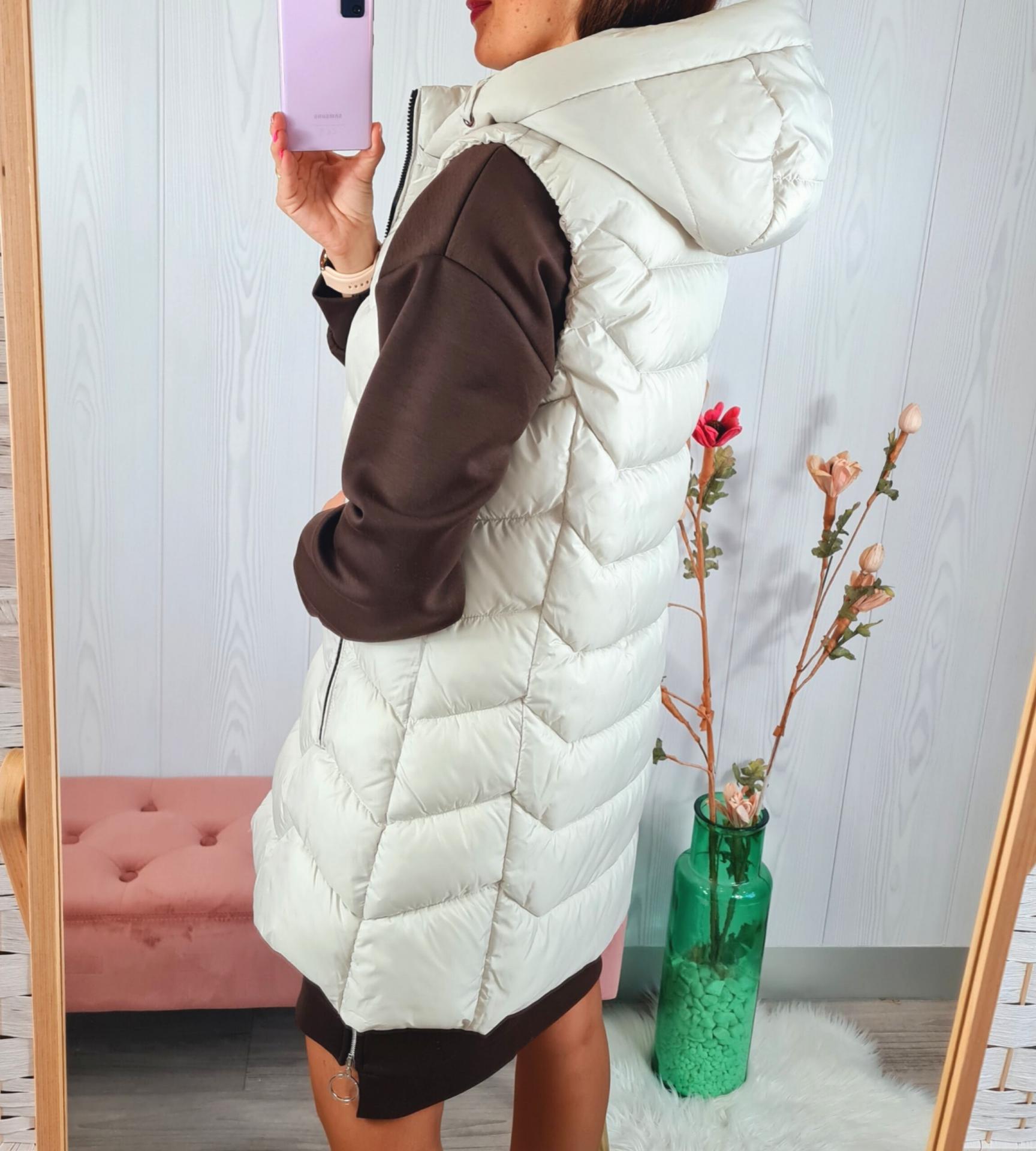 Chaleco largo acolchado en color beige, tiene cierre con cremallera, capucha y bolsillos laterales.