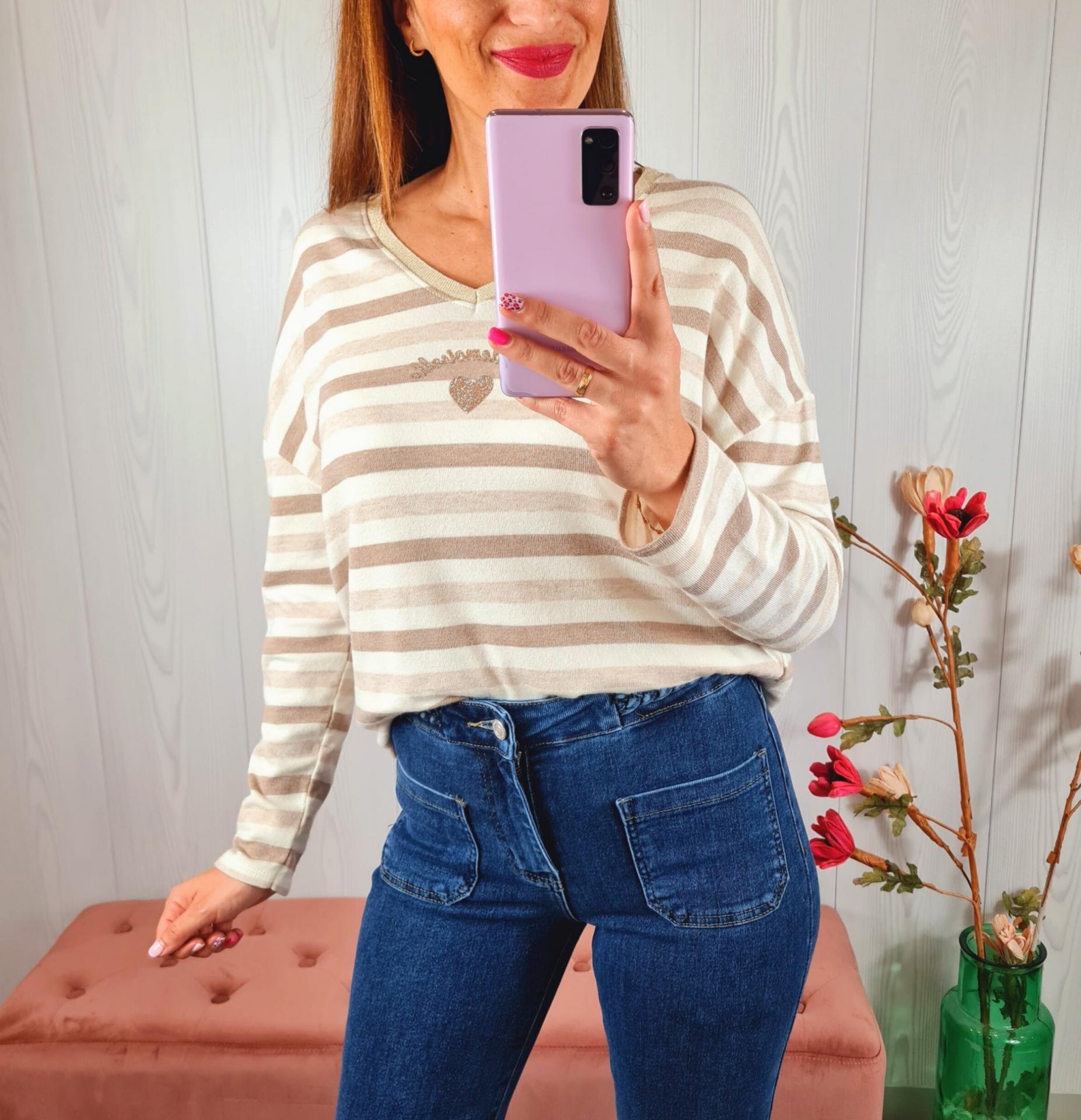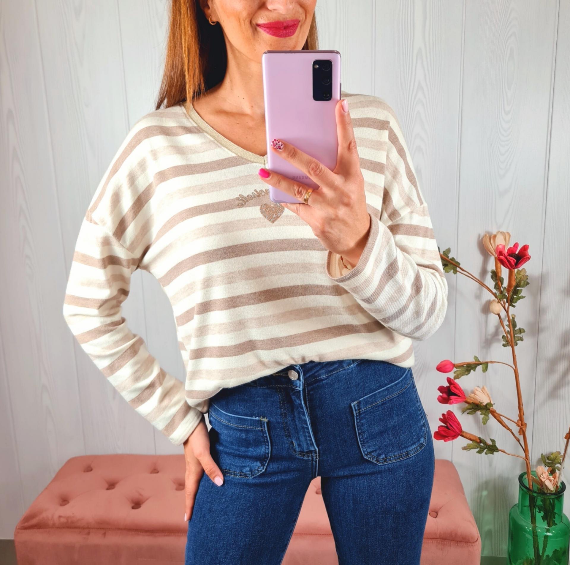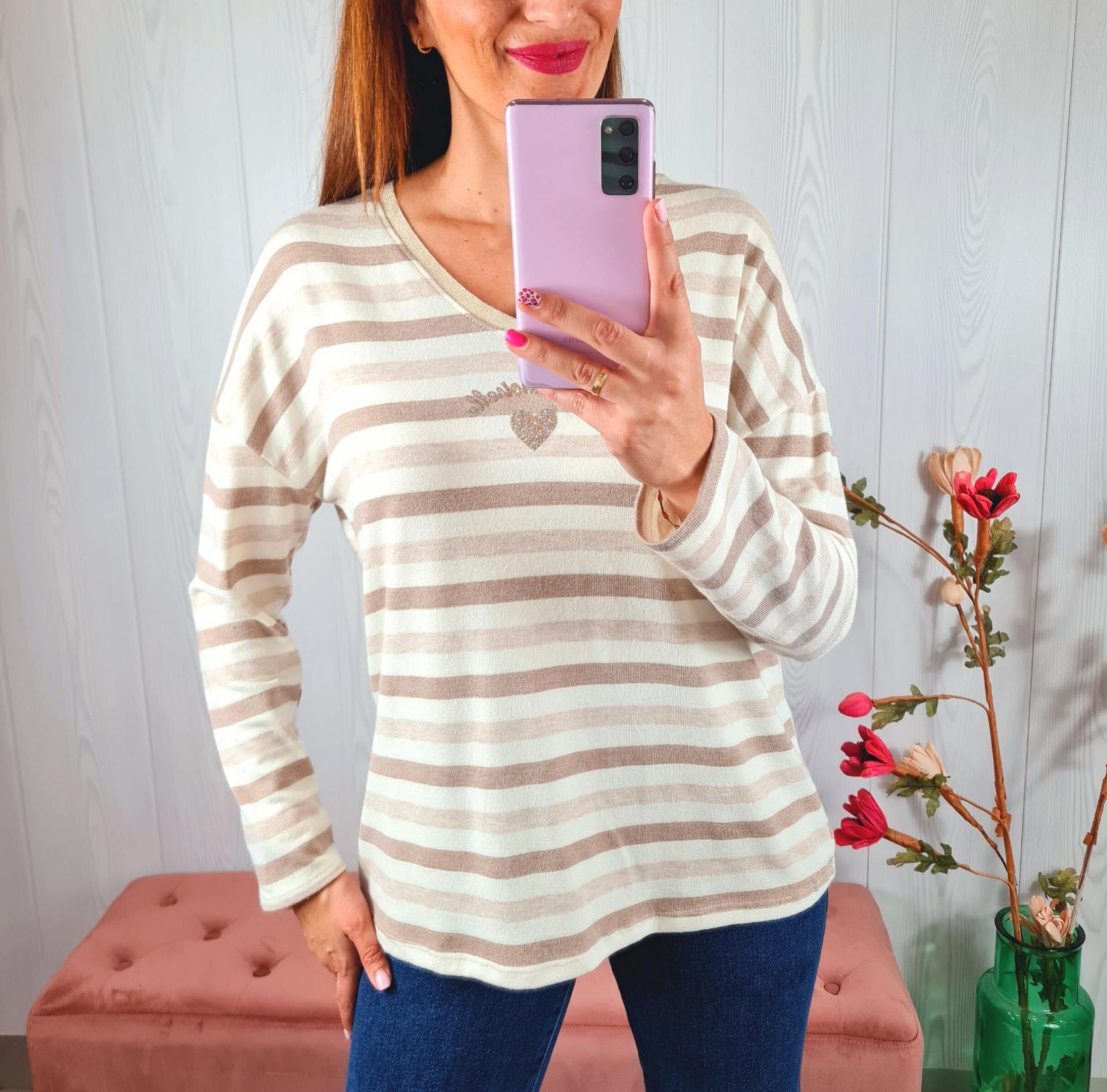 Suéter de rayas en tonos beige con estampado impreso en el pecho. Tiene cuello de pico y manga larga.