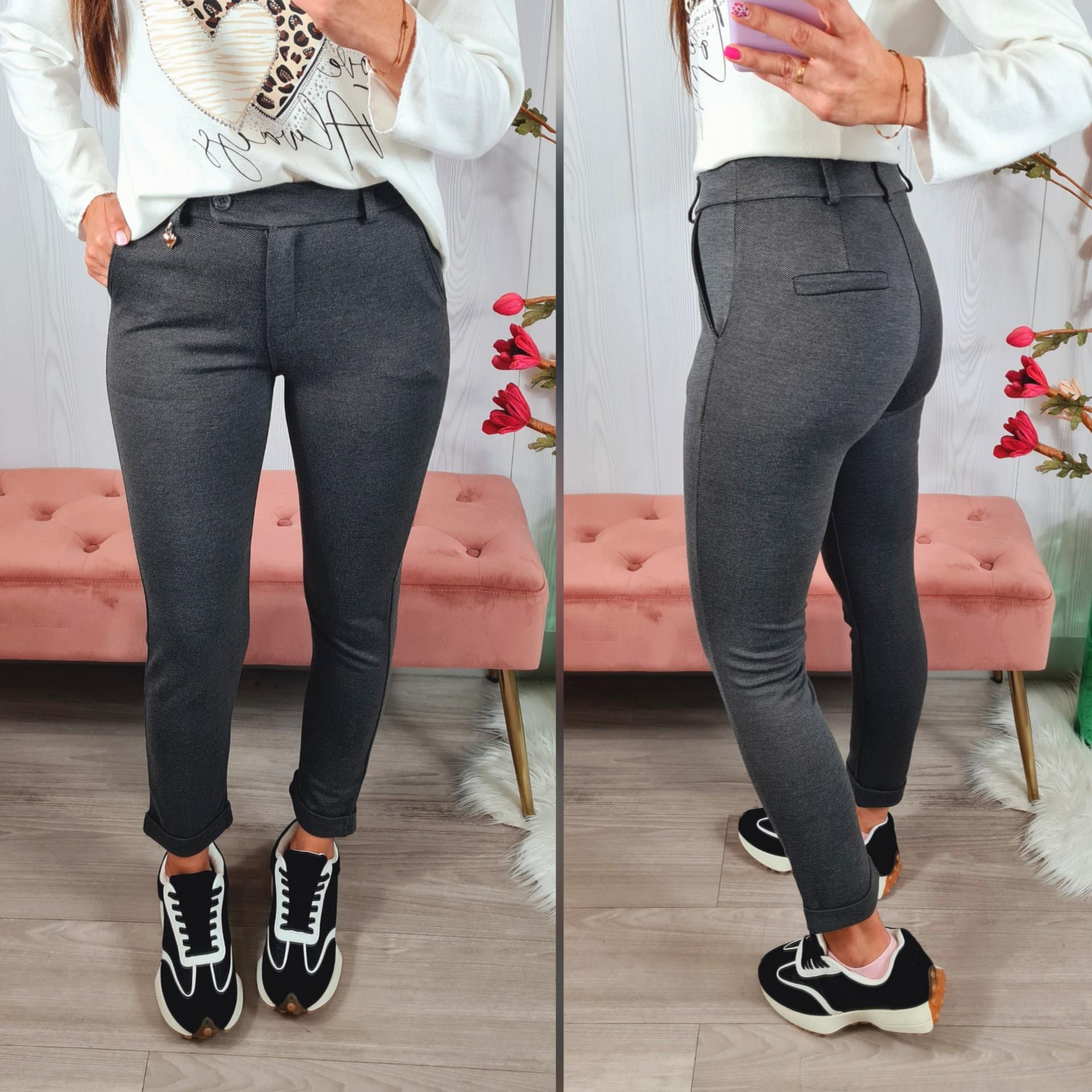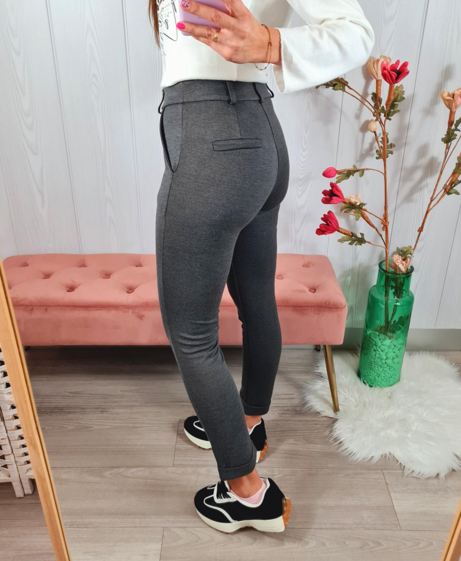 Pantalones skinny de color gris. Tienen bolsillos laterales de chino y cierre con botón y cremallera.
