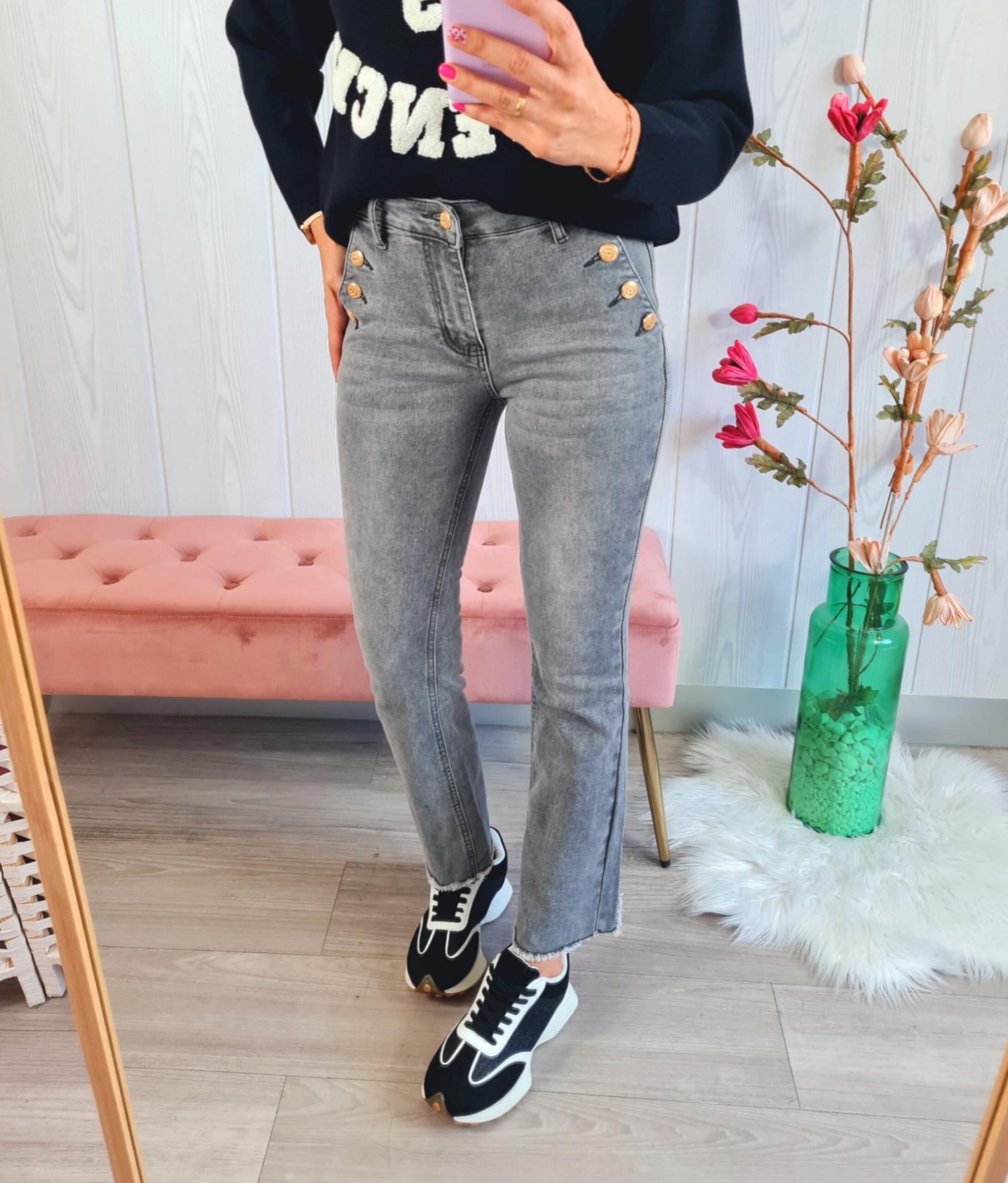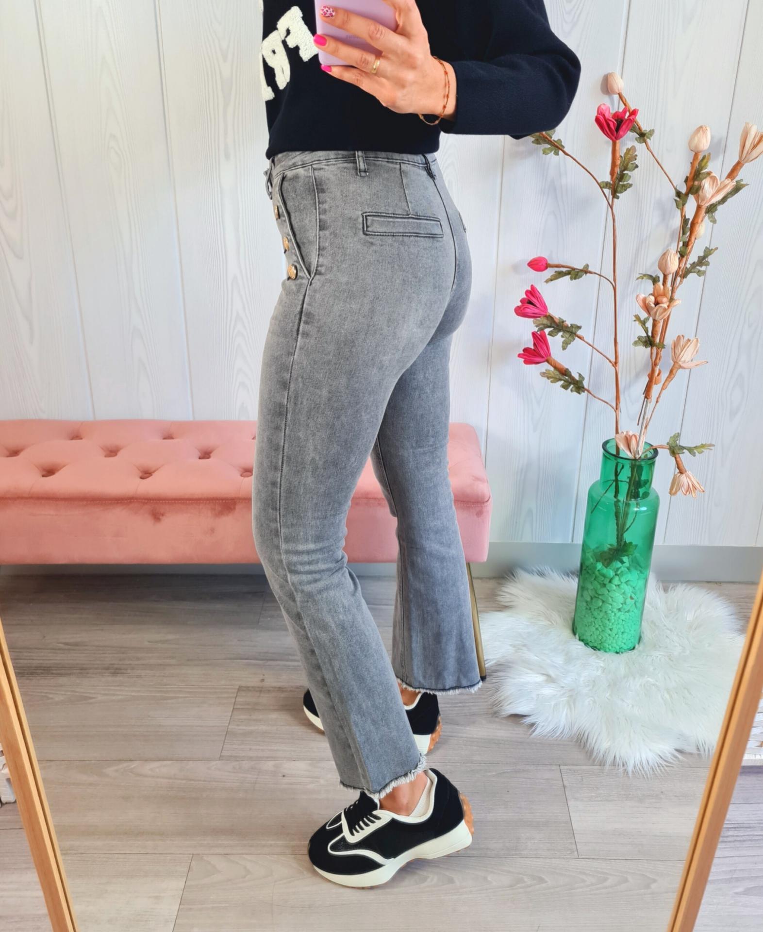 Pantalón vaquero de color gris con botones dorados en los laterales. Tiene cierre con botón y cremallera y bajo desflecado.