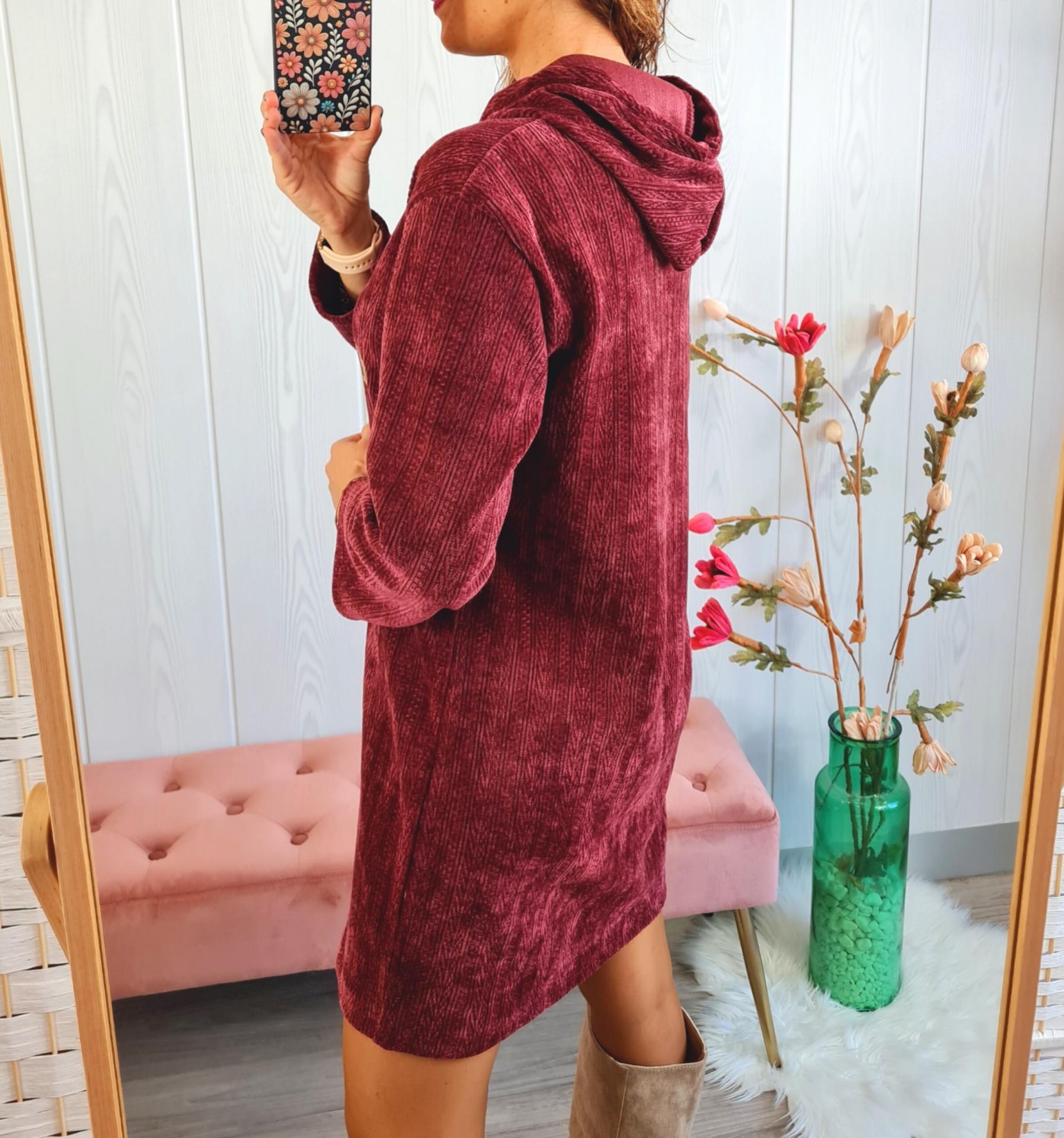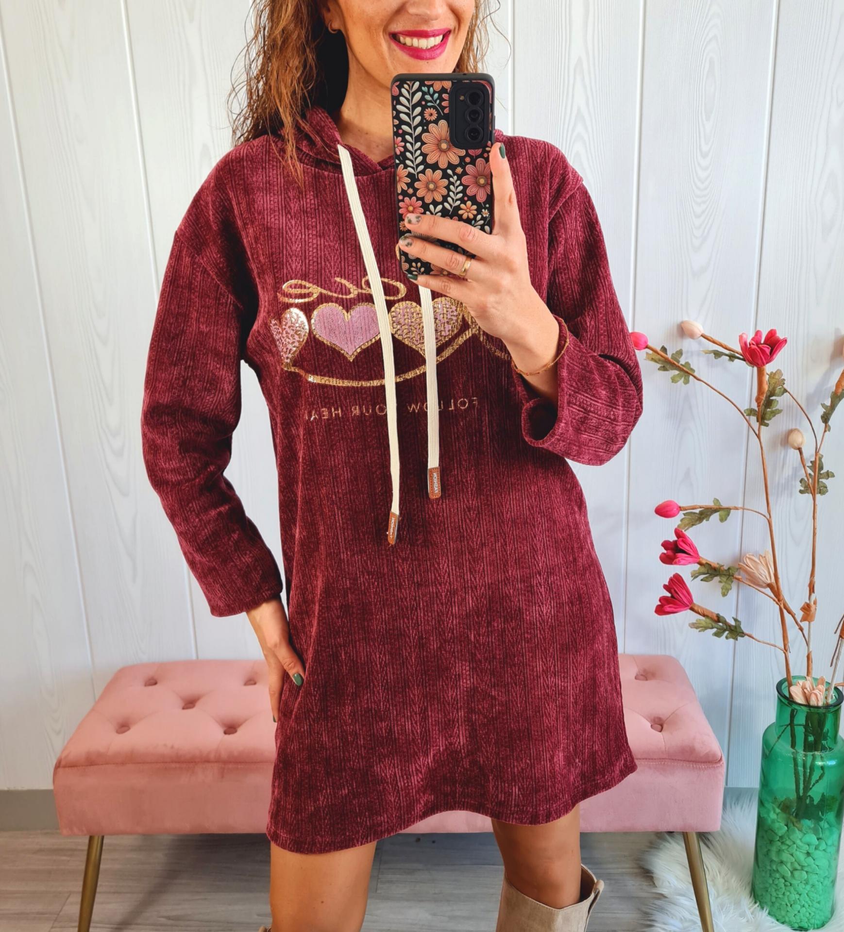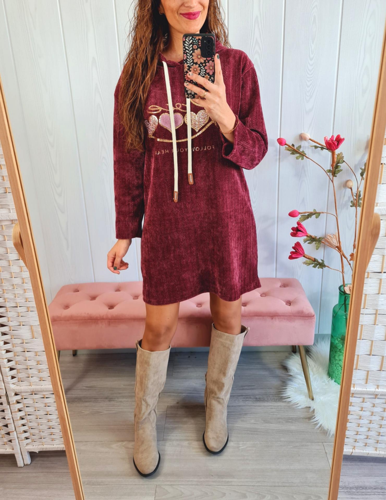 Vestido de color granate, en tela tipo pana, con capucha, con estampado impreso en el pecho.