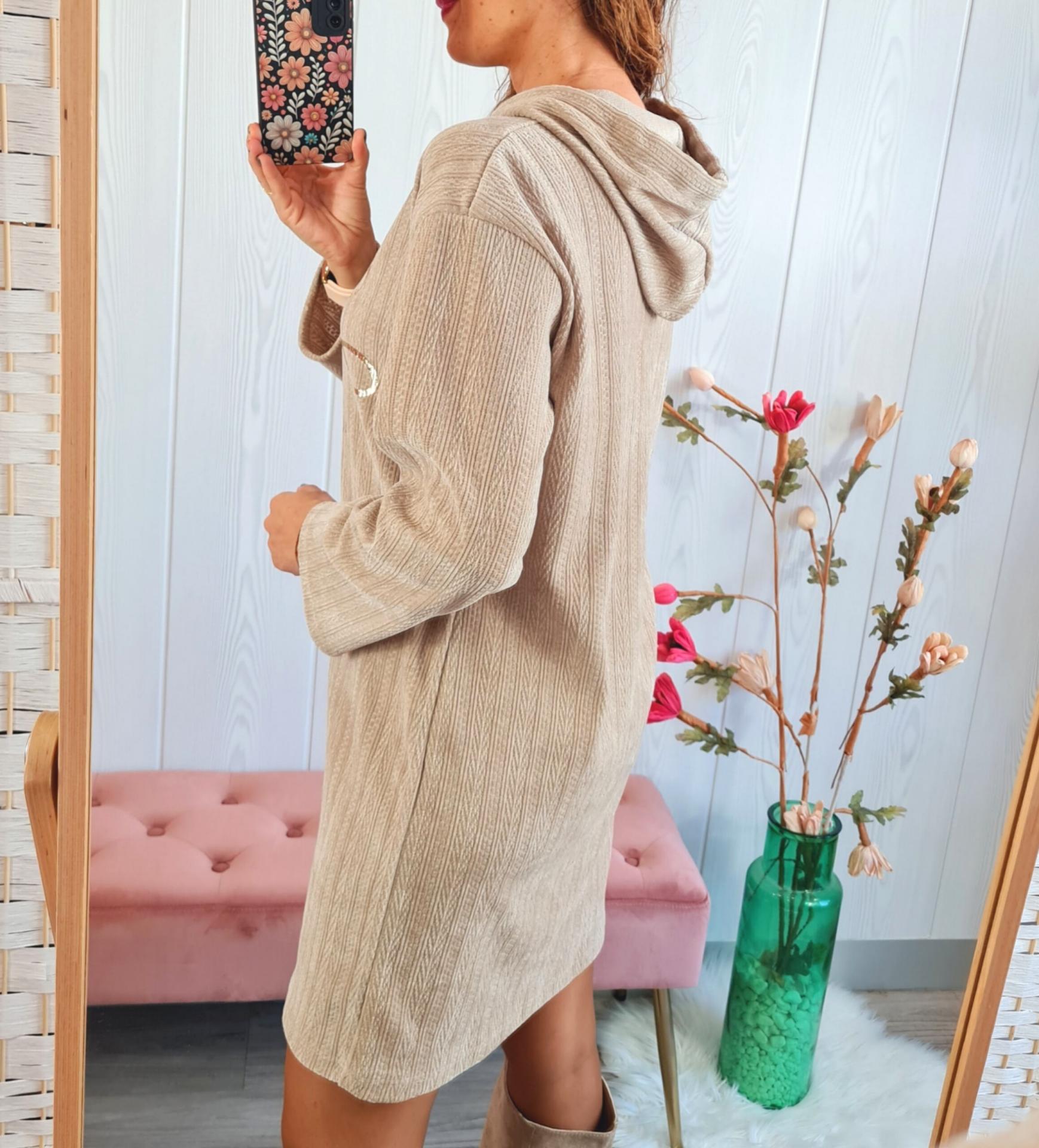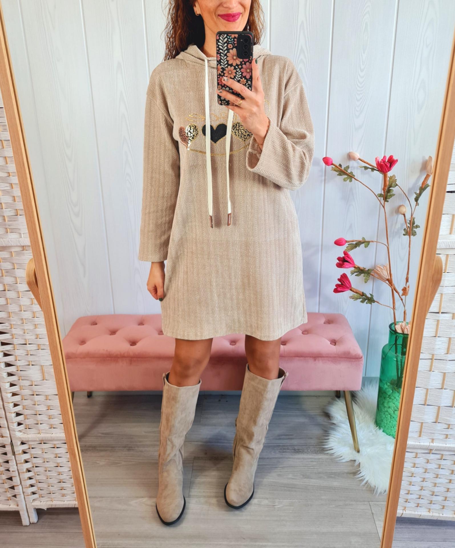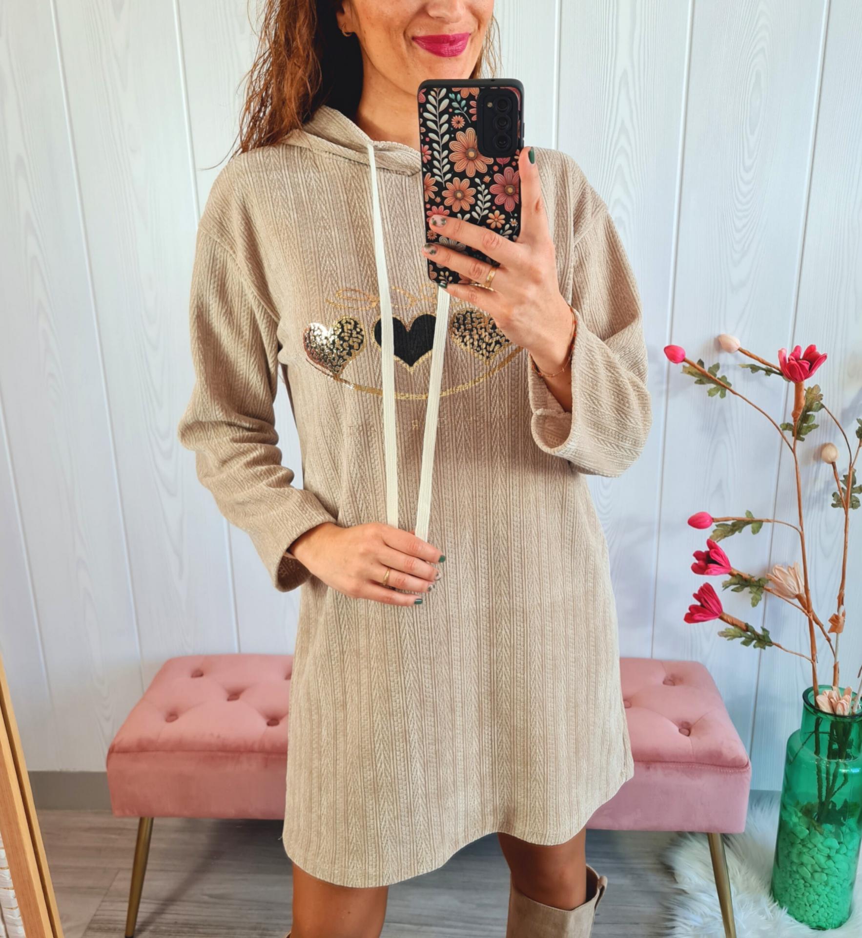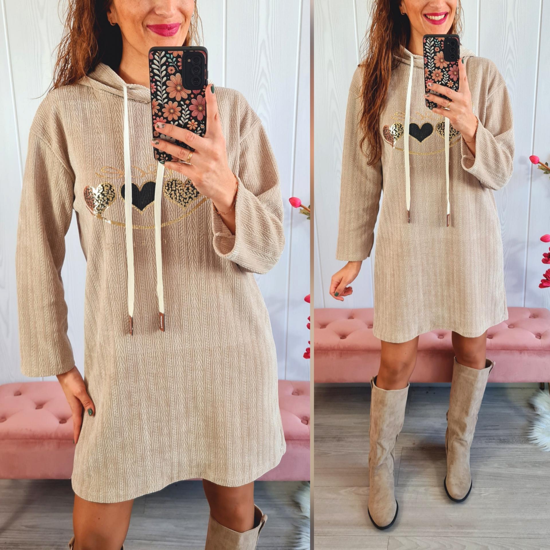 Vestido de color beige, en tela tipo pana, con capucha, con estampado impreso en el pecho.