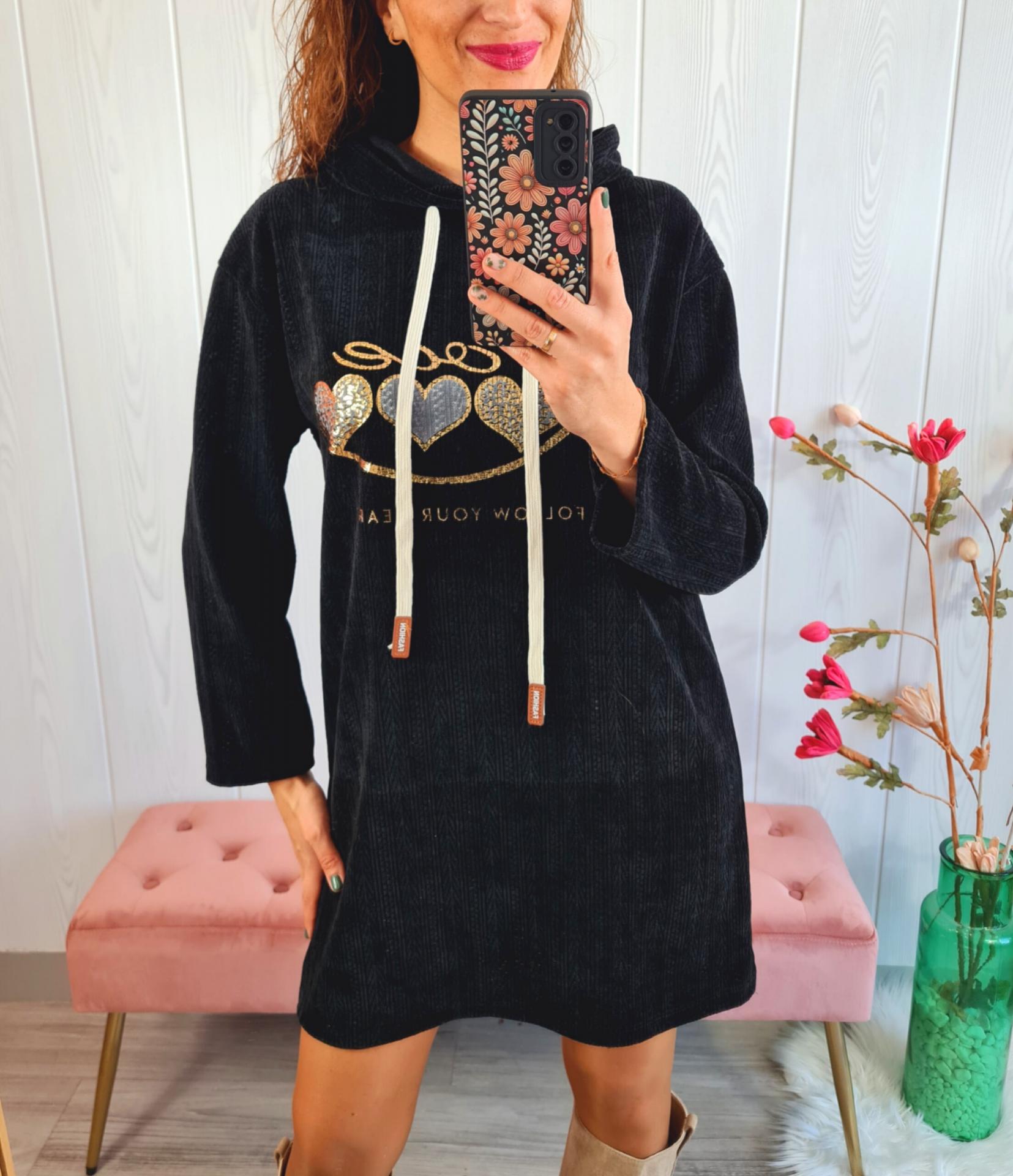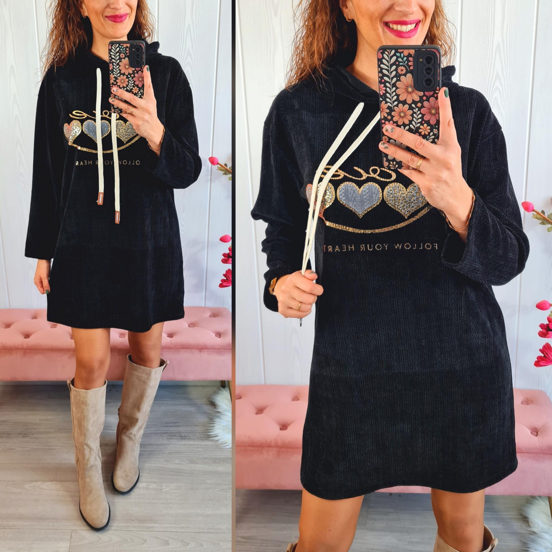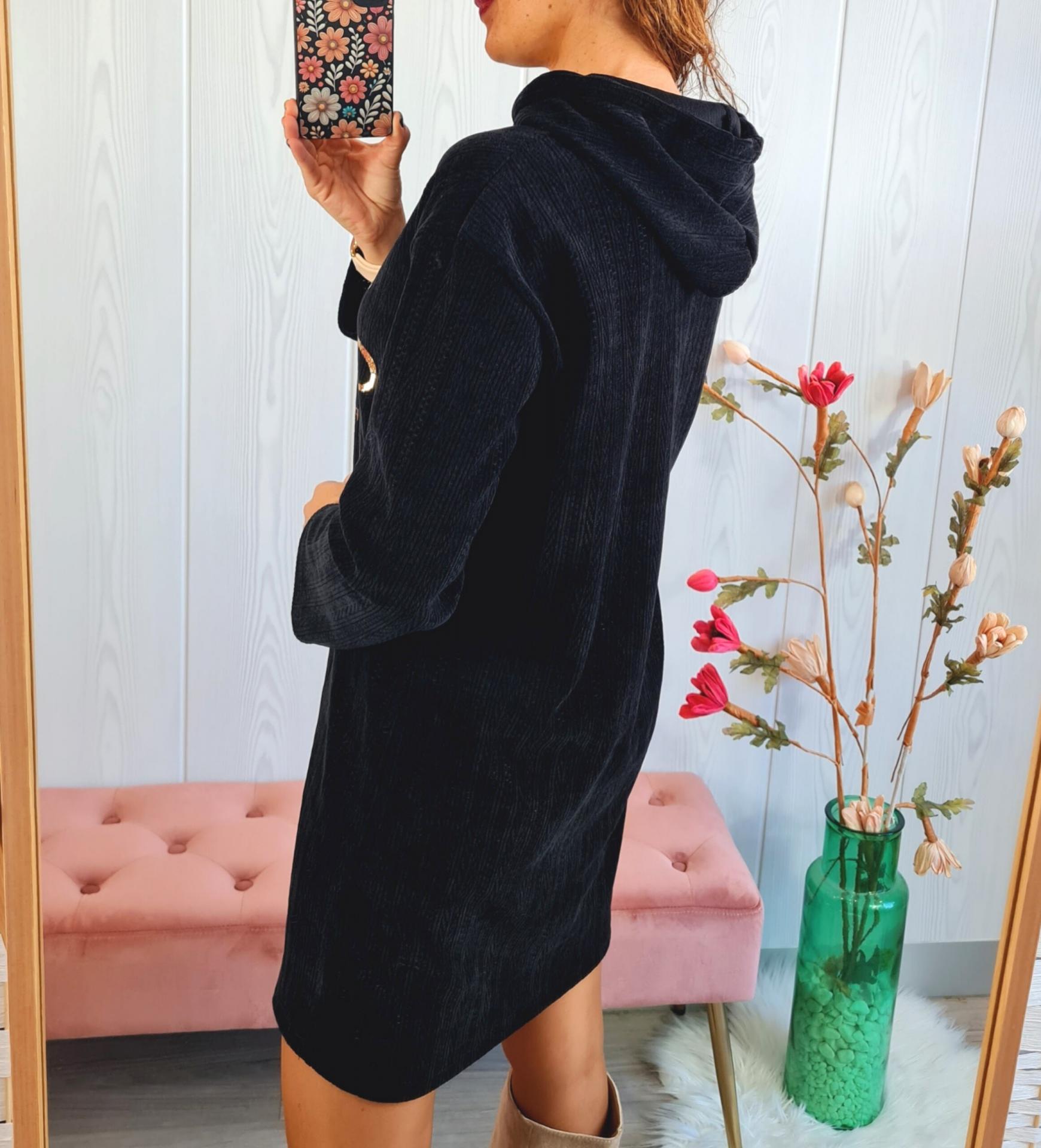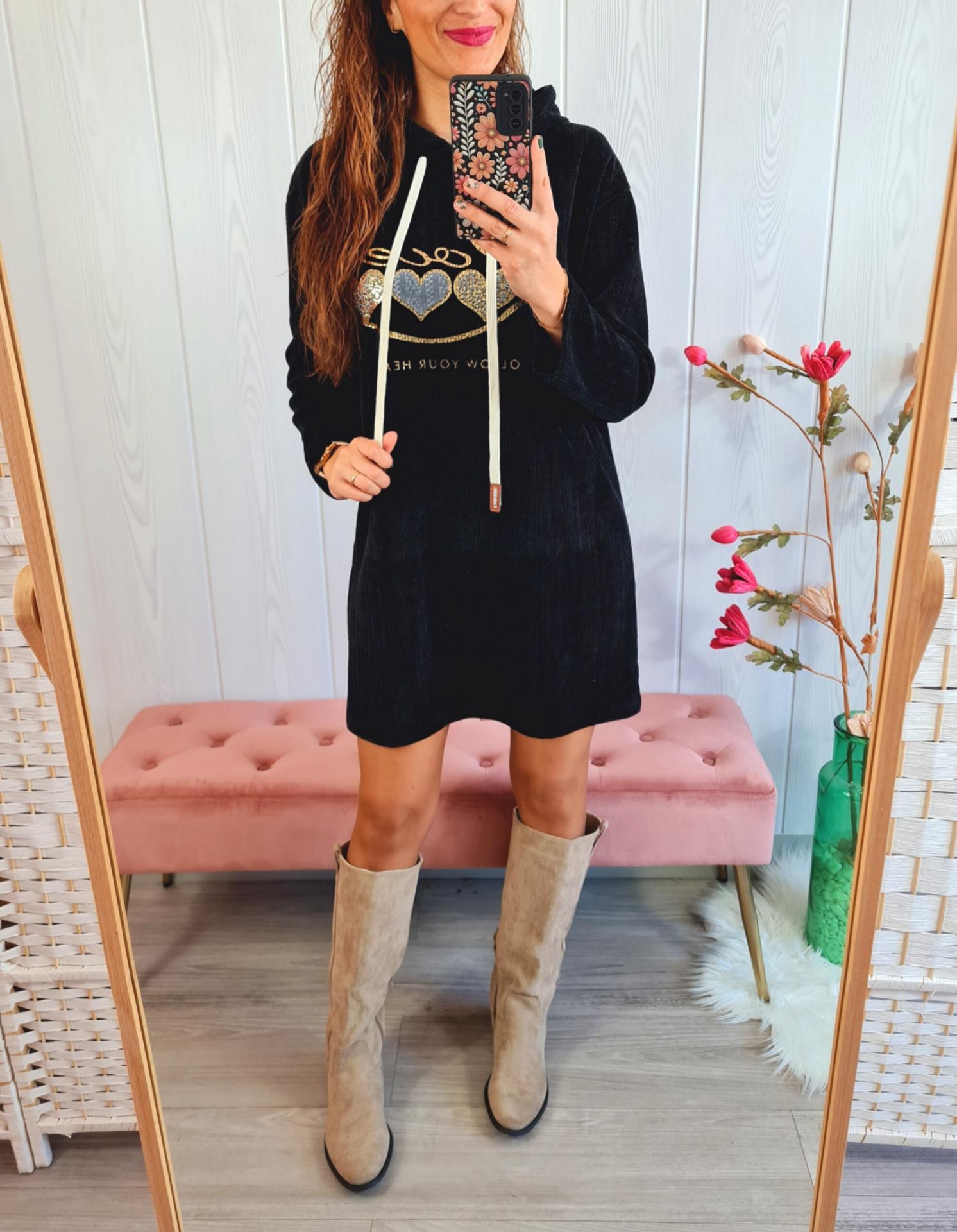 Vestido de color negro, en tela tipo pana, con capucha, con estampado impreso en el pecho.