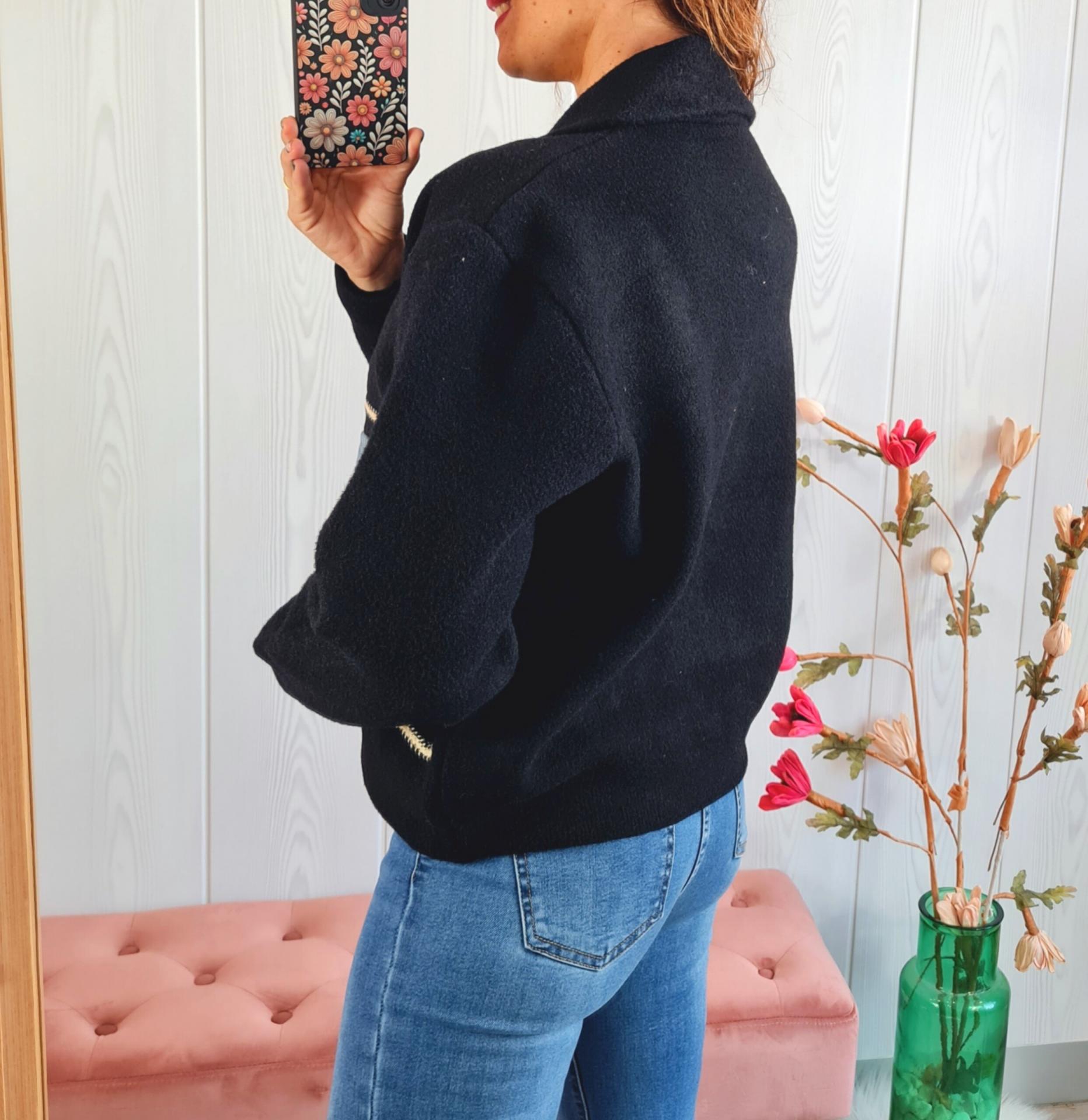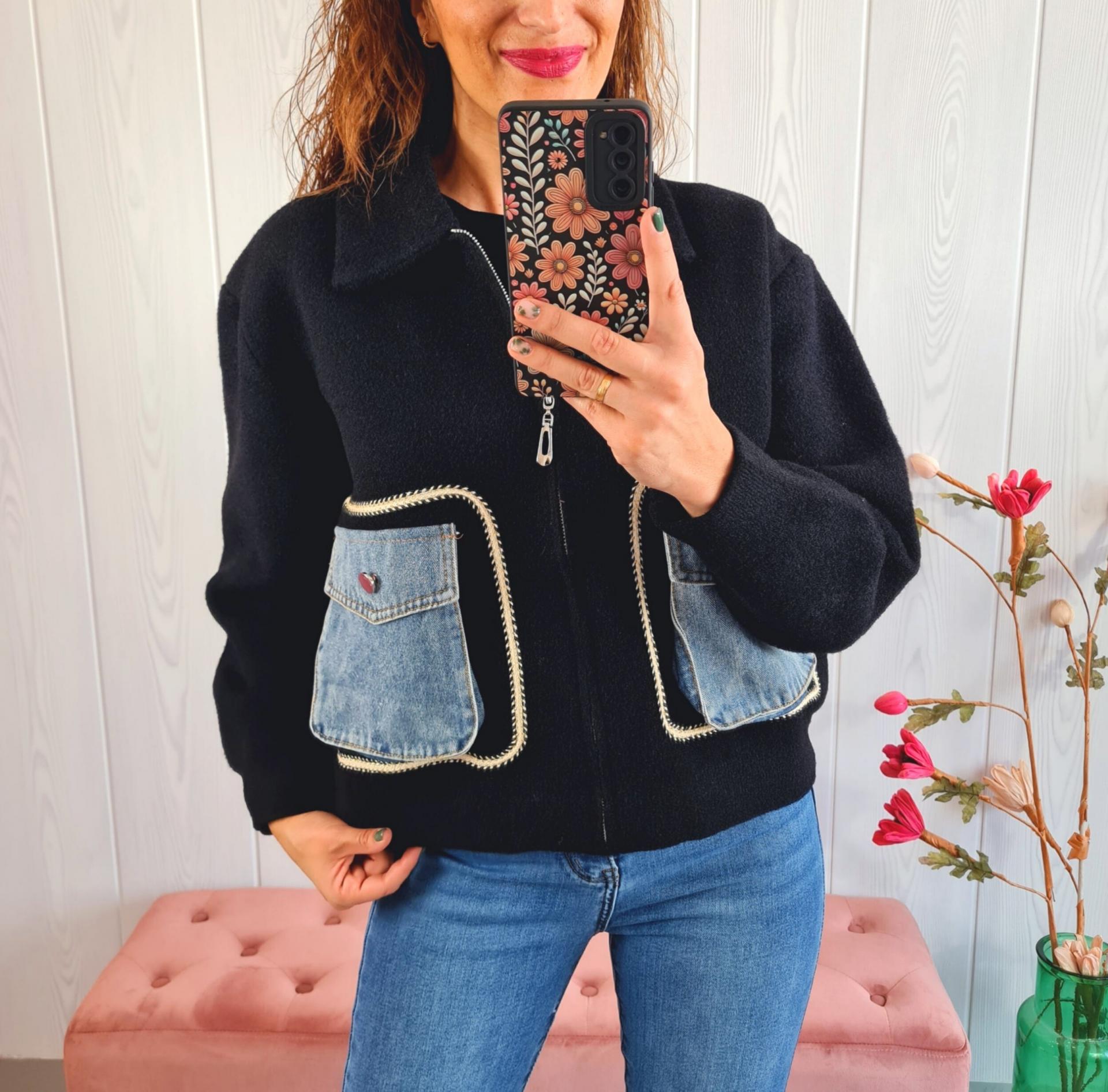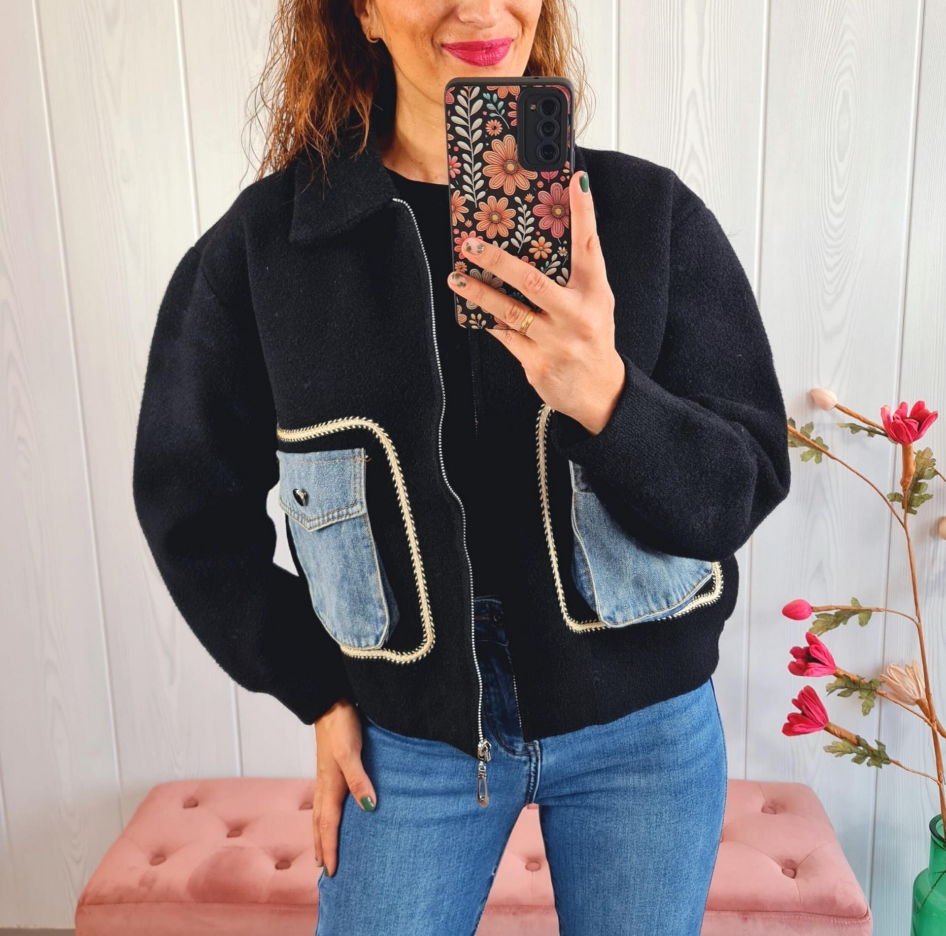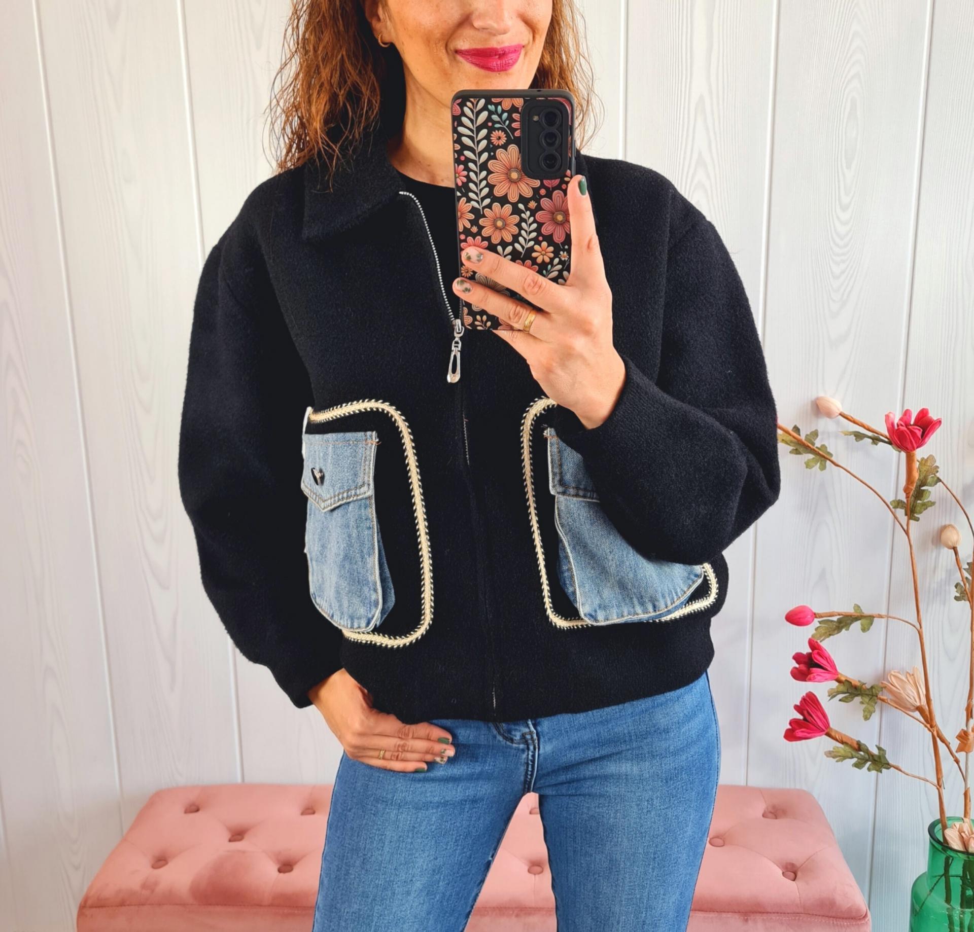 Cazadora de color negro, con bolsillos superpuestos en color vaquero y cierre con cremallera
