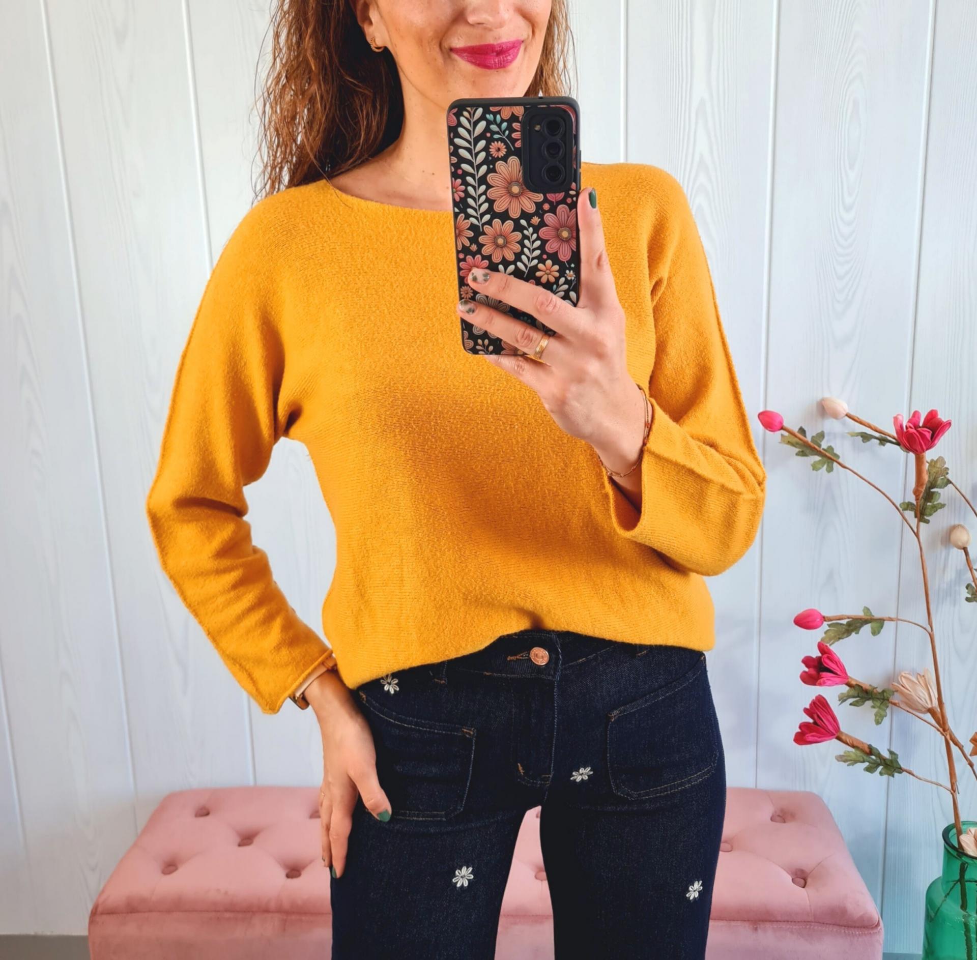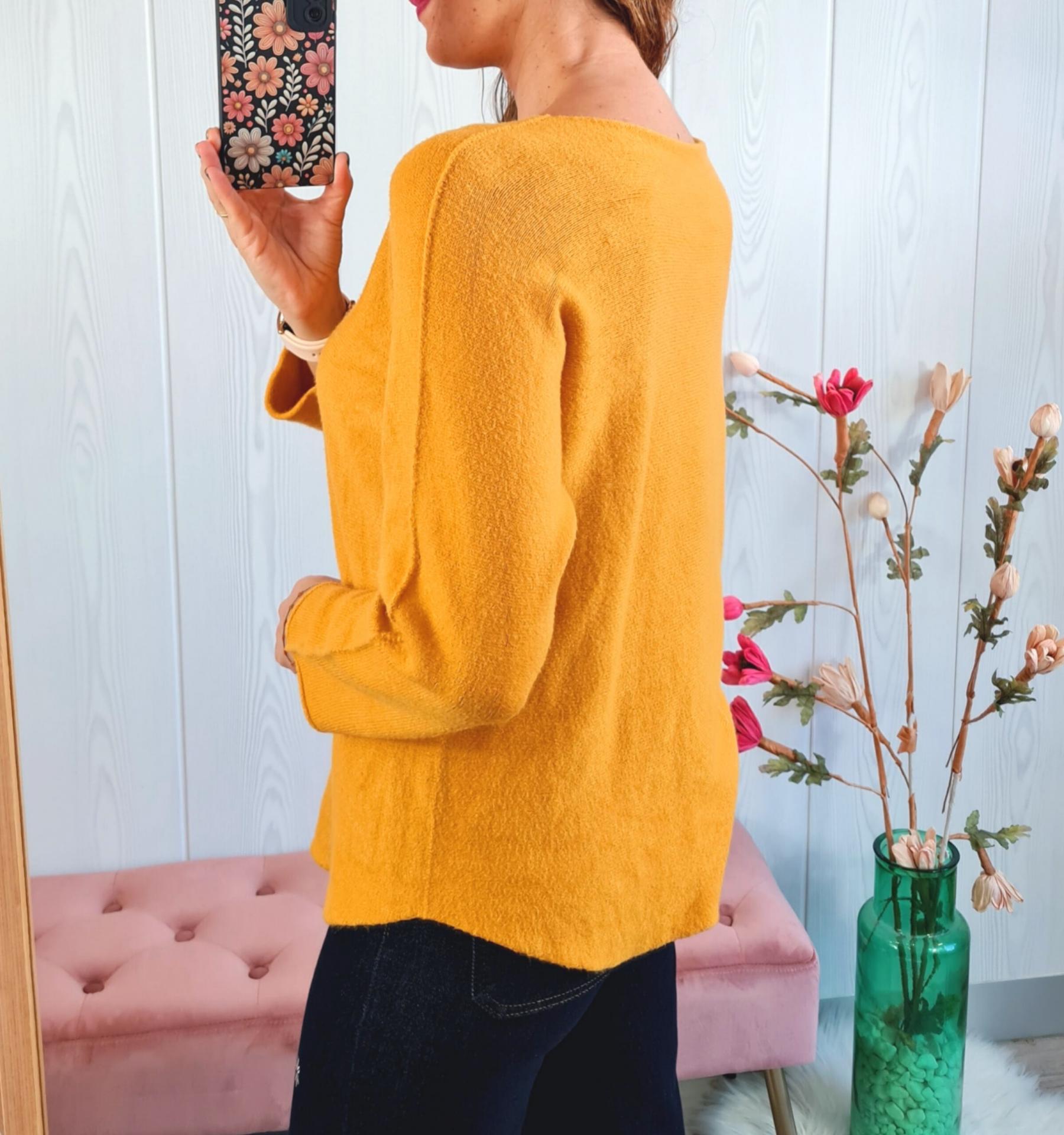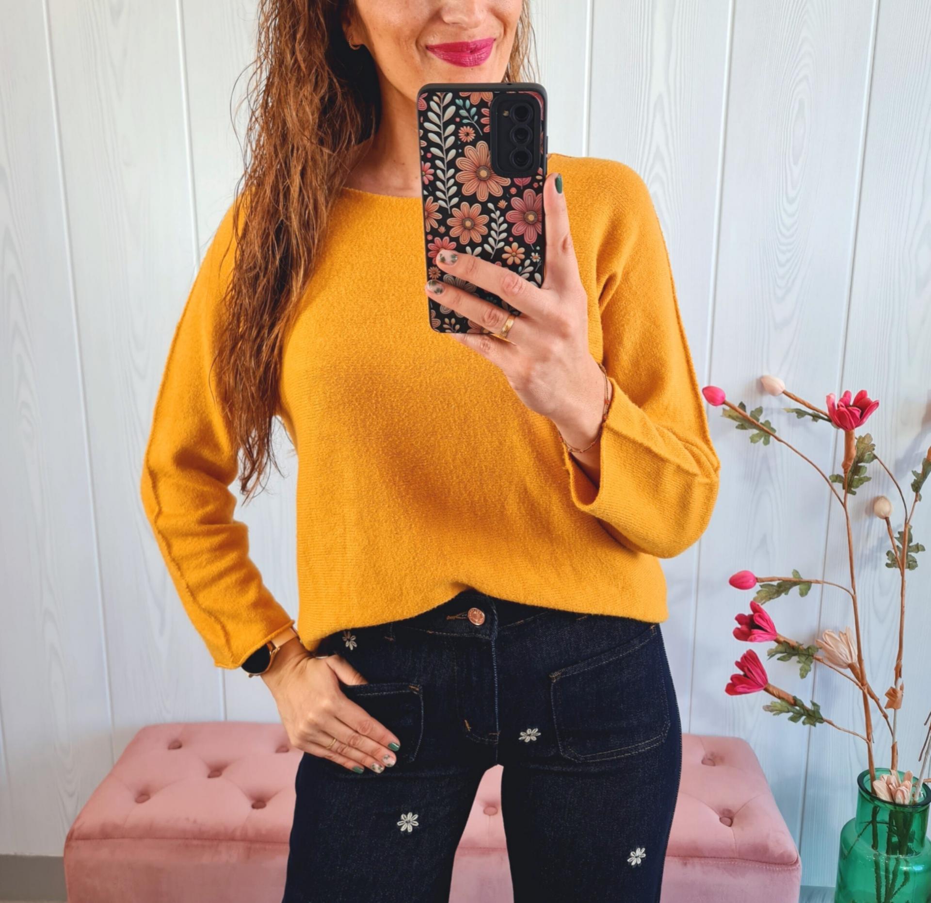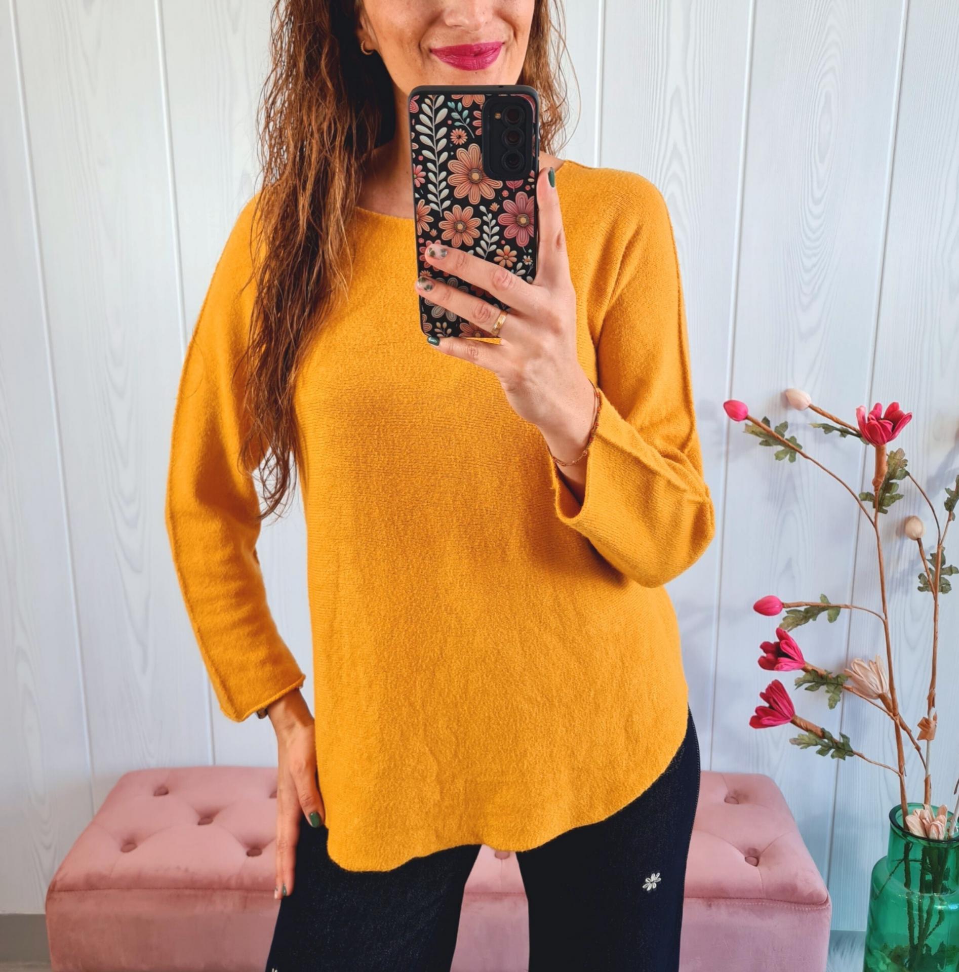 Jersey de color mostaza liso, con cuello abierto y manga larga