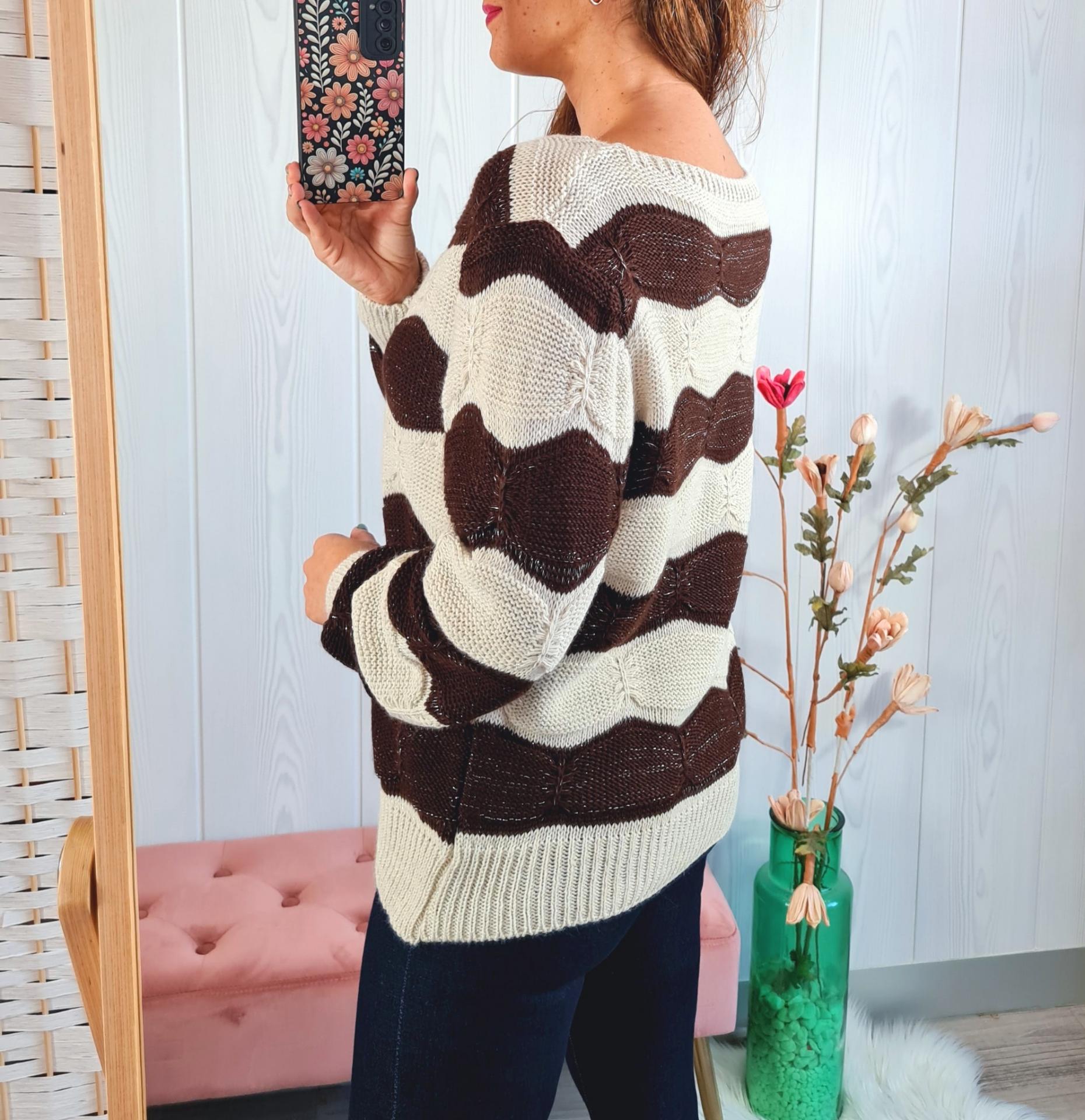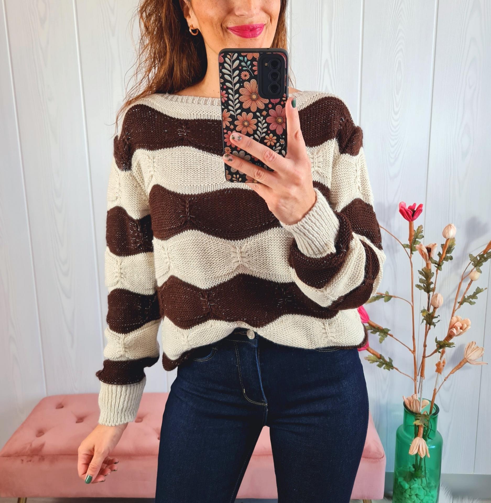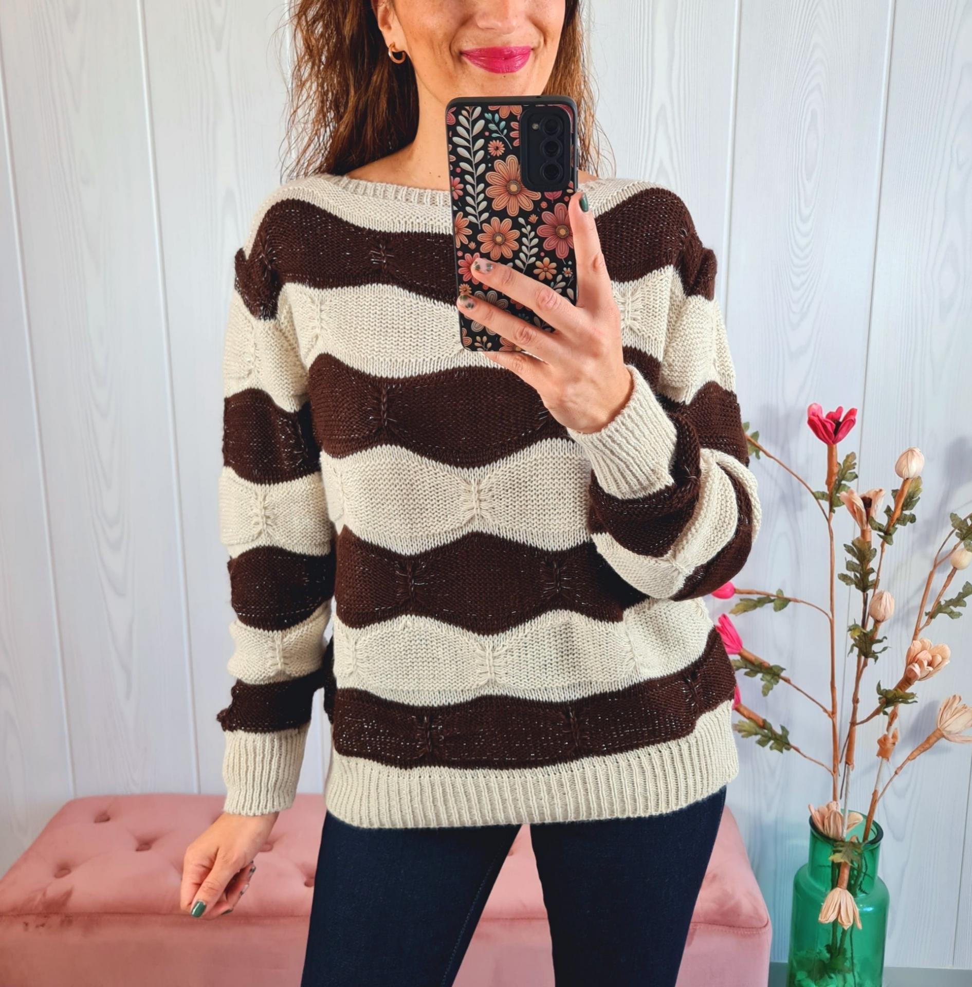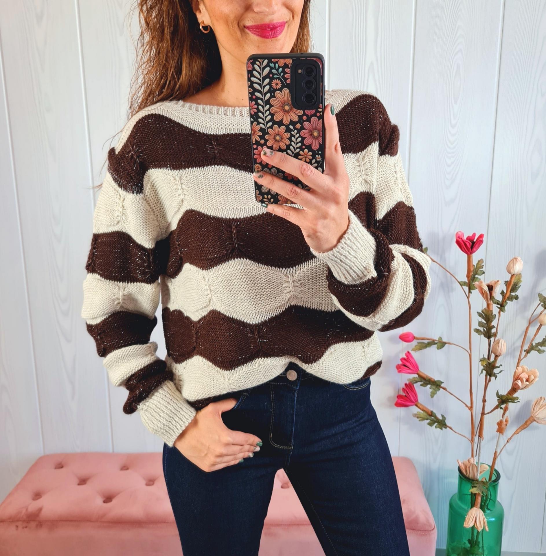 Jersey de color marrón chocolate (jaspeado) y beige a rayas con cuello redondo y manga larga.