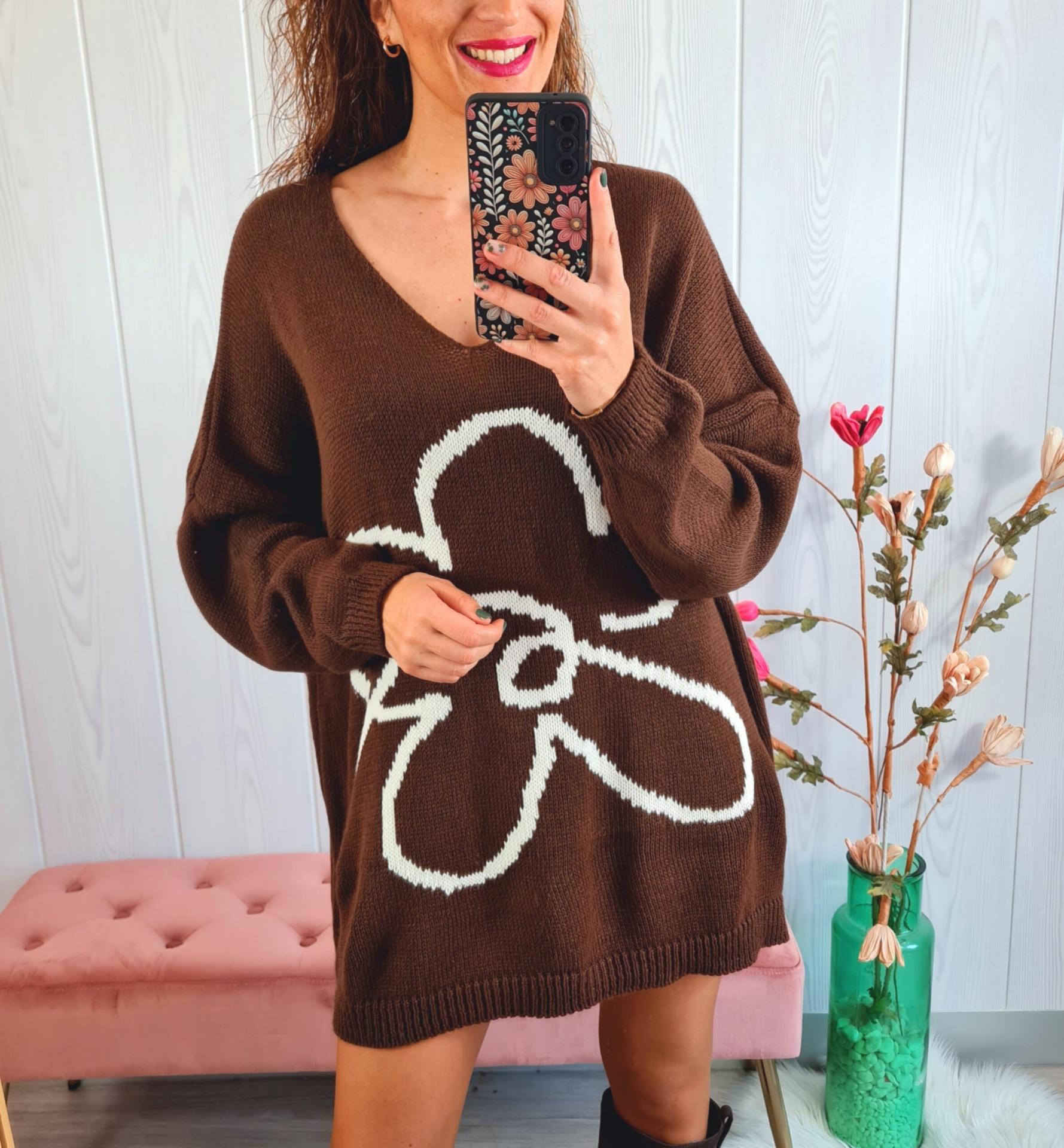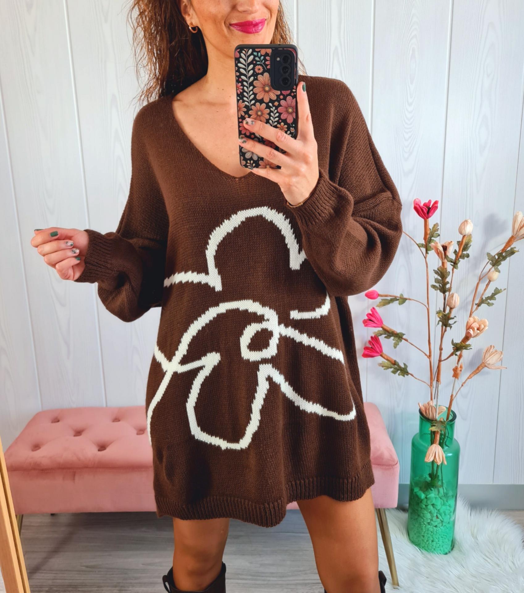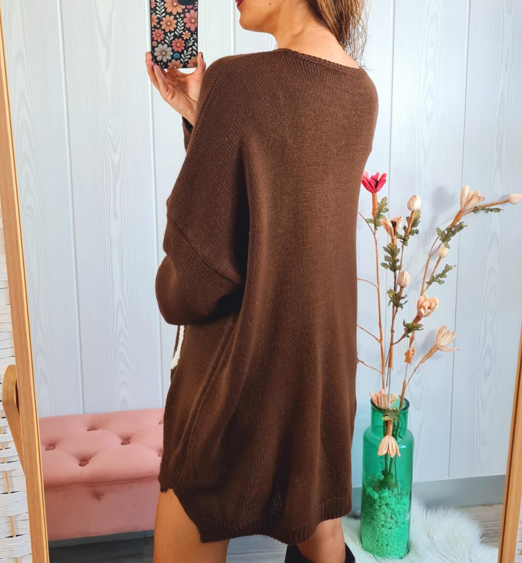 Vestido de punto en color chocolate. Tiene el cuello de pico y manga larga.