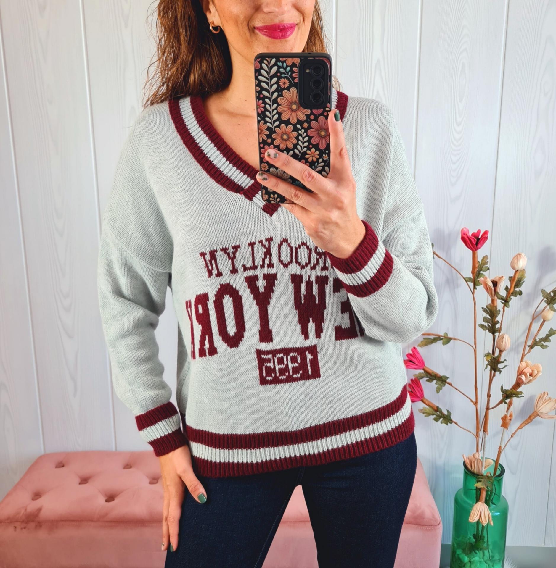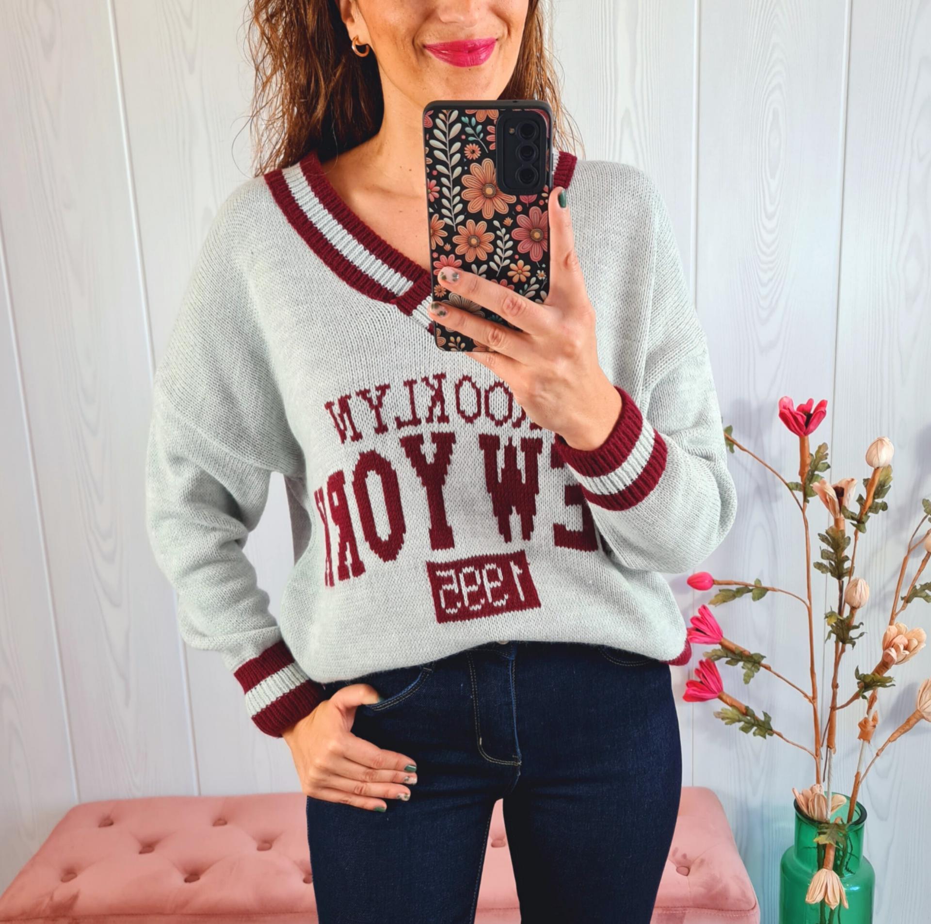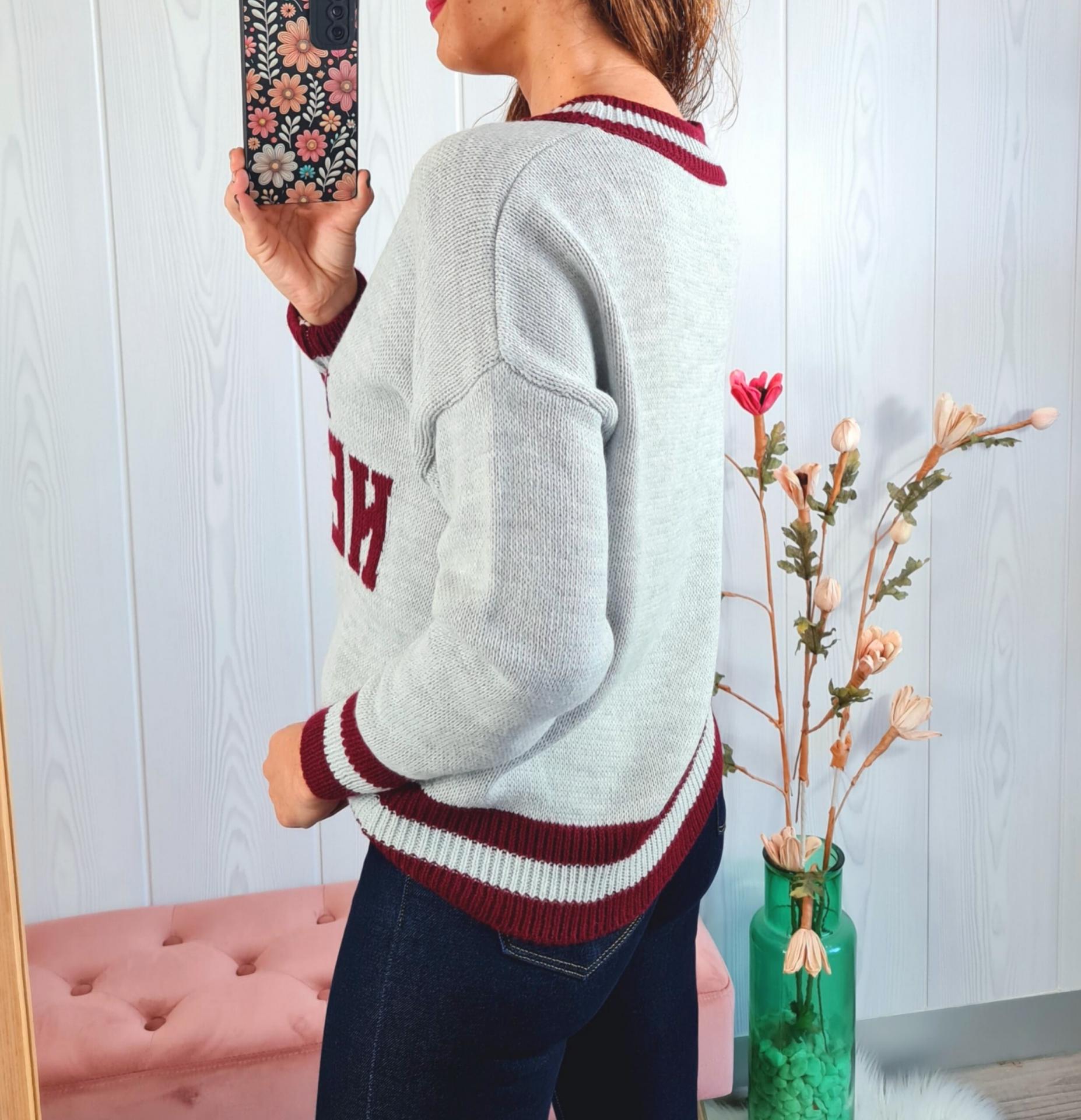 Jersey de color gris con estampado en el pecho y filos del jersey en color granate. Tiene cuello de pico y manga larga.