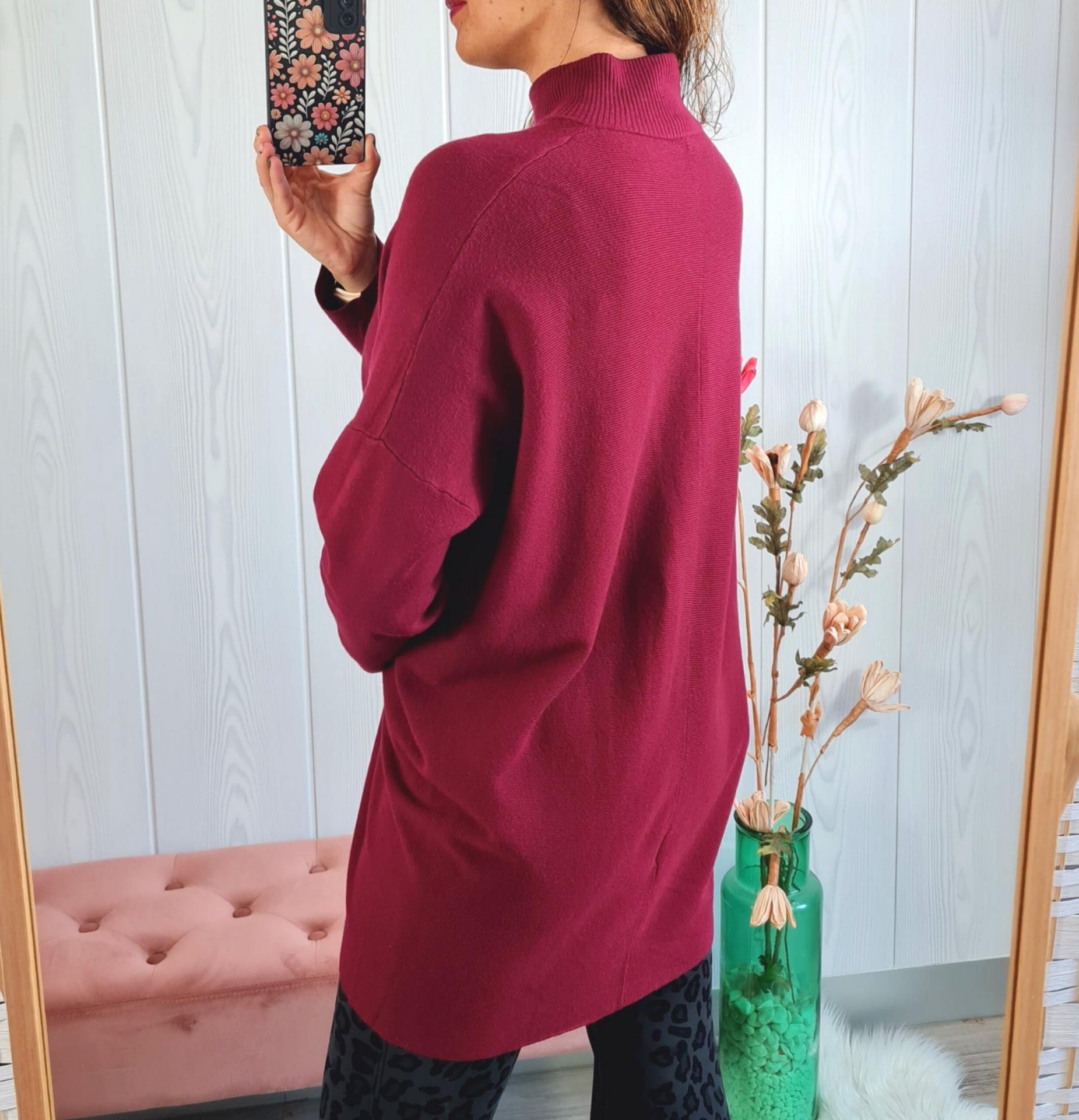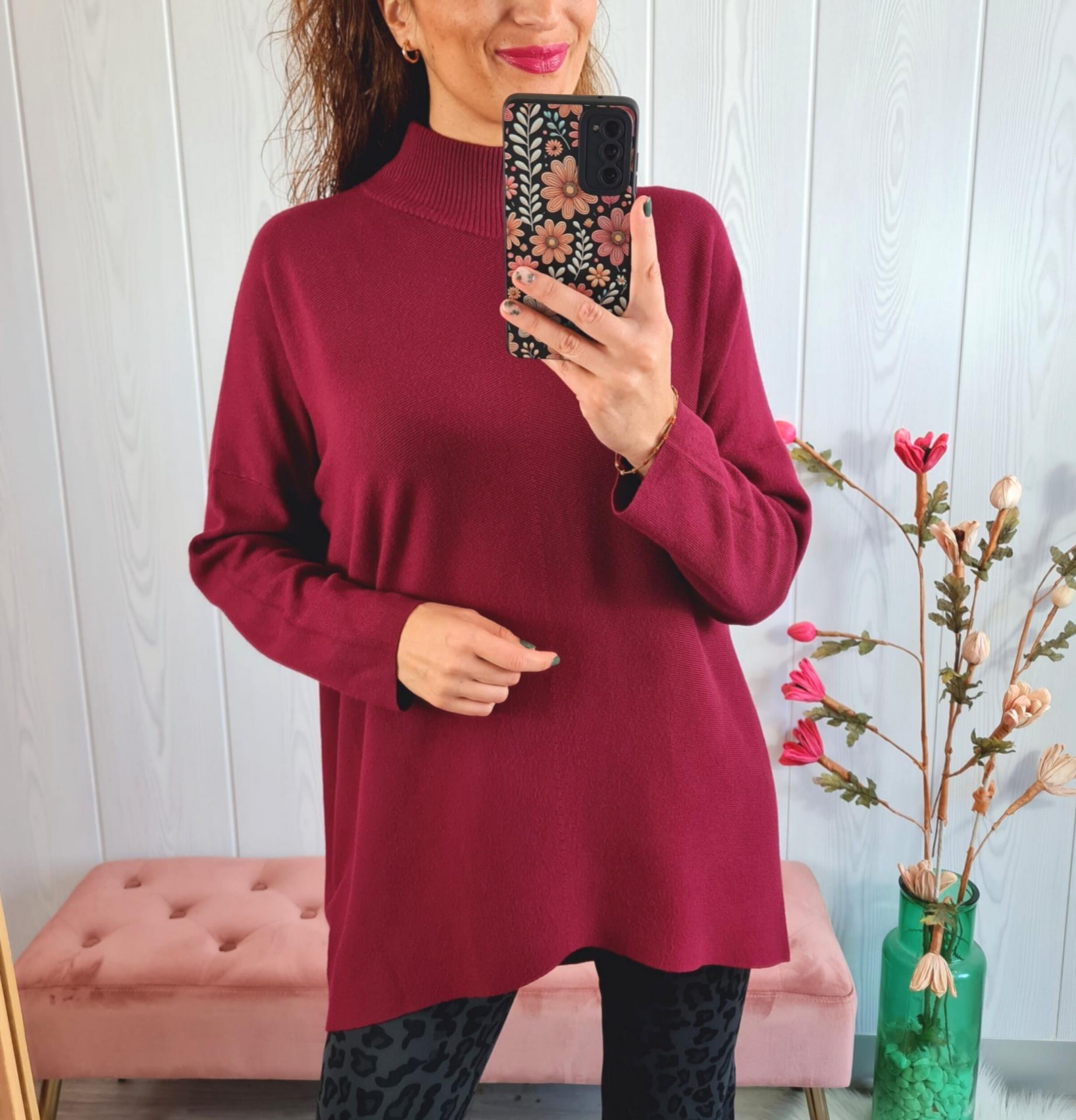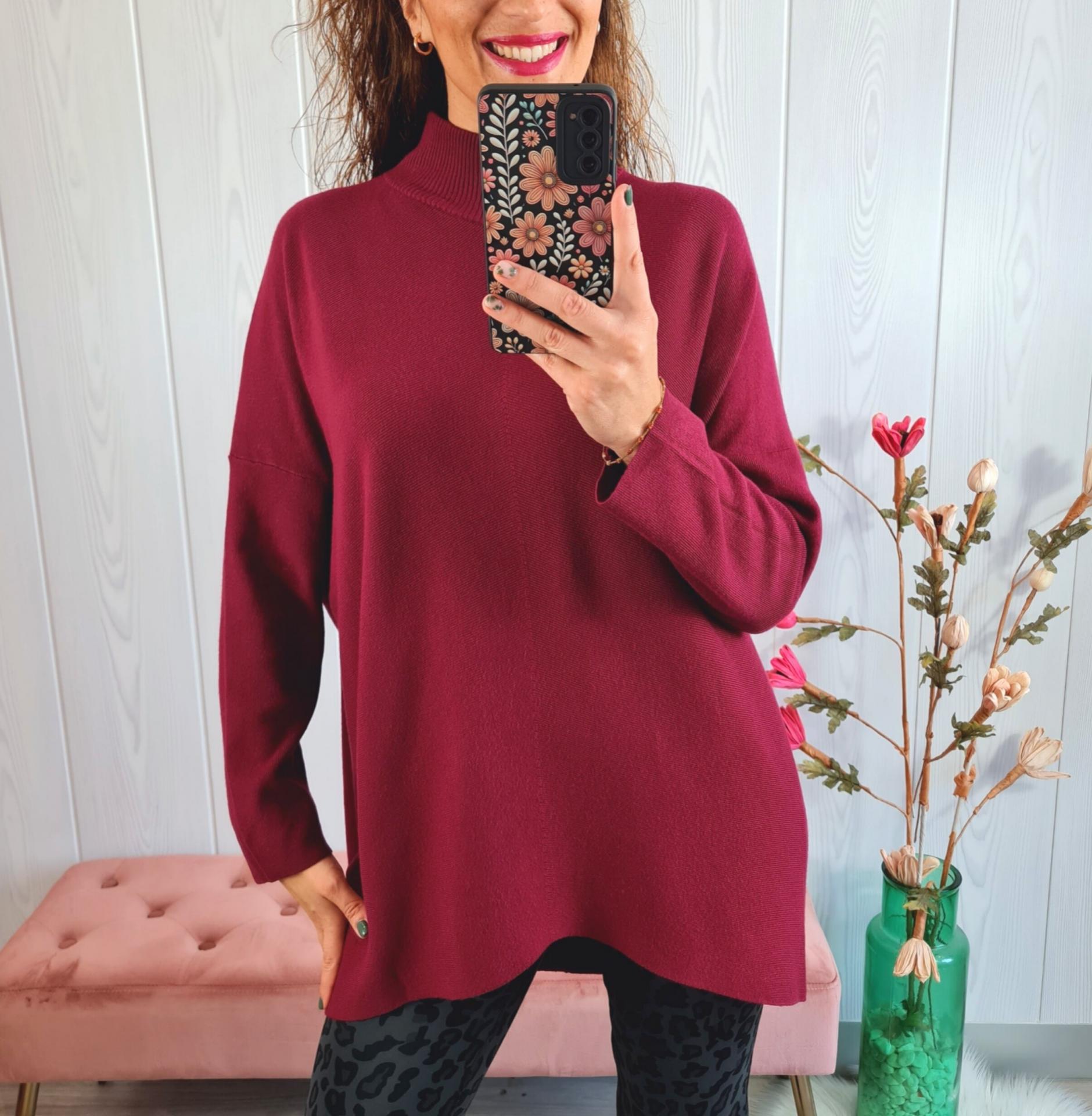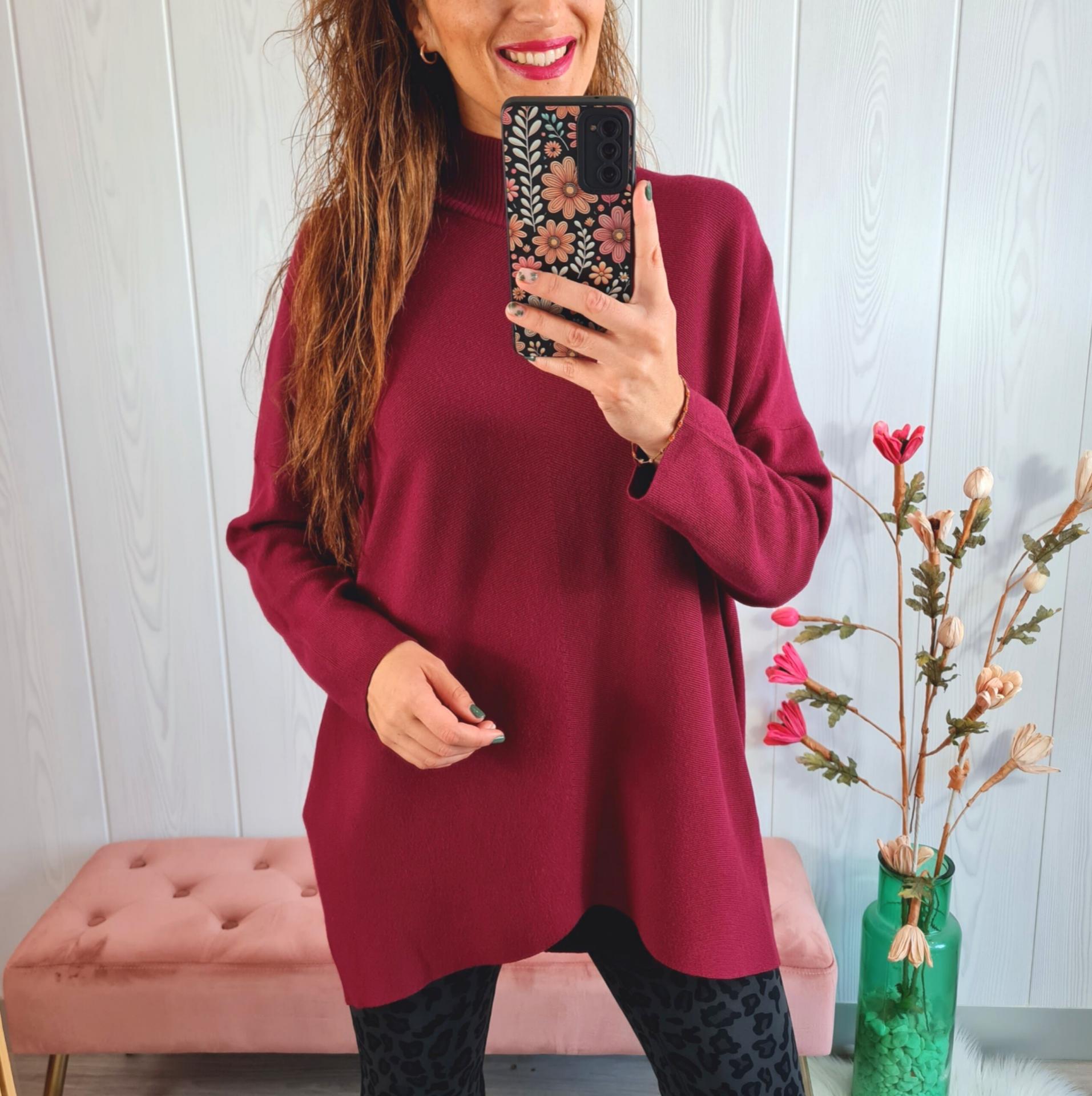 Maxi jersey liso en color granate. Tiene el cuello subido y manga larga.