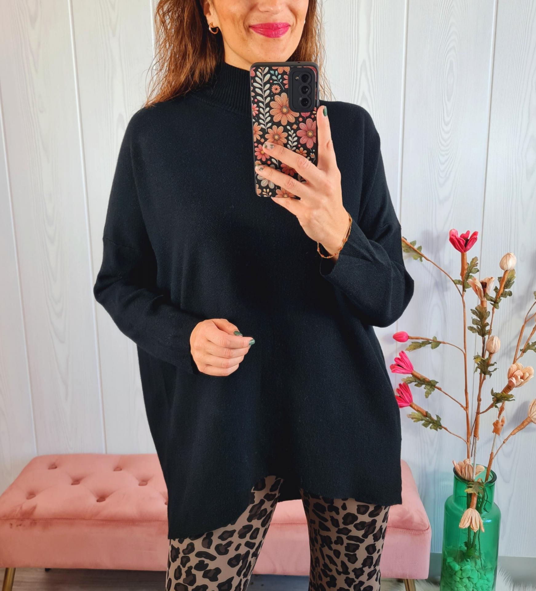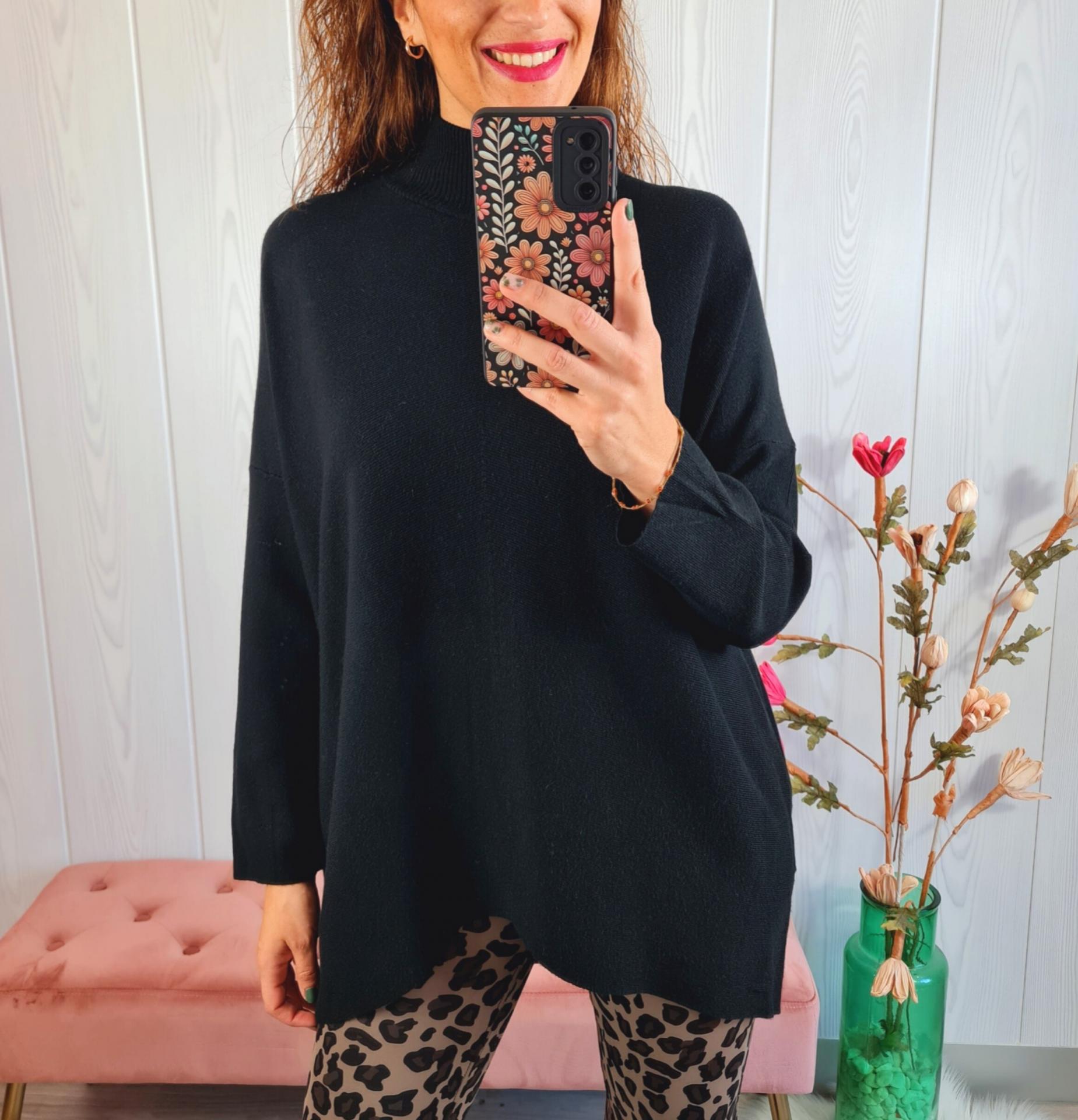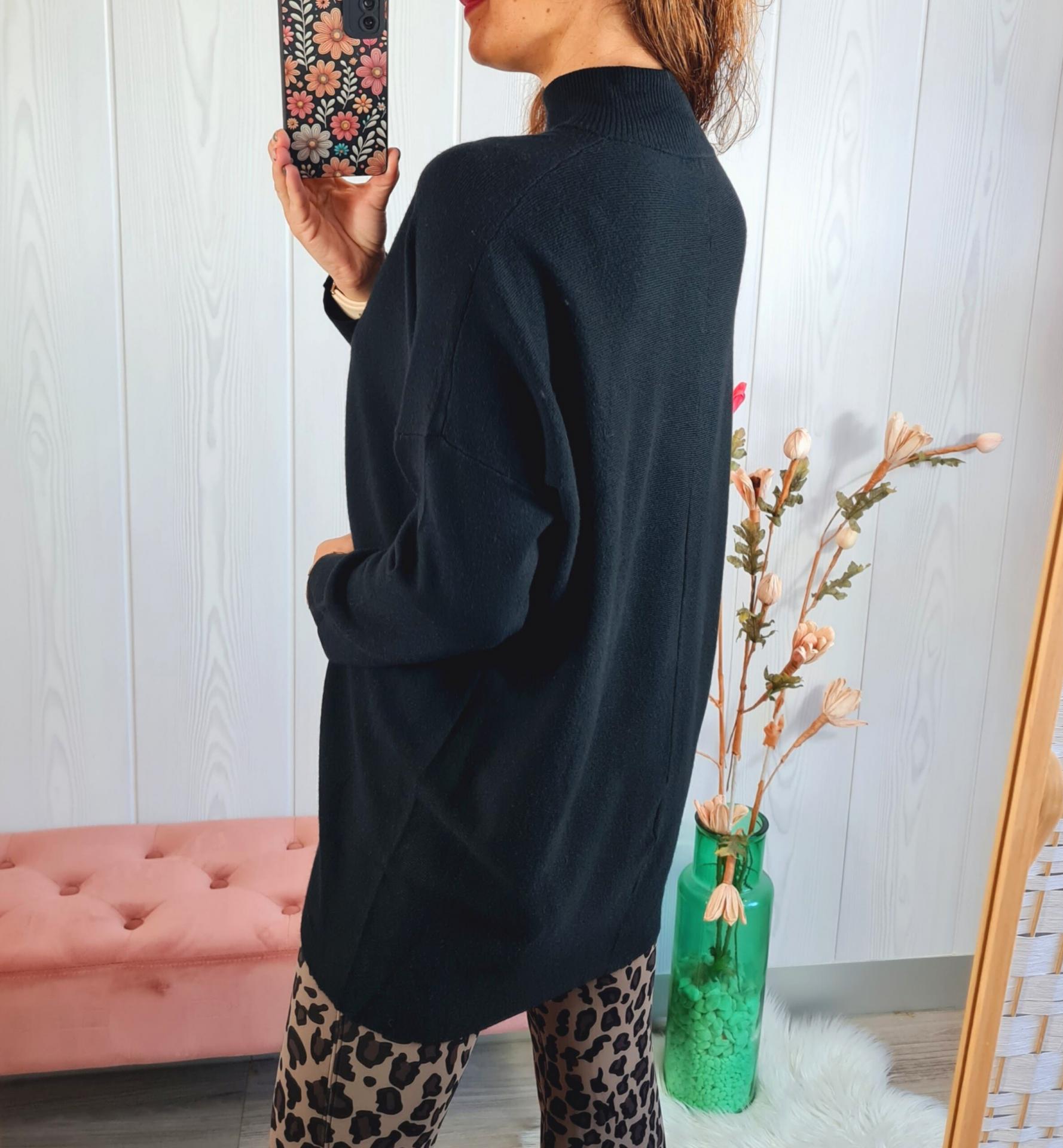 Maxi jersey liso en color negro. Tiene el cuello subido y manga larga.