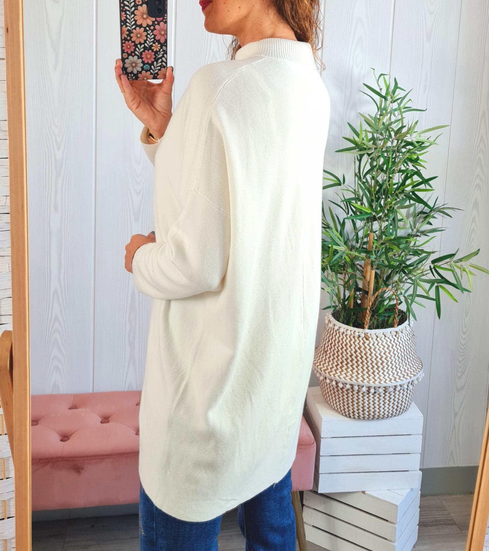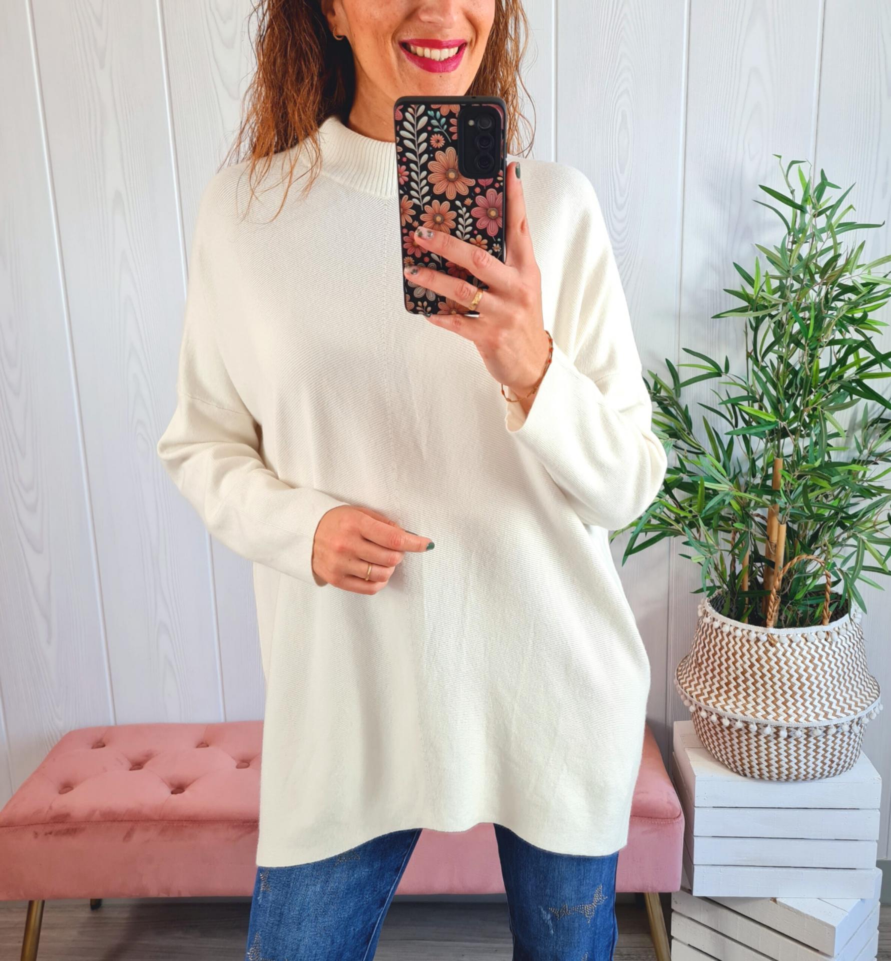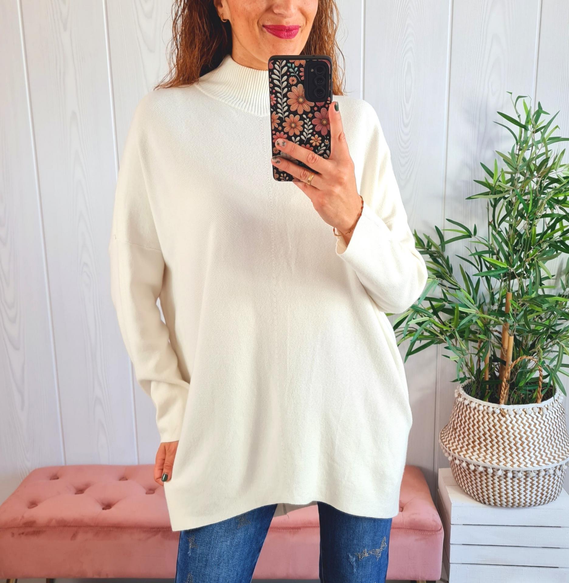 Maxi jersey liso en color blanco. Tiene el cuello subido y manga larga.