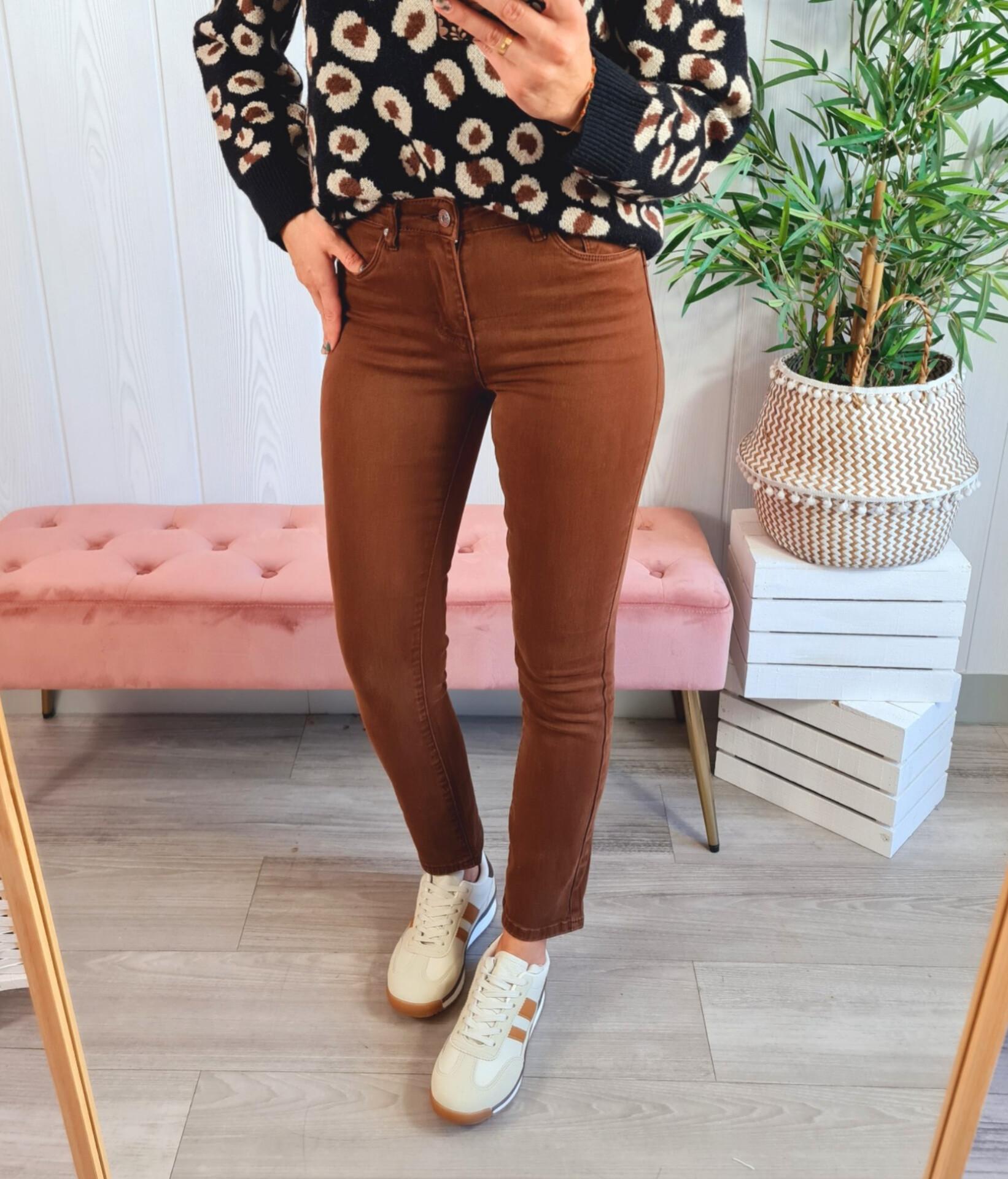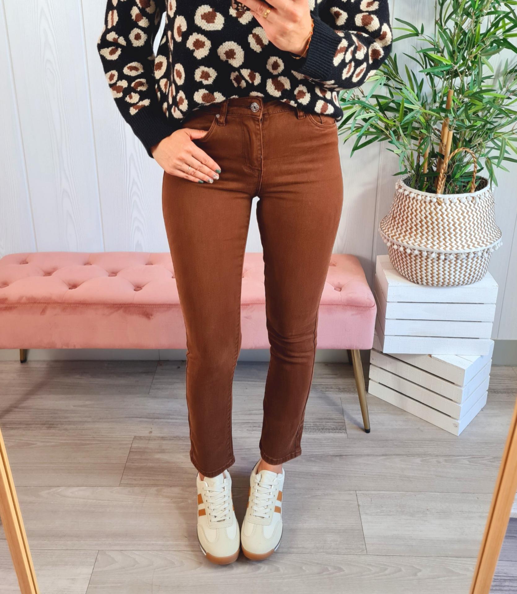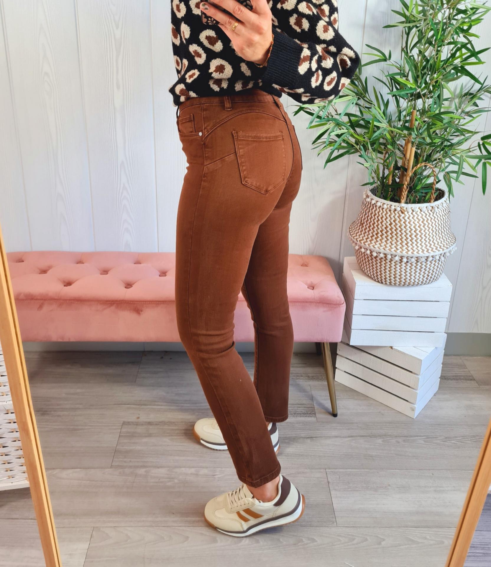 Pantalón en color marrón con el bajo recto. Tiene cierre con botón y cremallera y efecto push-up.