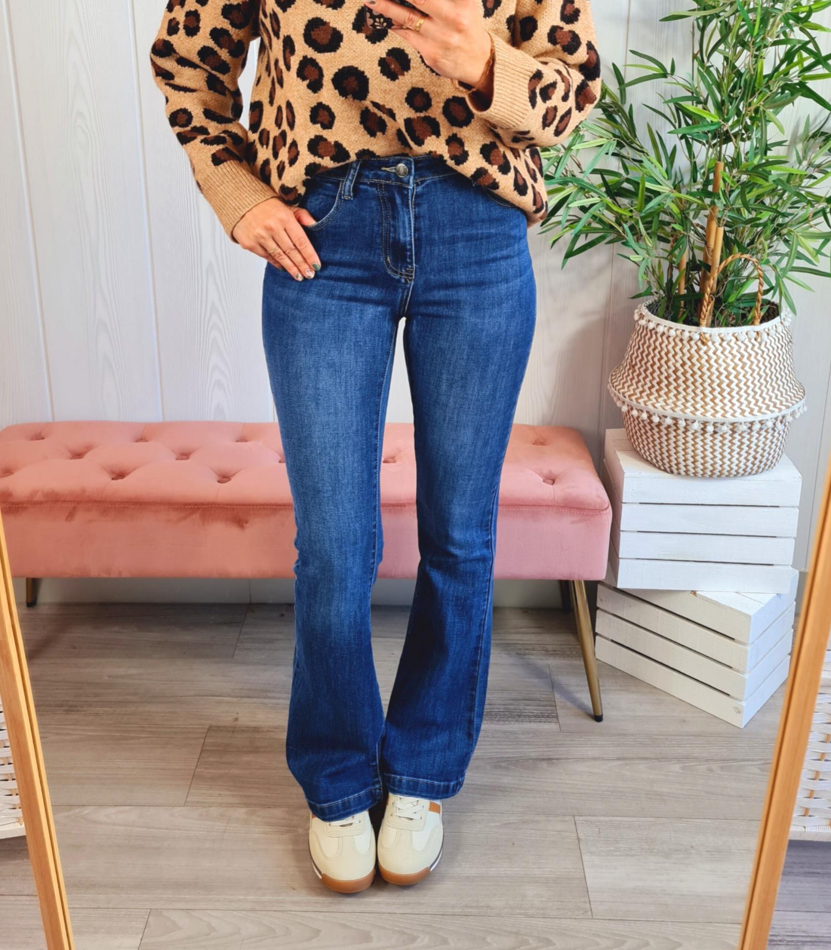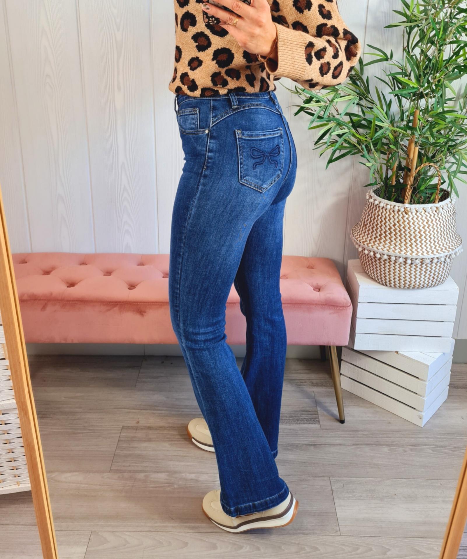 Pantalón vaquero oscuro con el bajo acampanado. Tiene cierre con botón y cremallera y lazo bordado en los bolsillos traseros.