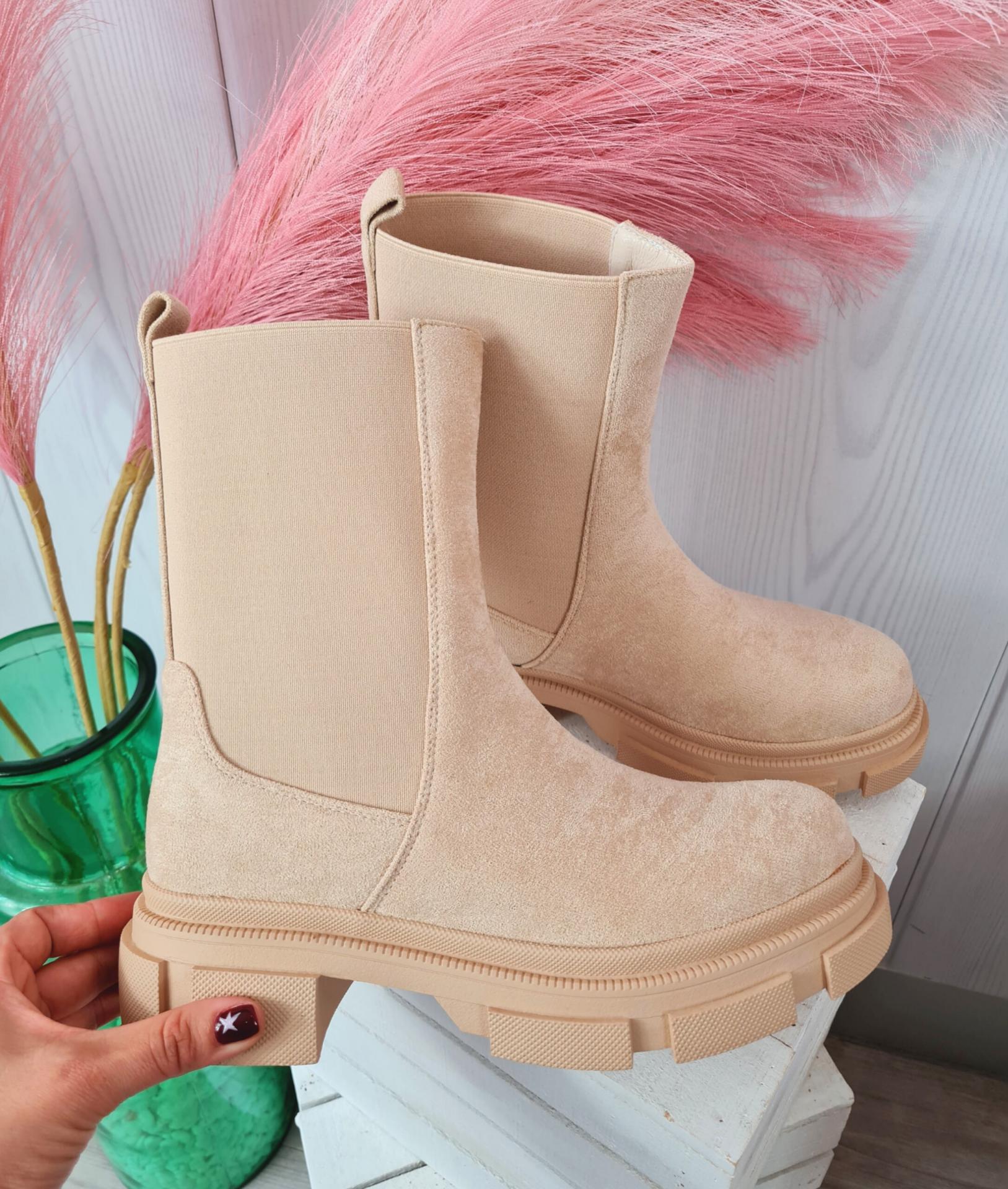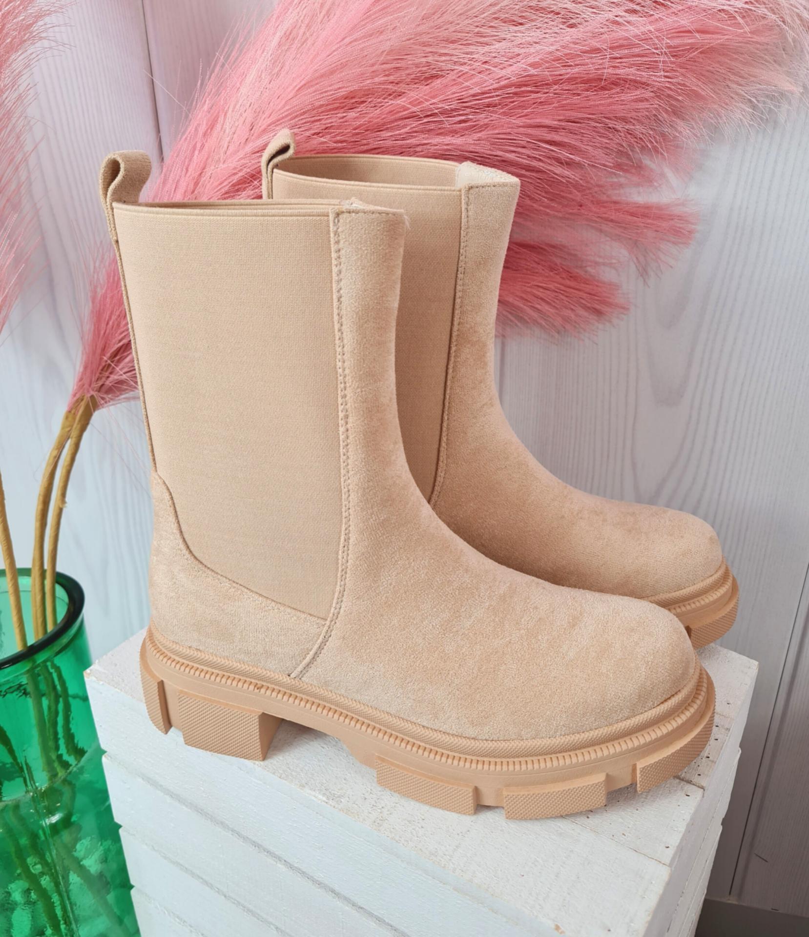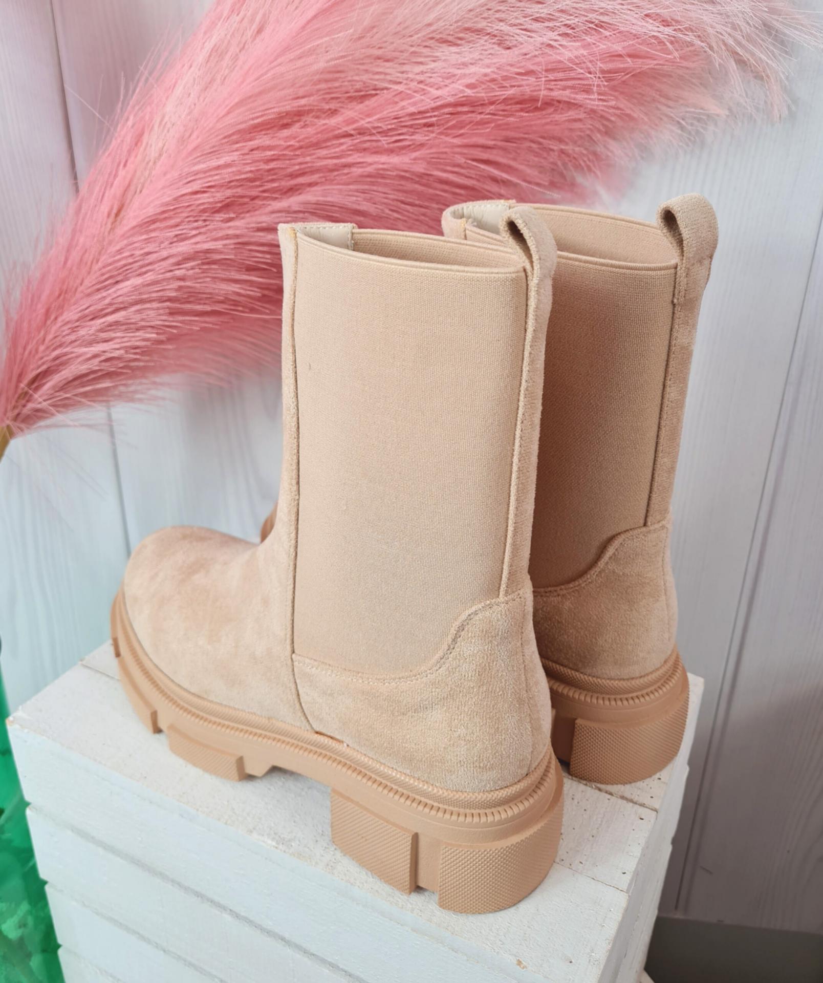Botas de color beige con acabado de ante y suela track en el mismo color. Tiene goma de adorno en ambos laterales.