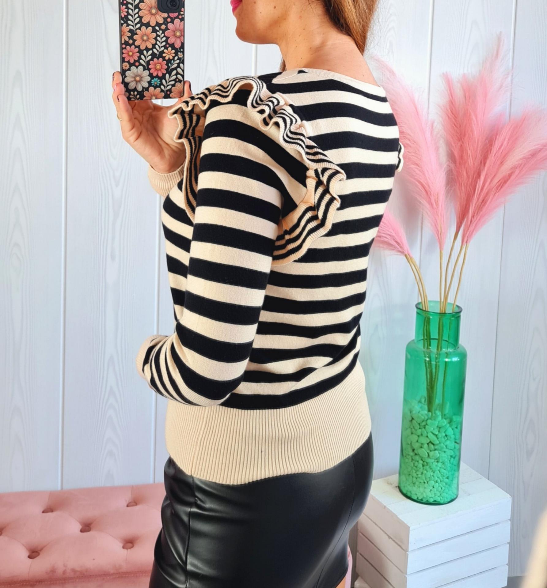 Jersey en color beige con rayas negras, con cuello redondo a la caja y manga larga. Tiene volantes de adorno en los hombros.