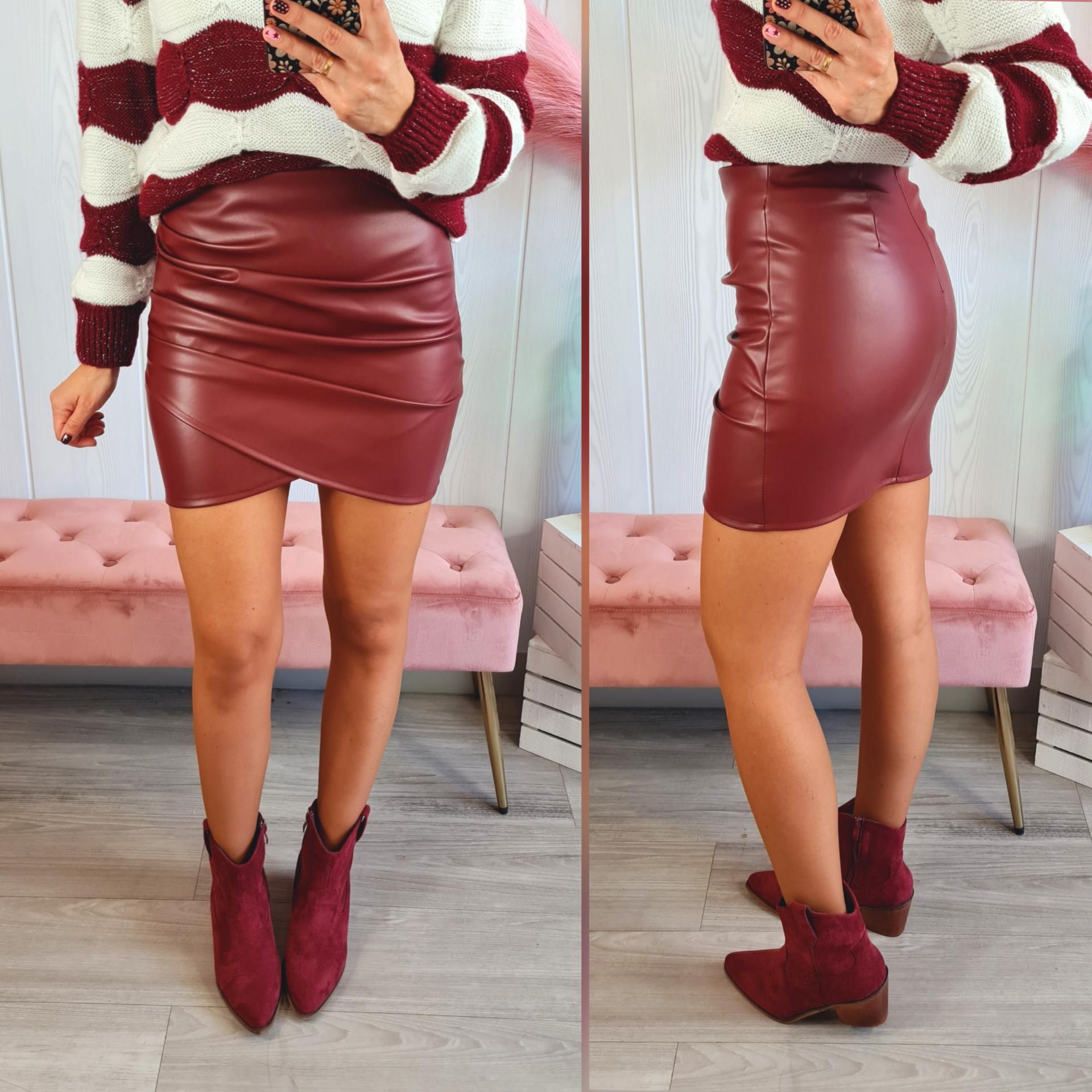 Falda corta de polipiel en color granate, drapeado lateral de adorno y cierre con cremallera.