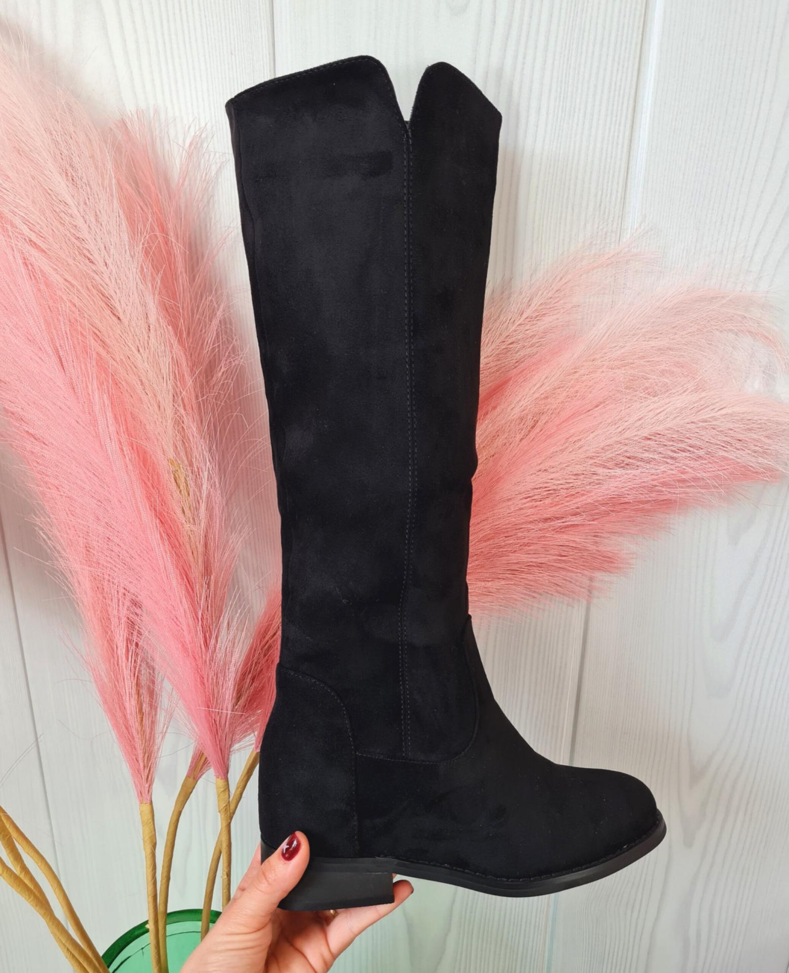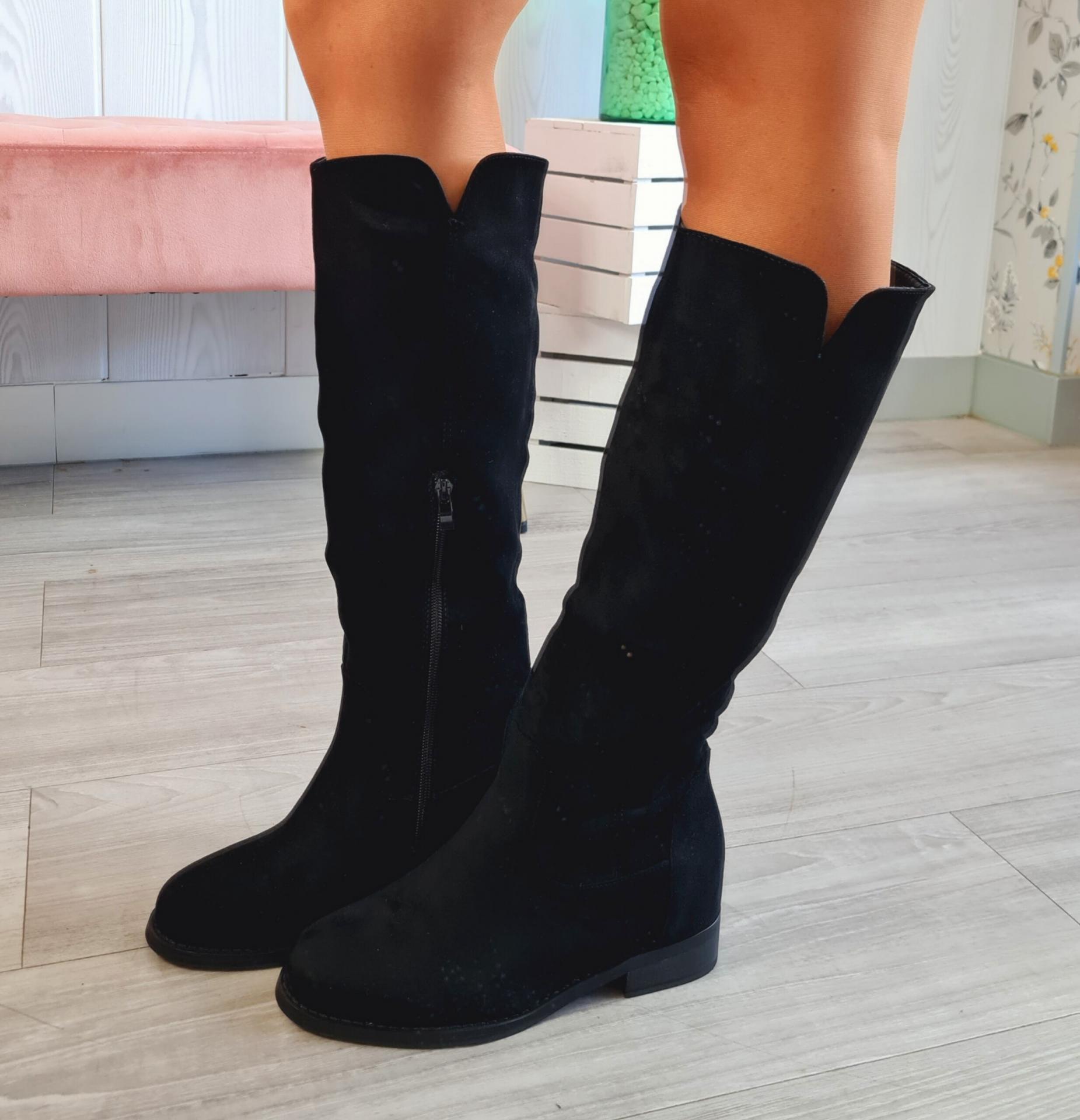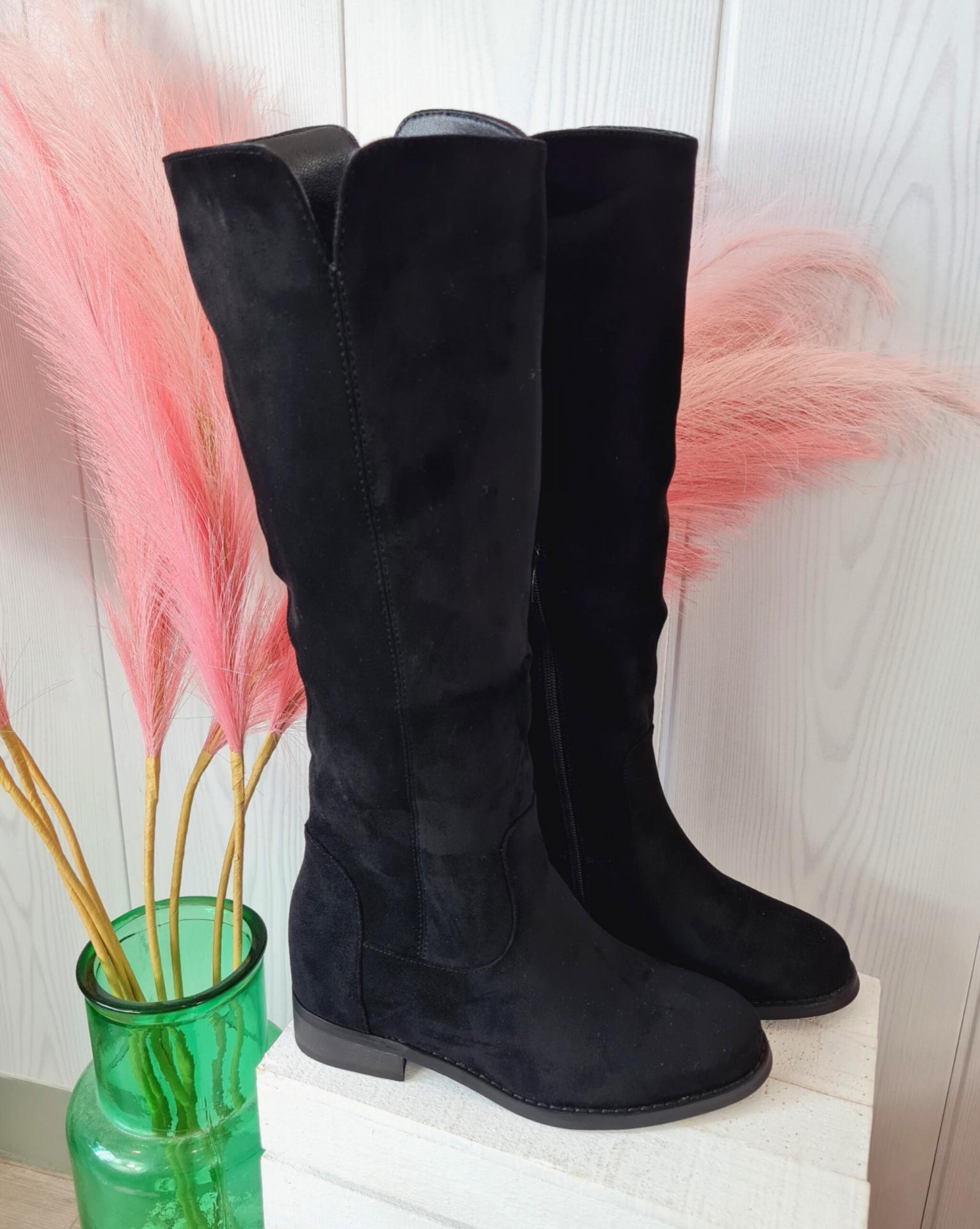 Botas altas de color negro con cuña interior y acabado en ante. El cierre es mediante media cremallera por la parte interna.