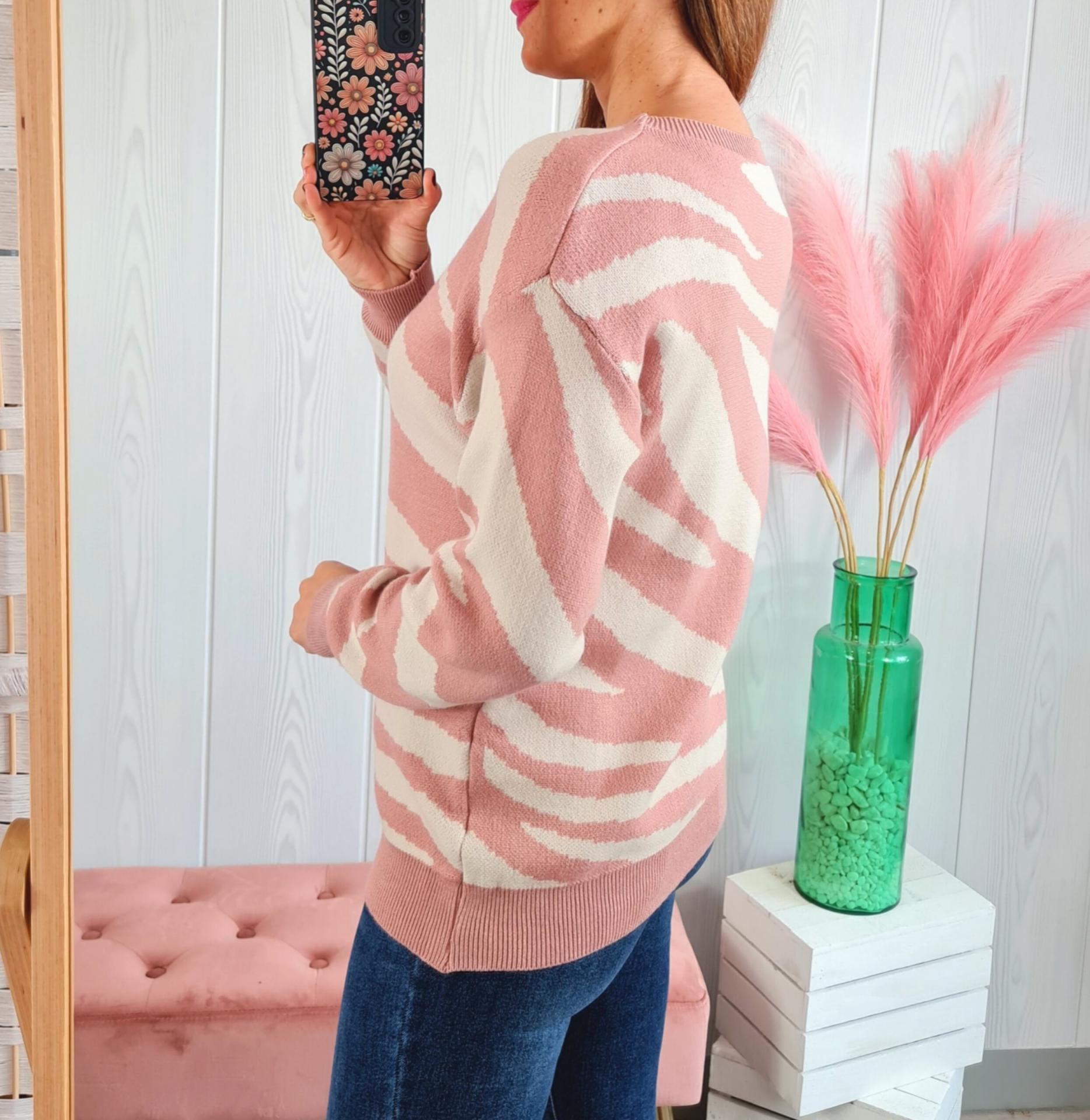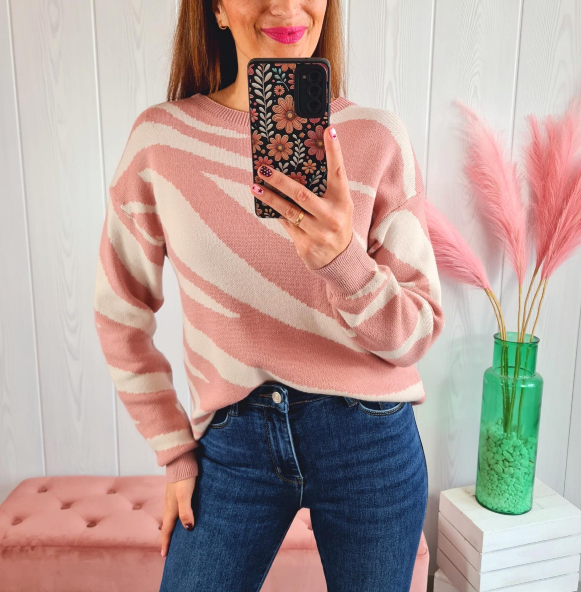 Jersey en dos tonos de rosa, a rayas, con cuello redondo y manga larga.