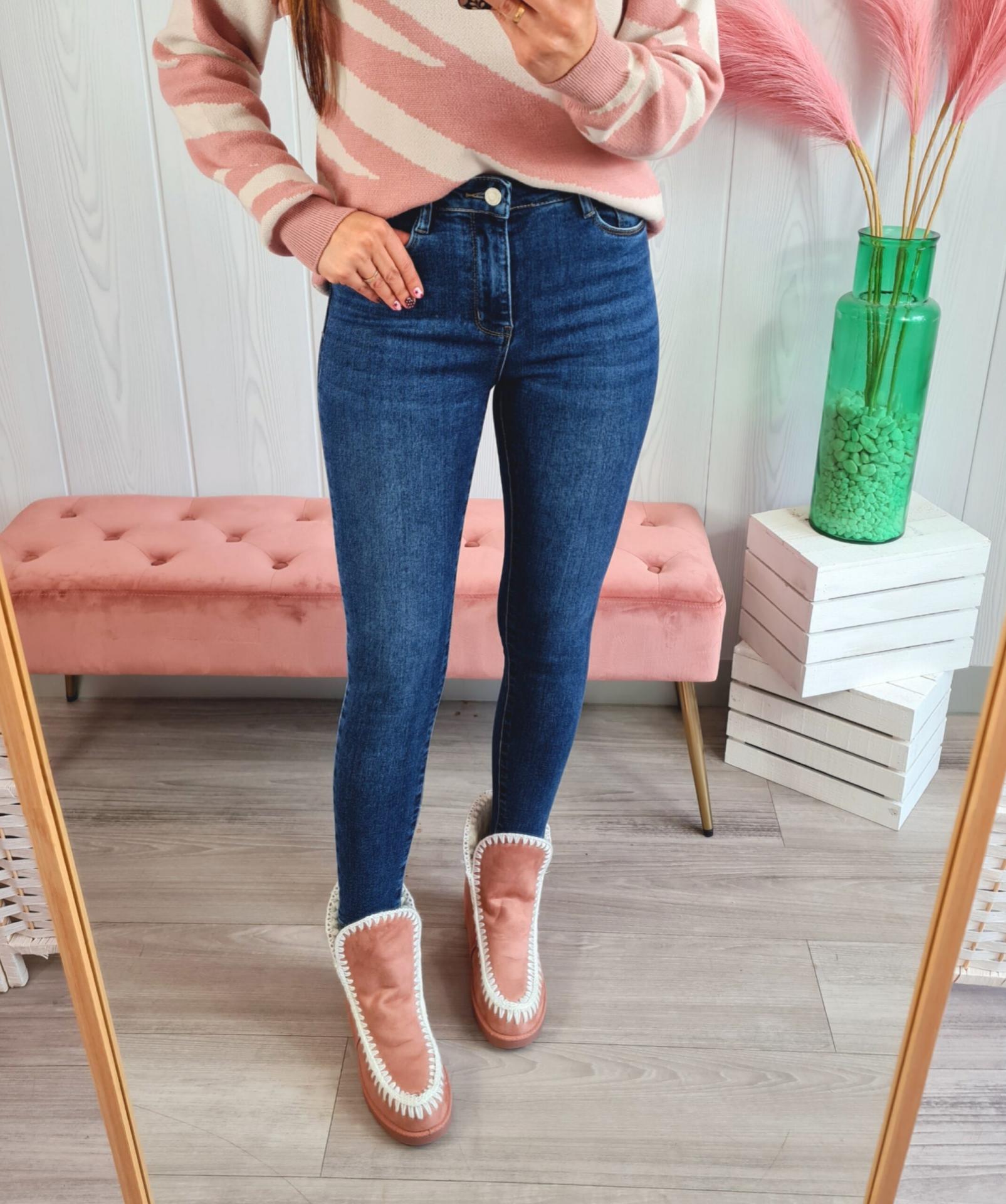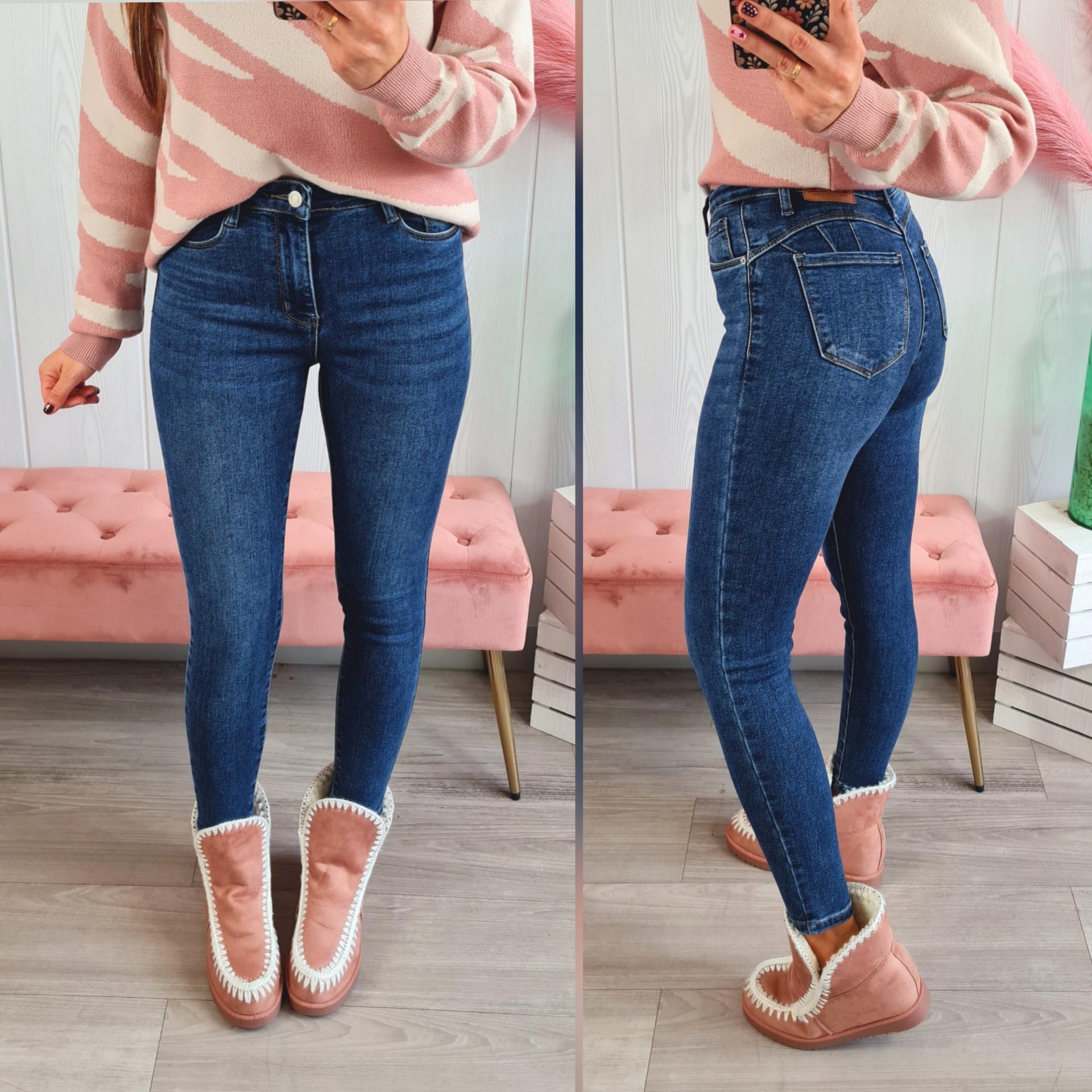 Pantalón pitillo en color vaquero oscuro. Tiene cierre con botón y cremallera y efecto push-up.
