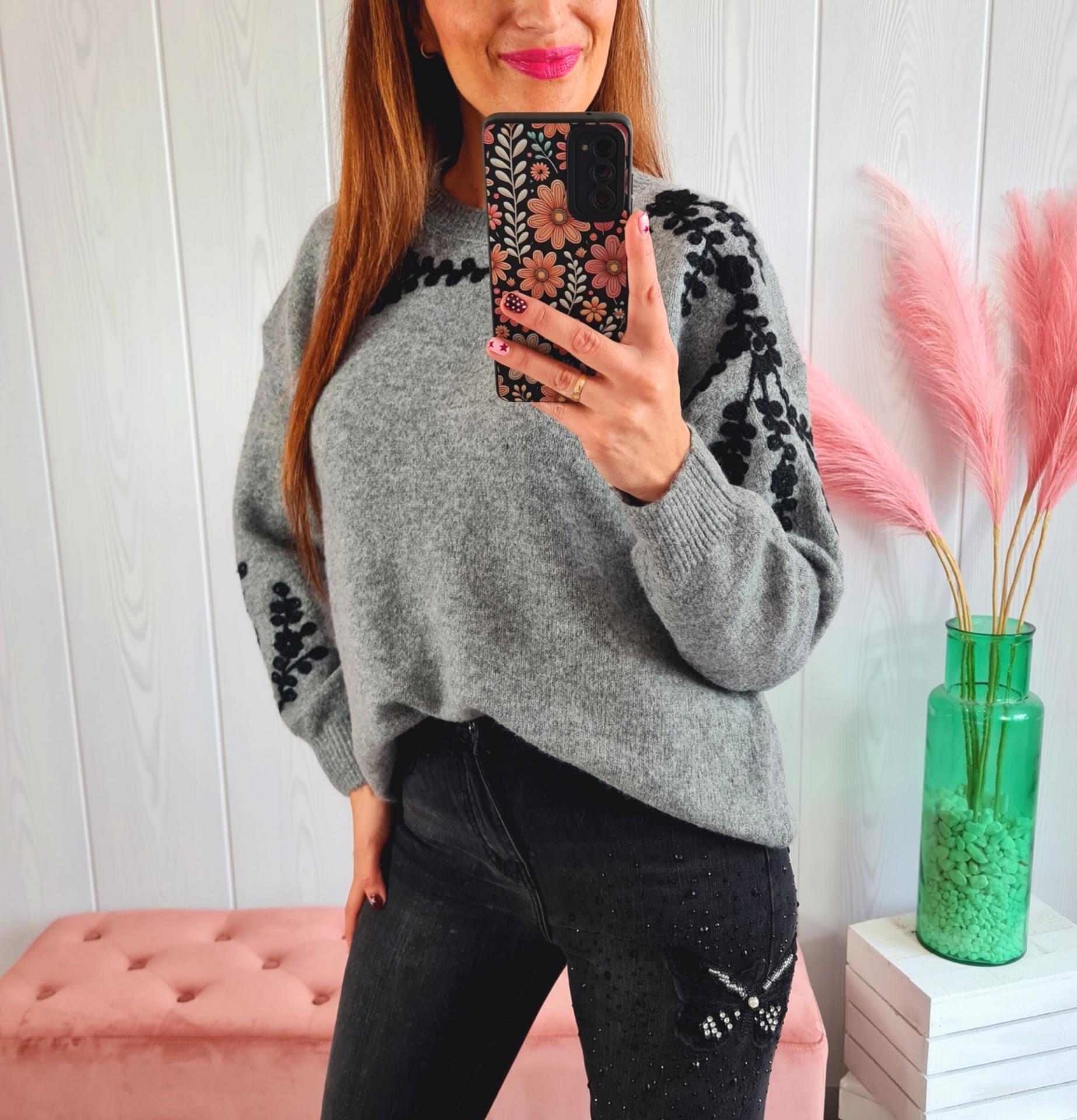 Jersey de color gris con flores negras de adorno. Tiene cuello redondo y manga larga.