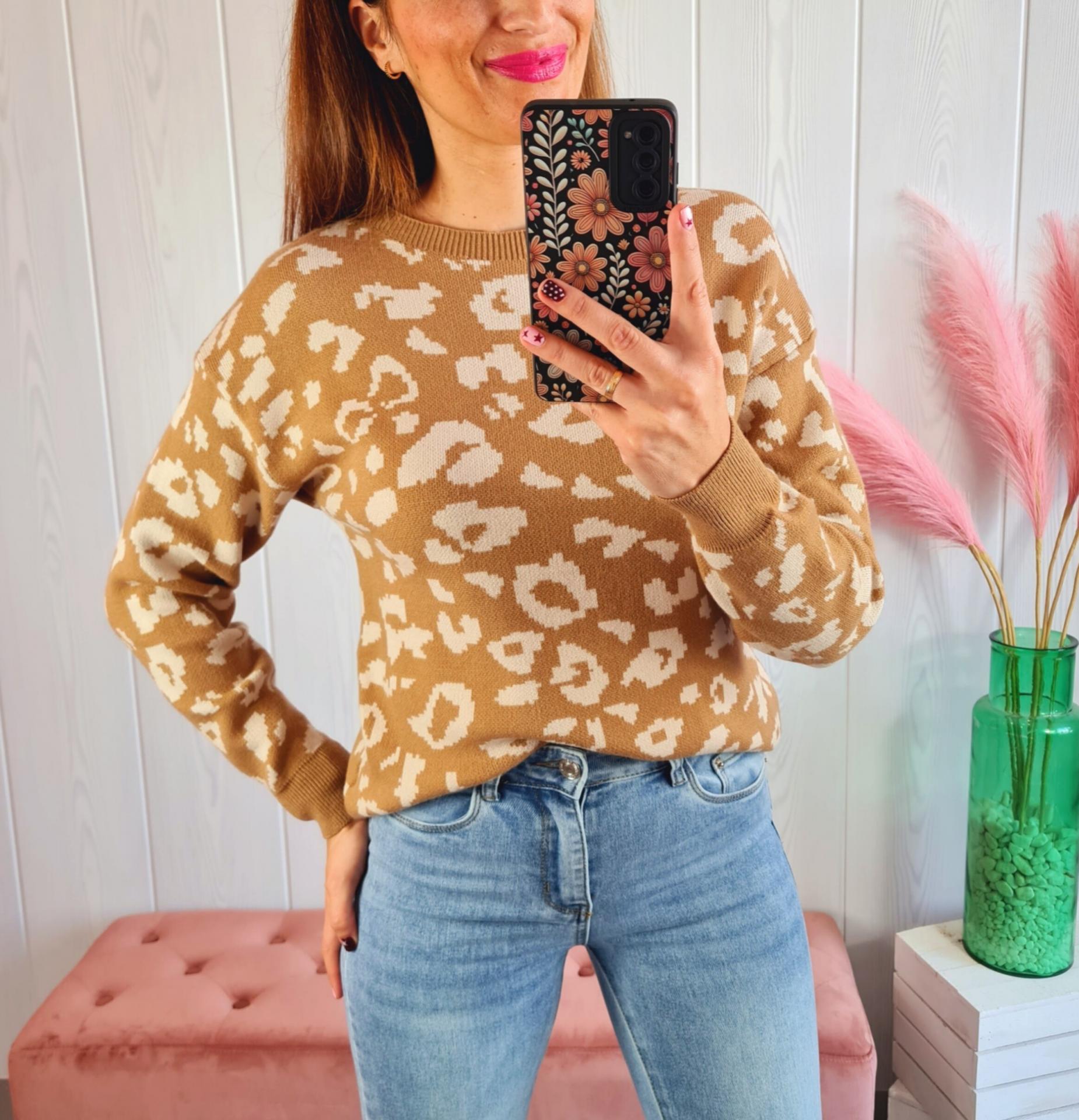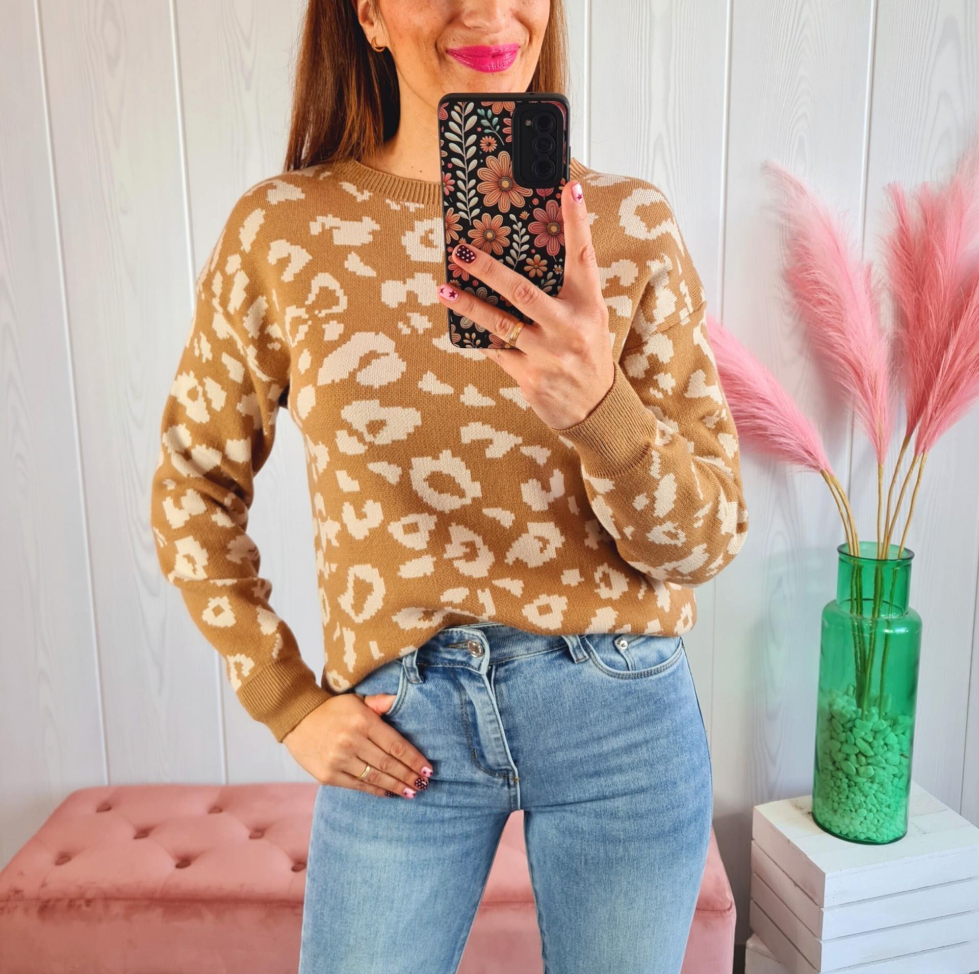 Jersey en color camel y beige con estampado print. Tiene cuello redondo y manga larga.