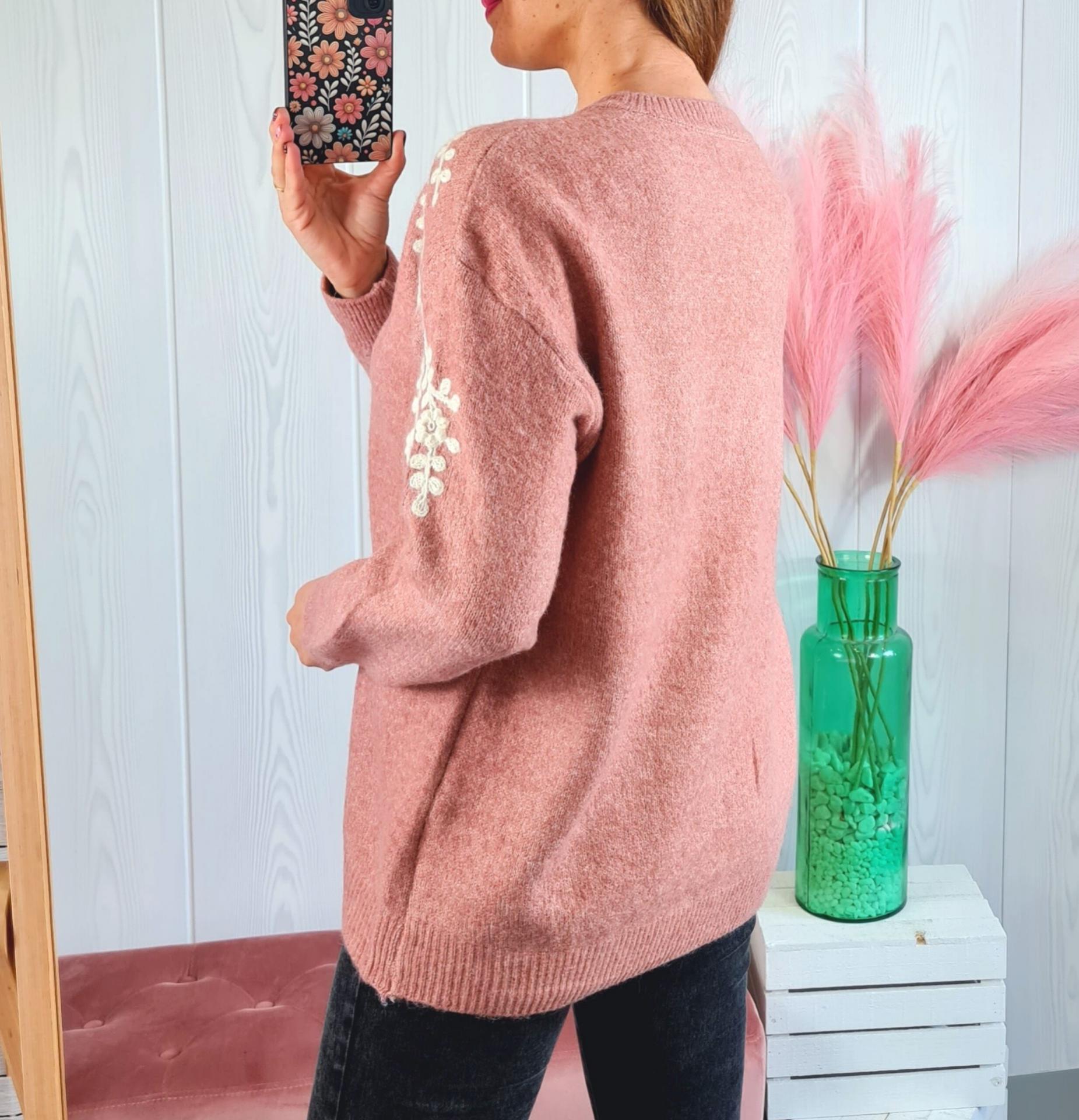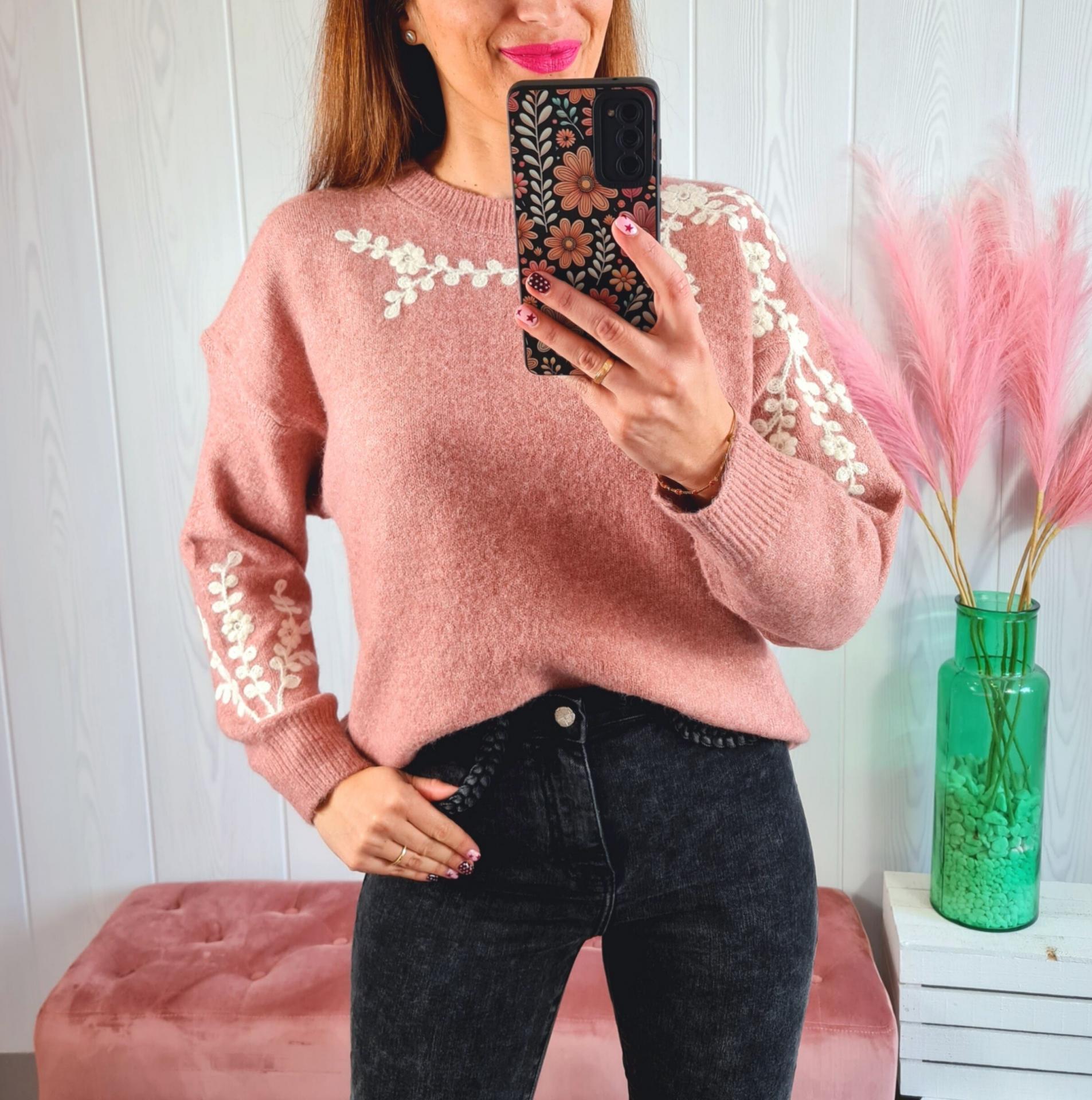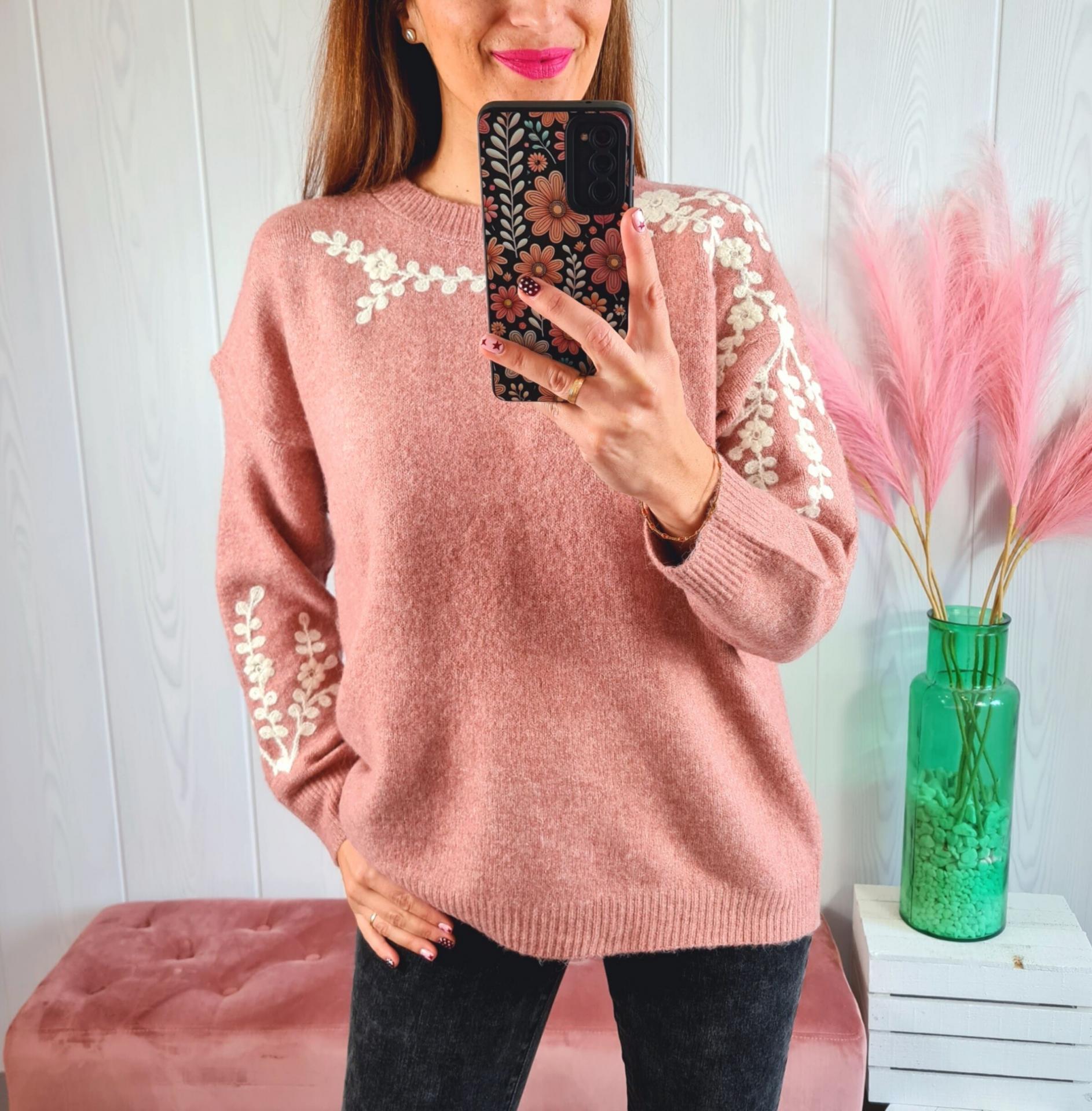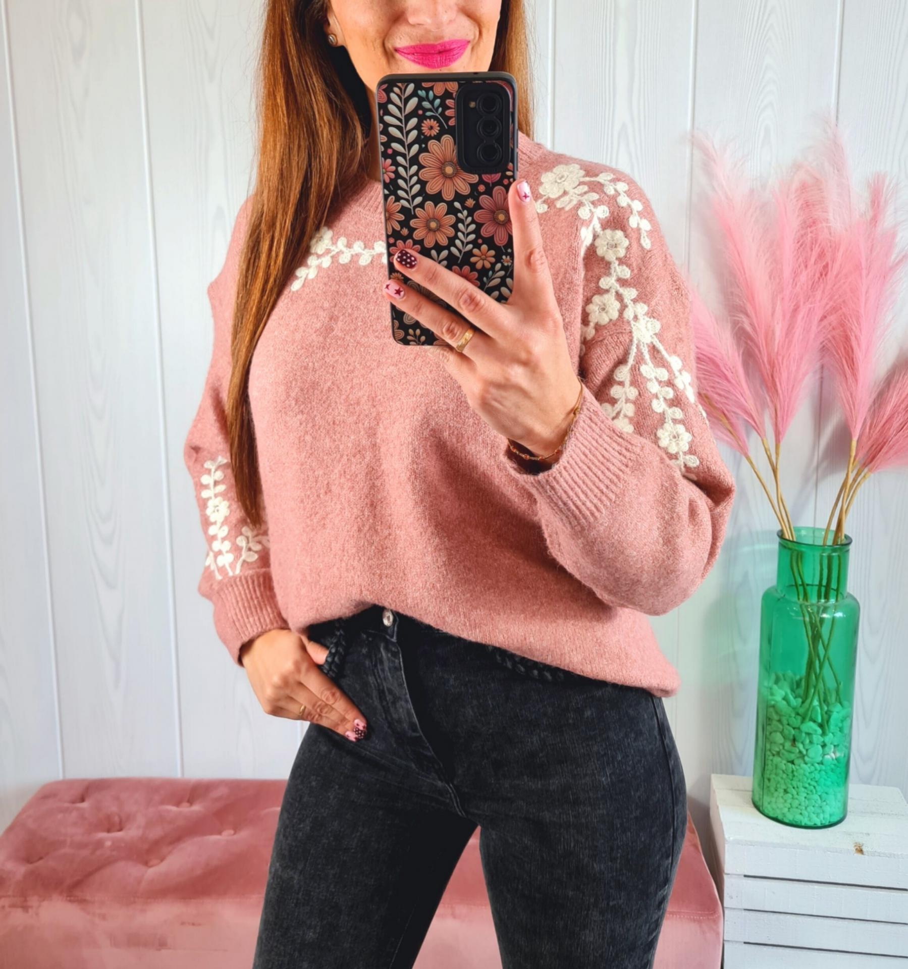 Jersey de color rosa con flores blancas de adorno. Tiene cuello redondo y manga larga.