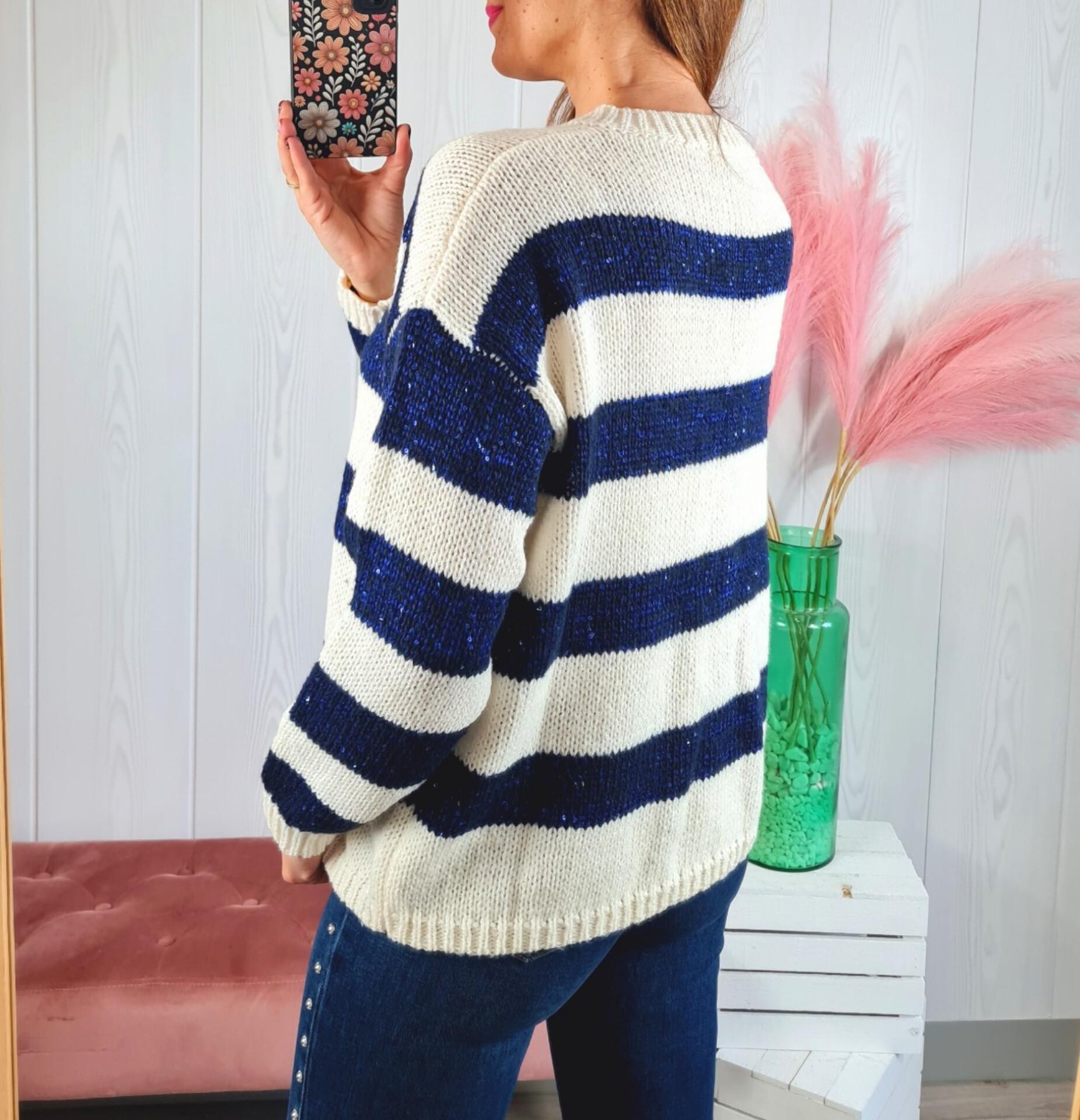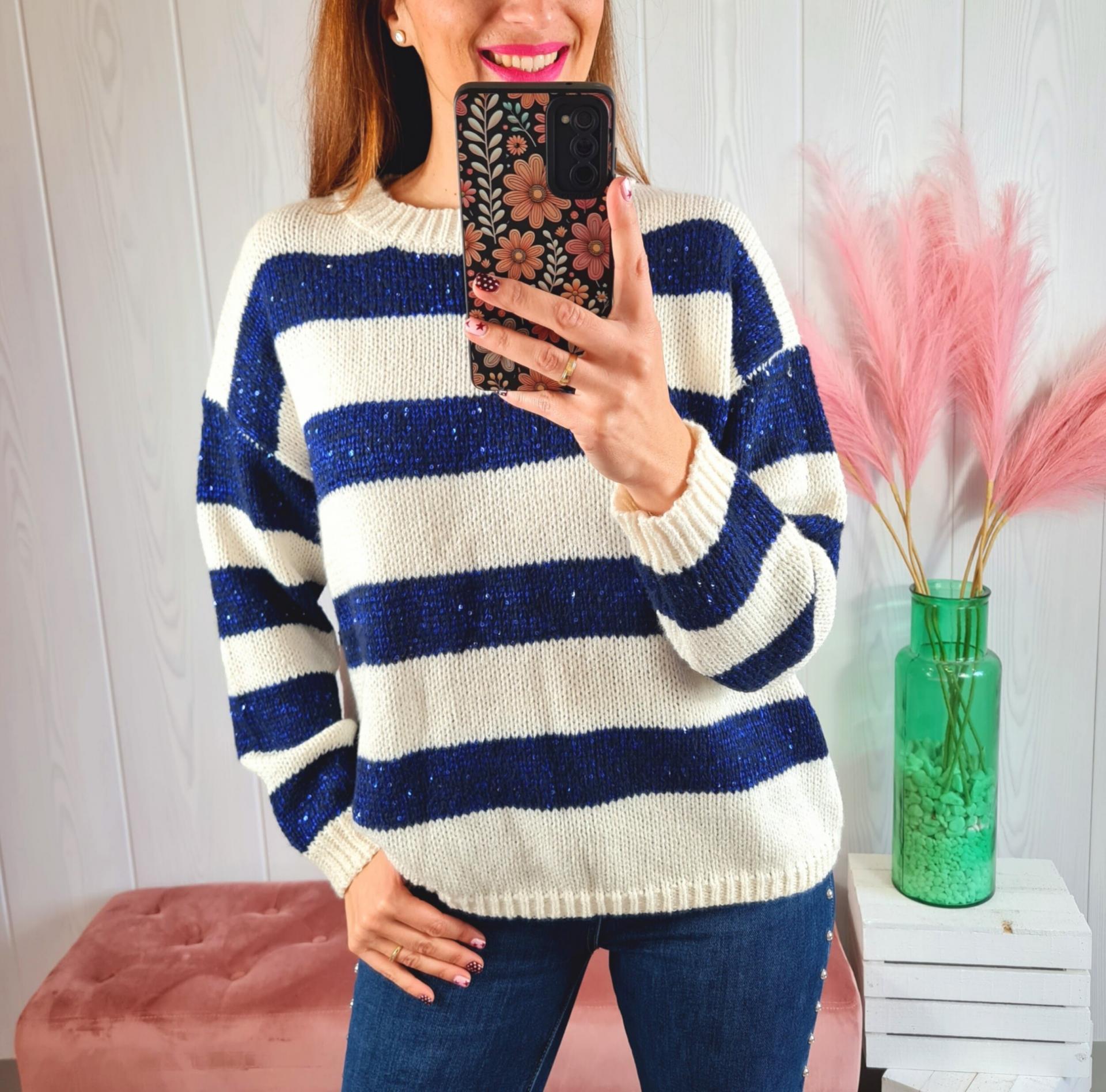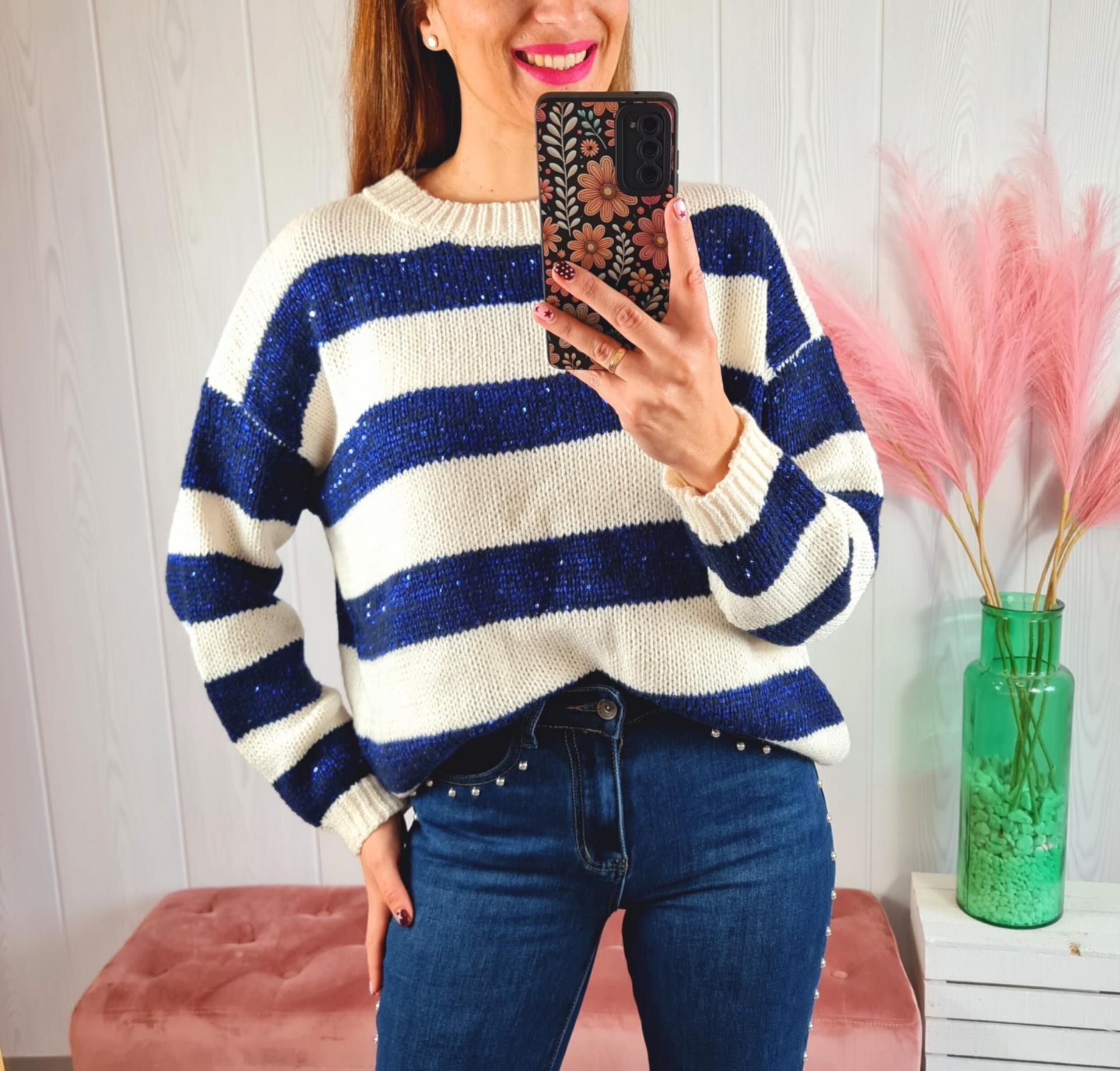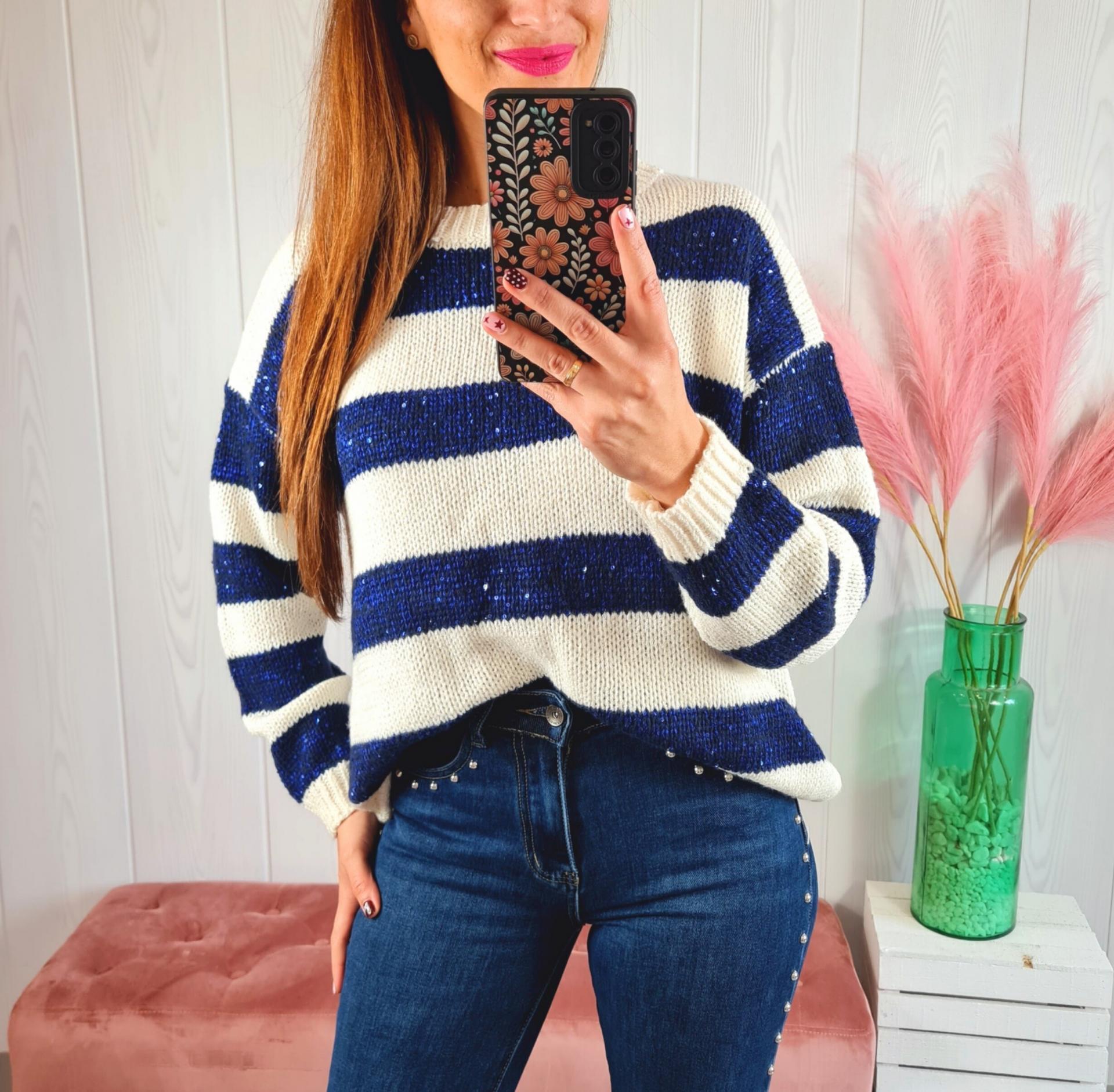 Jersey a rayas en color blanco roto y azul klein con lentejuelas. Tiene cuello redondo y manga larga.