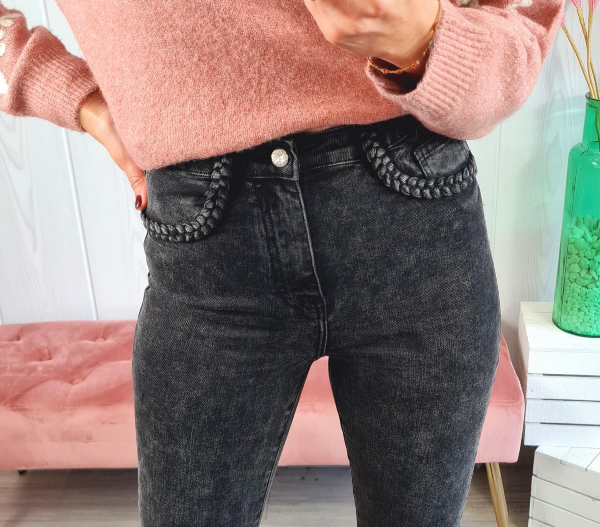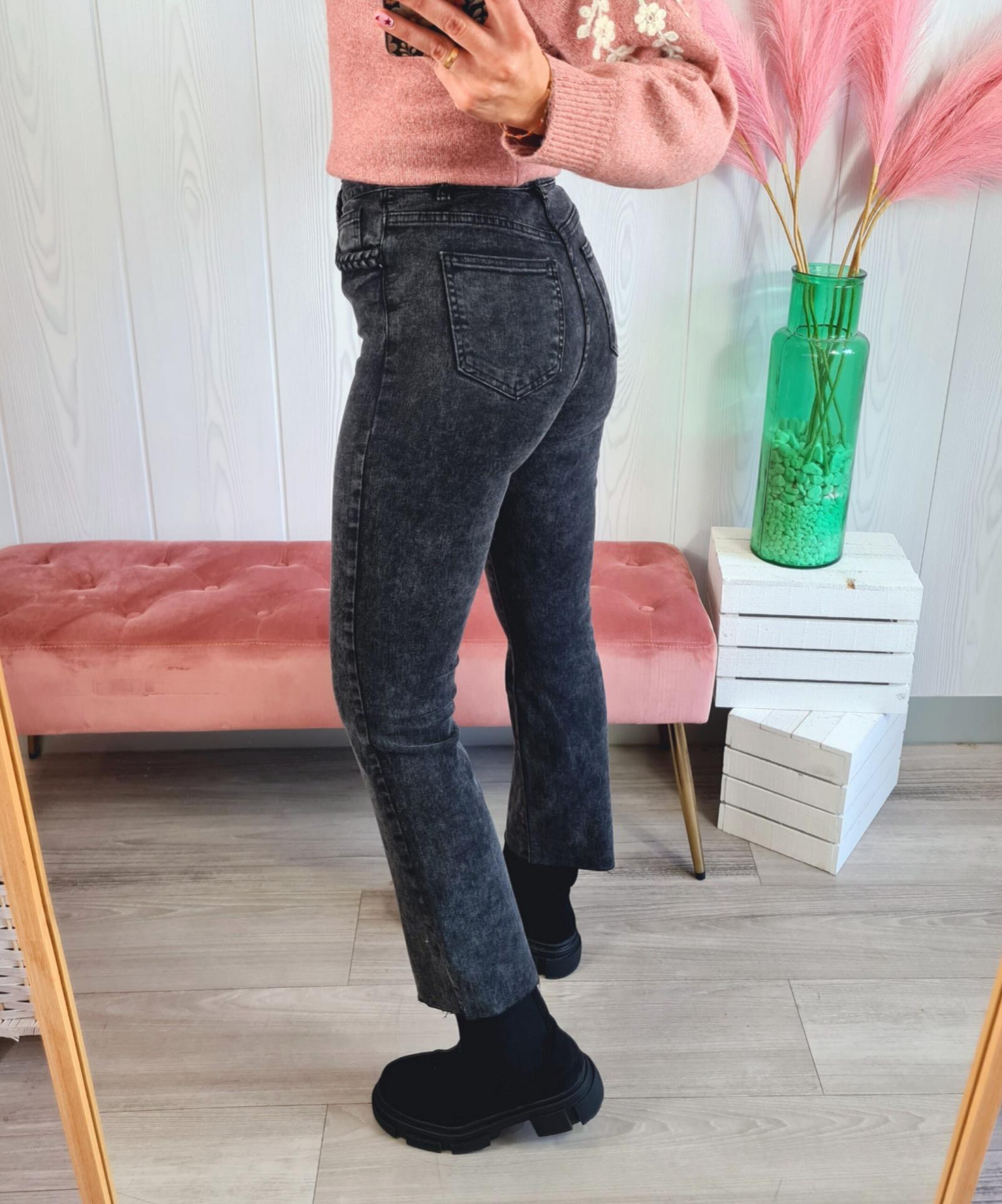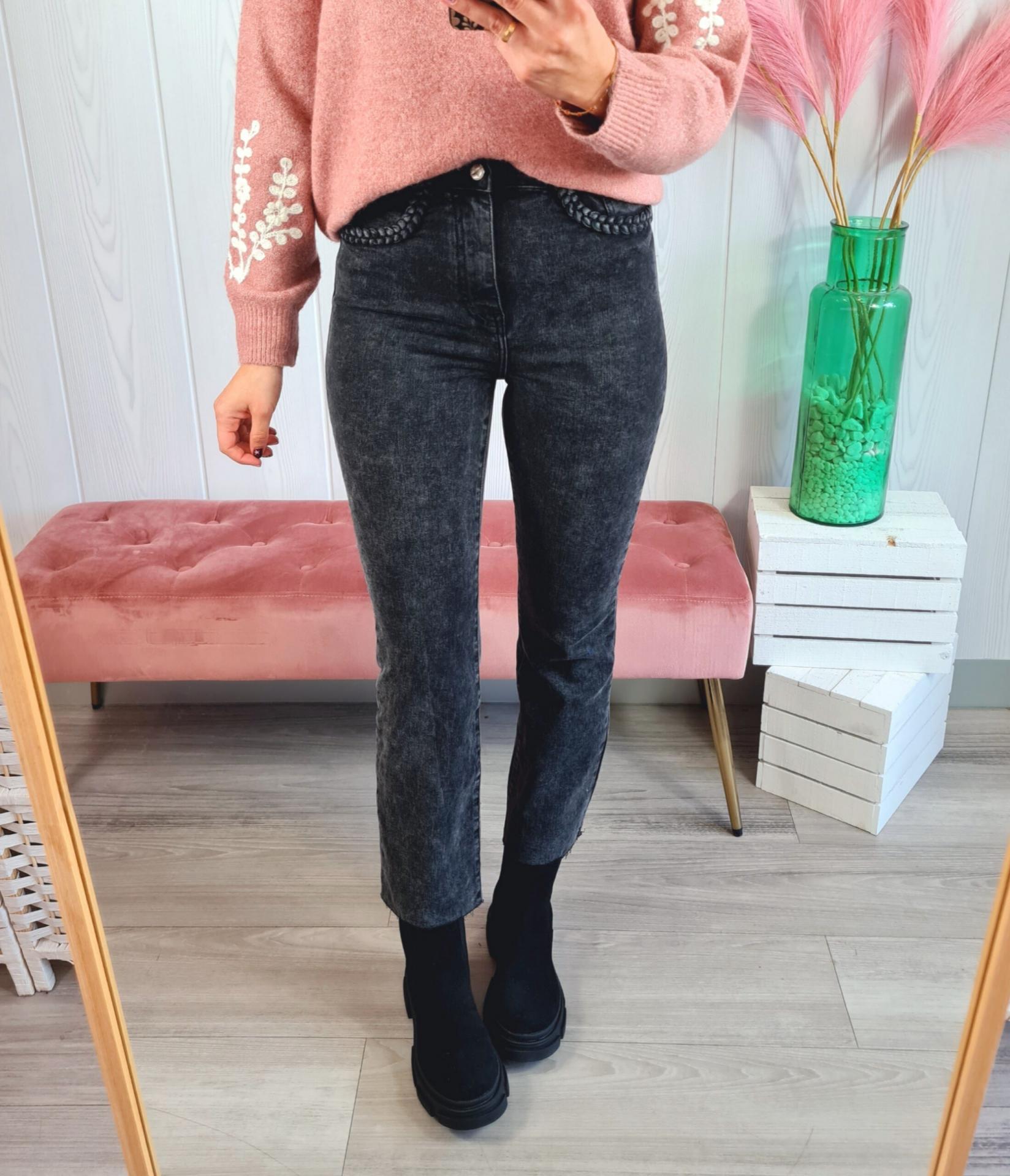 Pantalón vaquero en color gris desgastado, con el bajo flare desflecado y bolsillos adornado con trenzado alrededor. Tiene cierre con botón y cremallera.