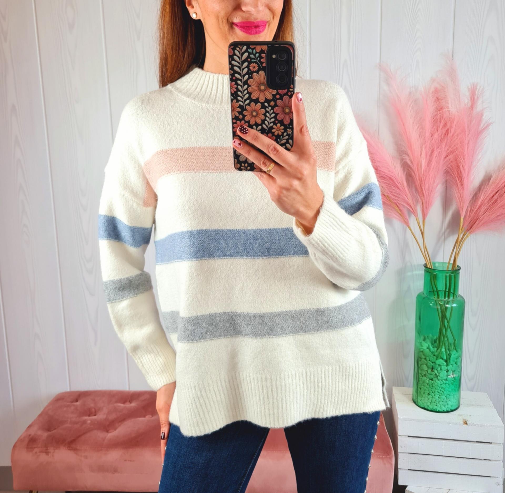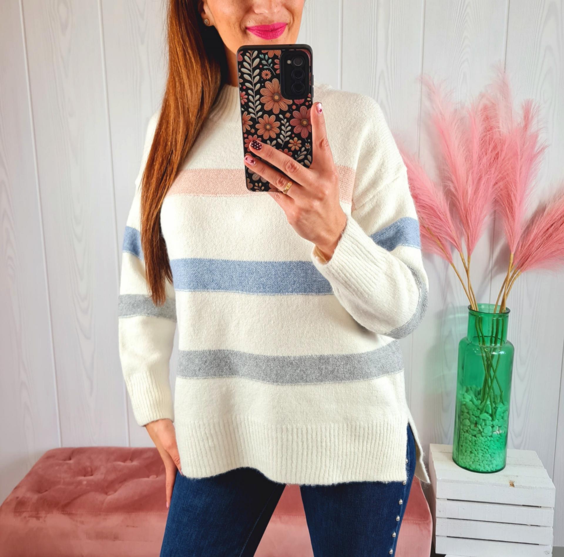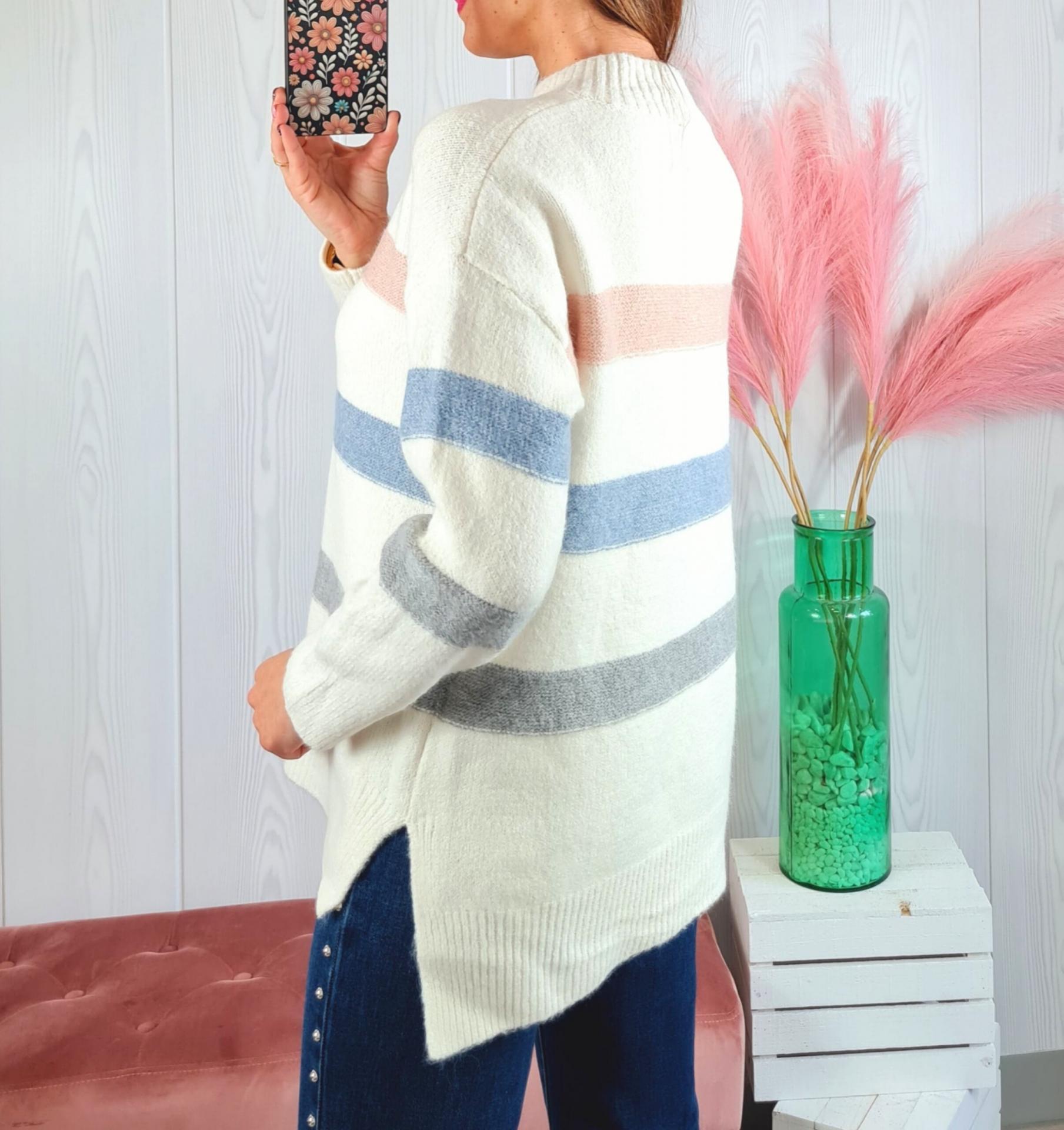 Jersey asimétrico con aberturas laterales en color blanco con rayas de colores. Tiene cuello redondo y manga larga.