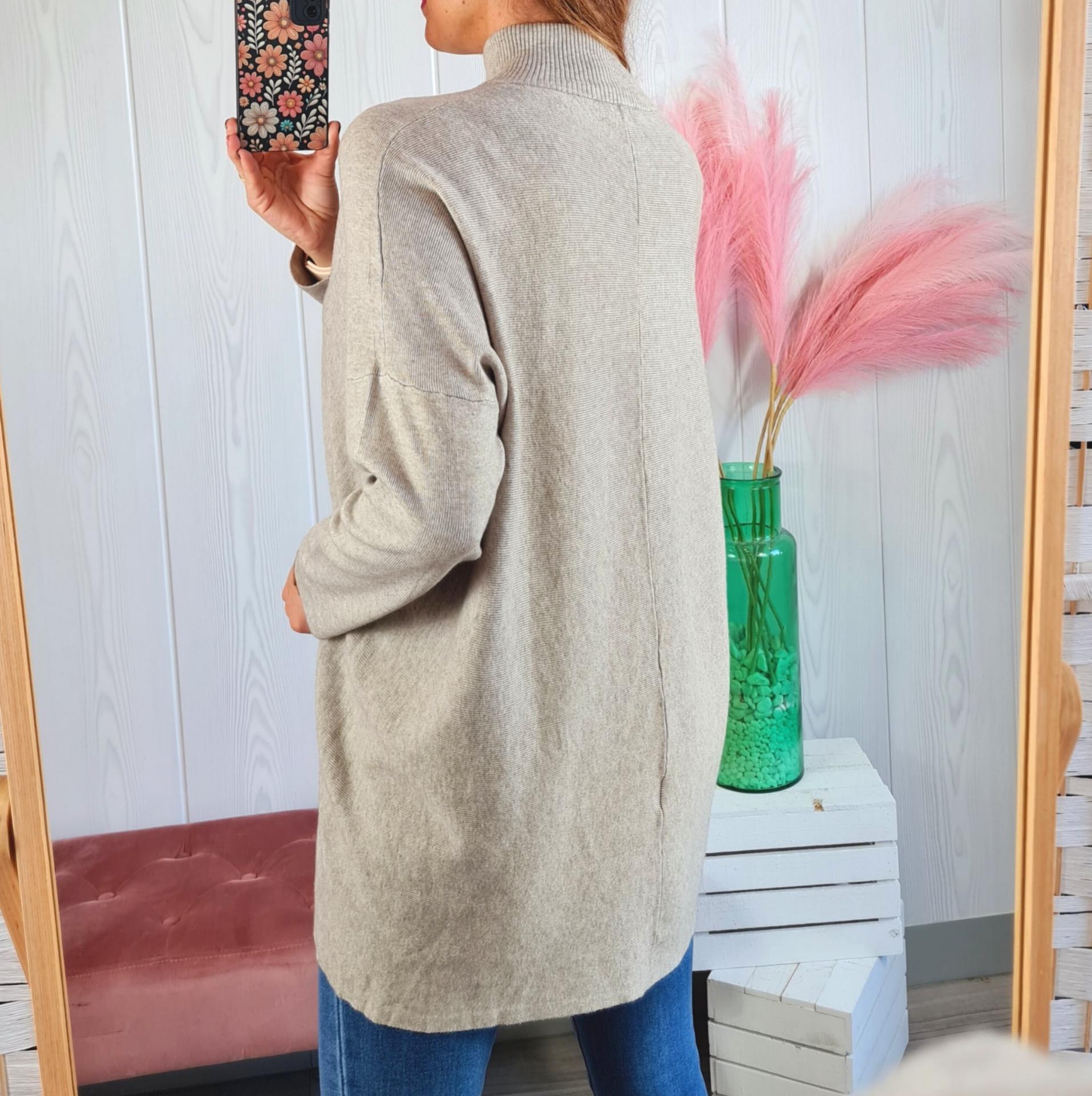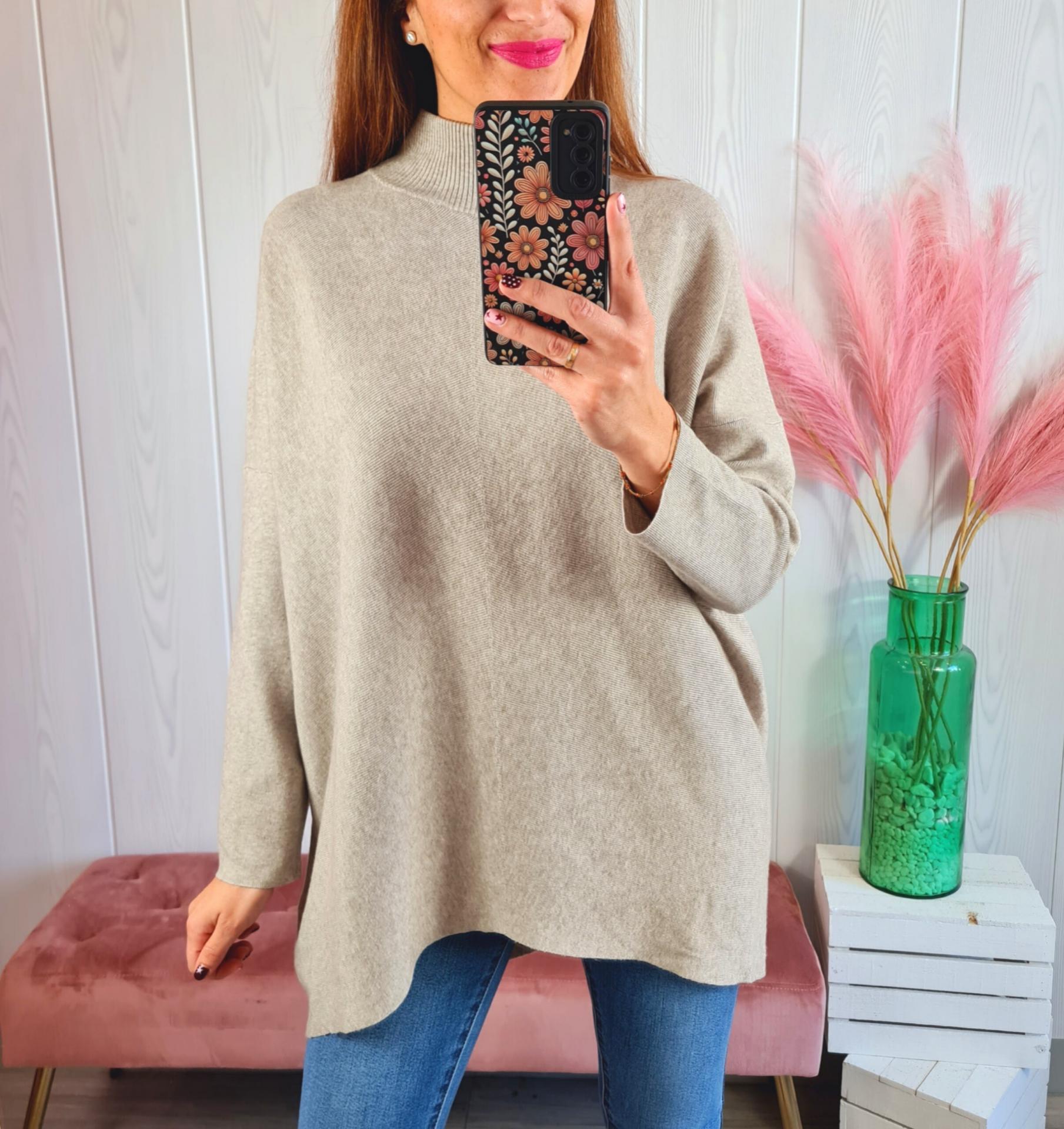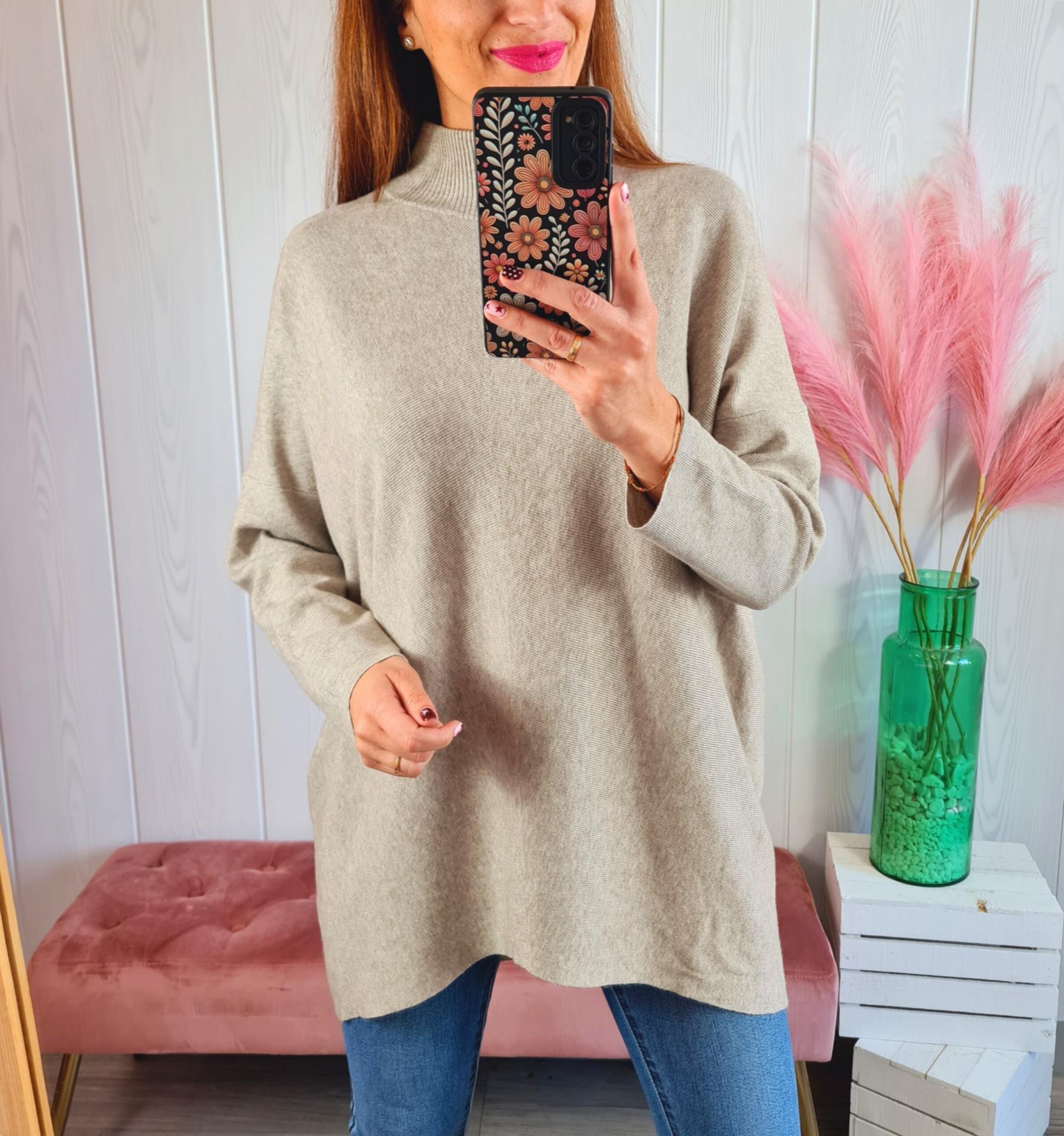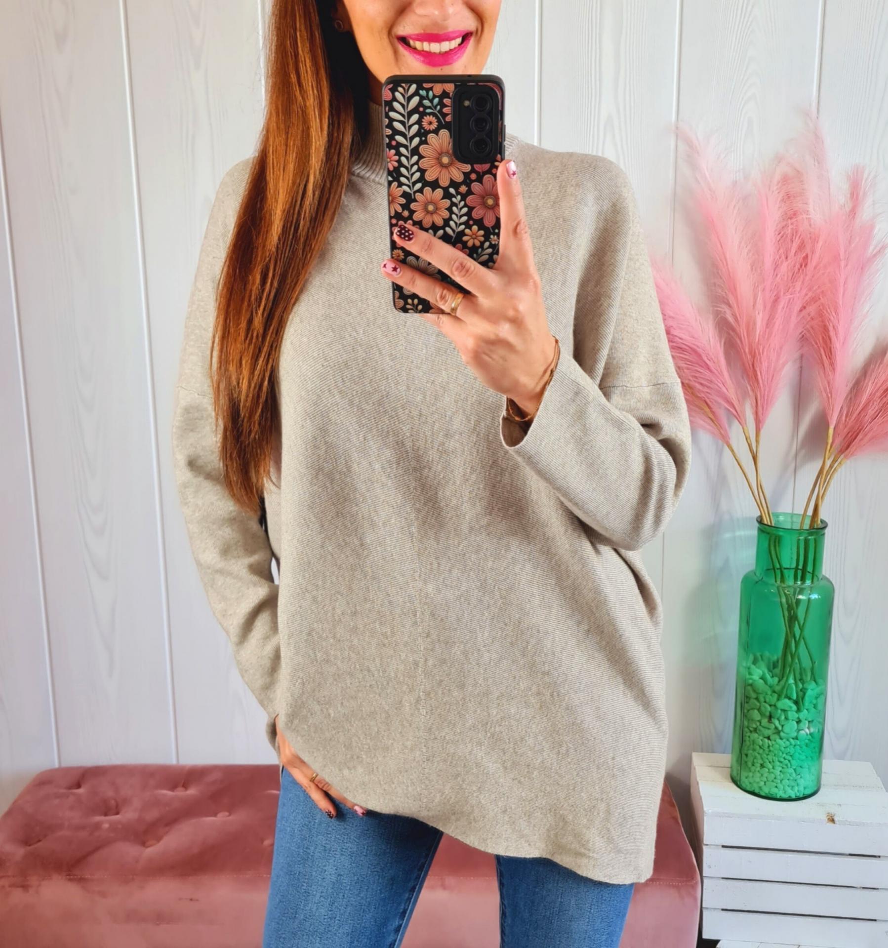 Maxi jersey liso en color beige/tierra. Tiene el cuello subido y manga larga.