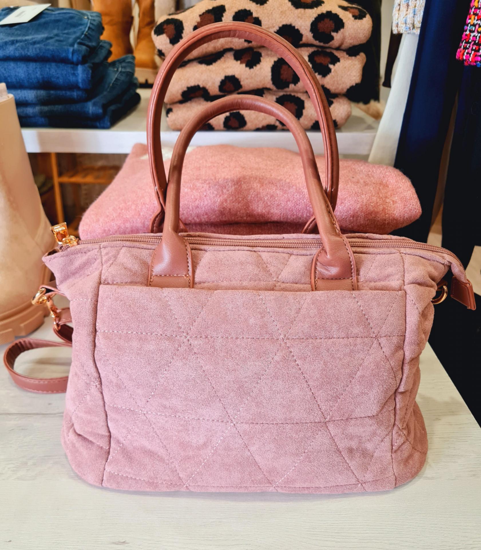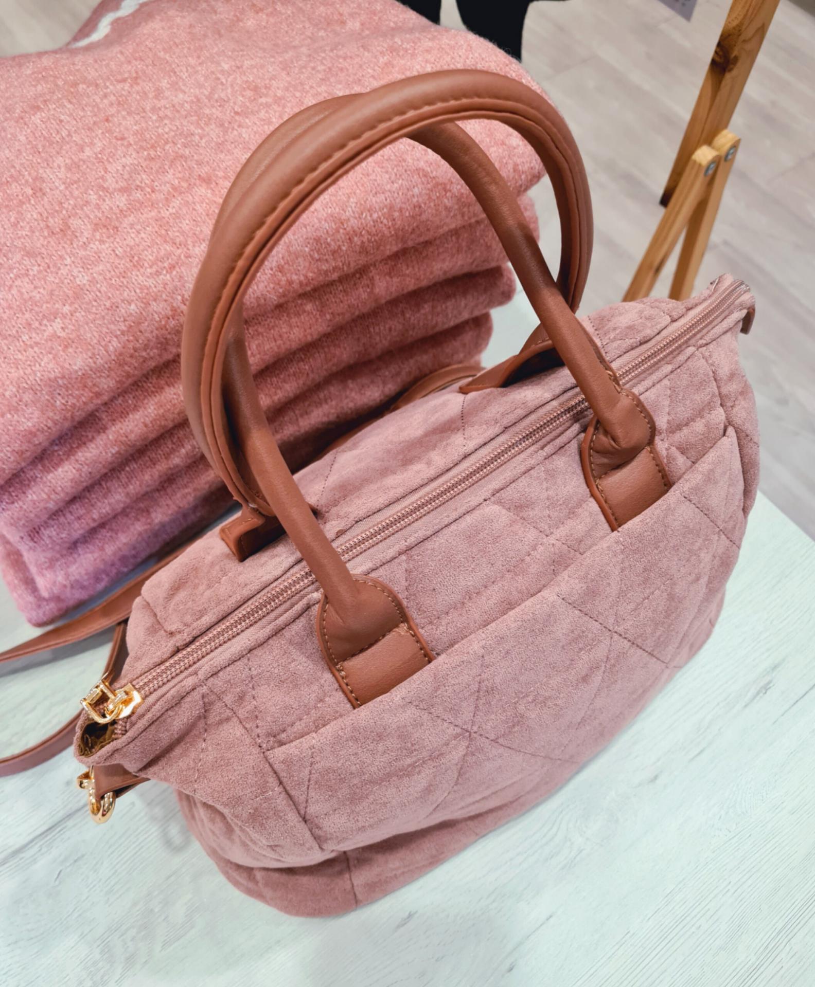Bandolera en color rosa, cierre con cremallera. Tiene forro interior, varios apartados y bolsillos.