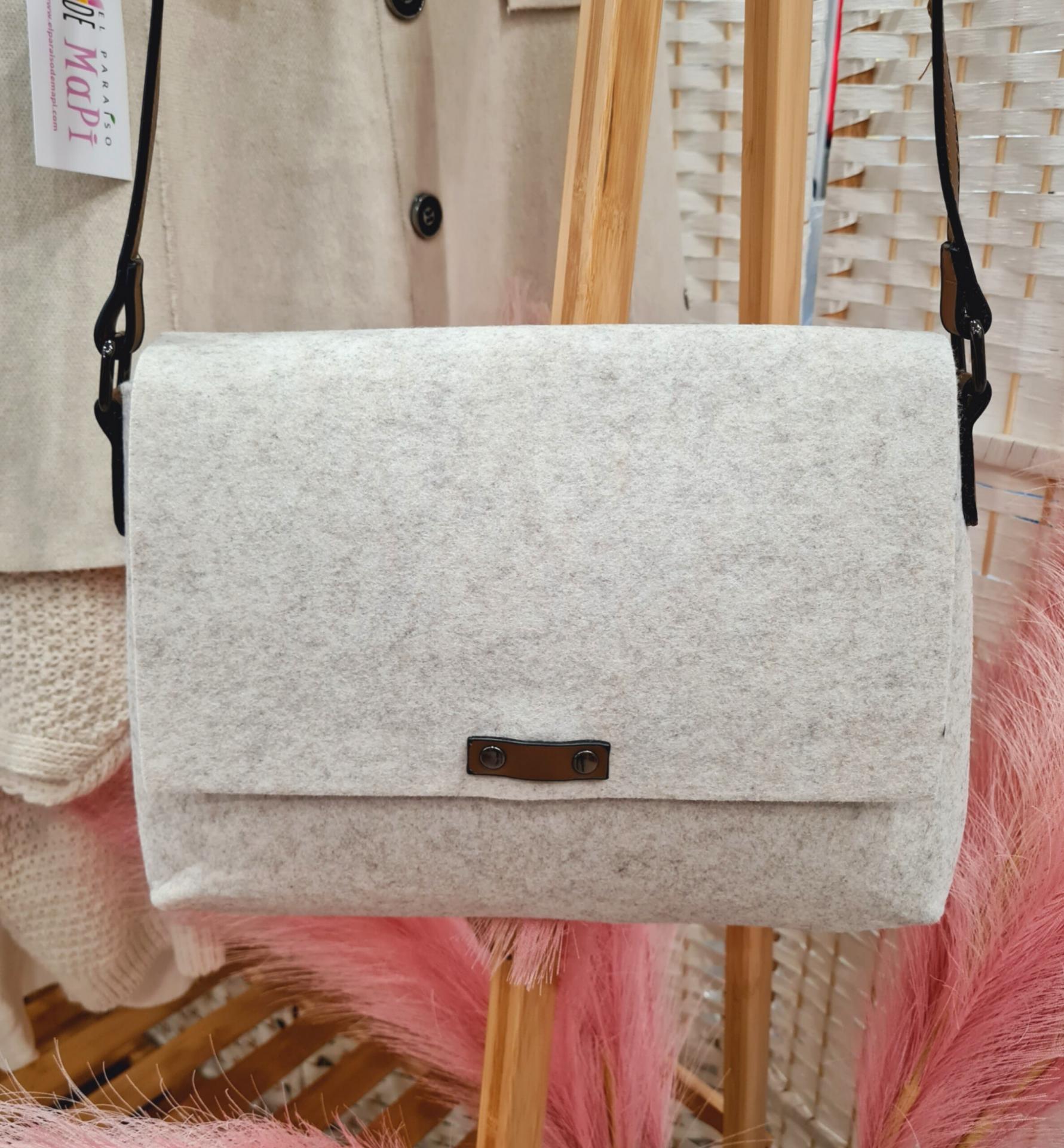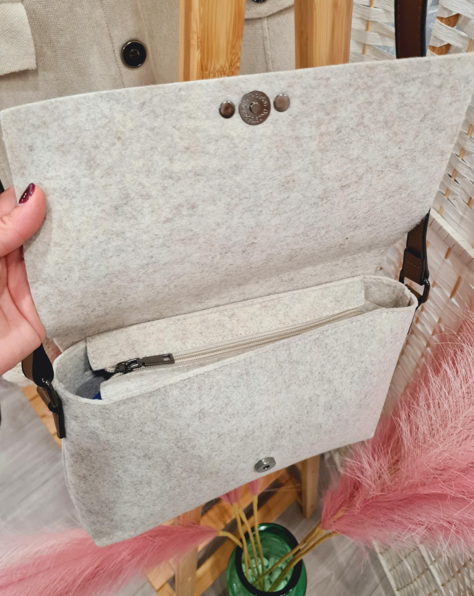 Bandolera en color beige, cierre con cremallera y solapa, tiene asa ajustable de cuero marrón. Tiene forro interior y bolsillos con cremallera.