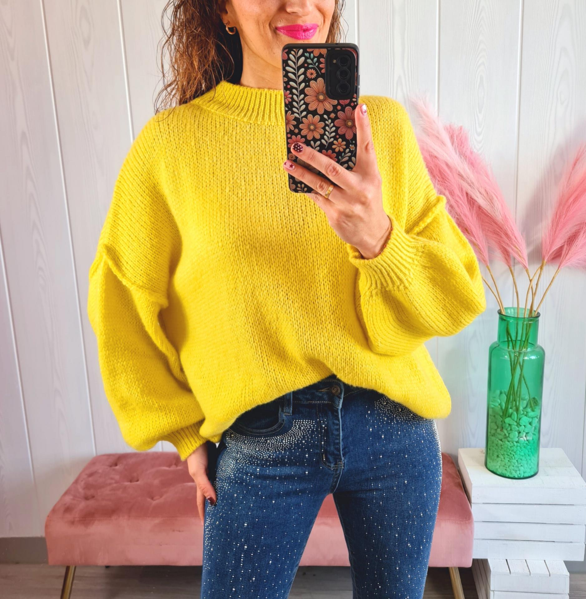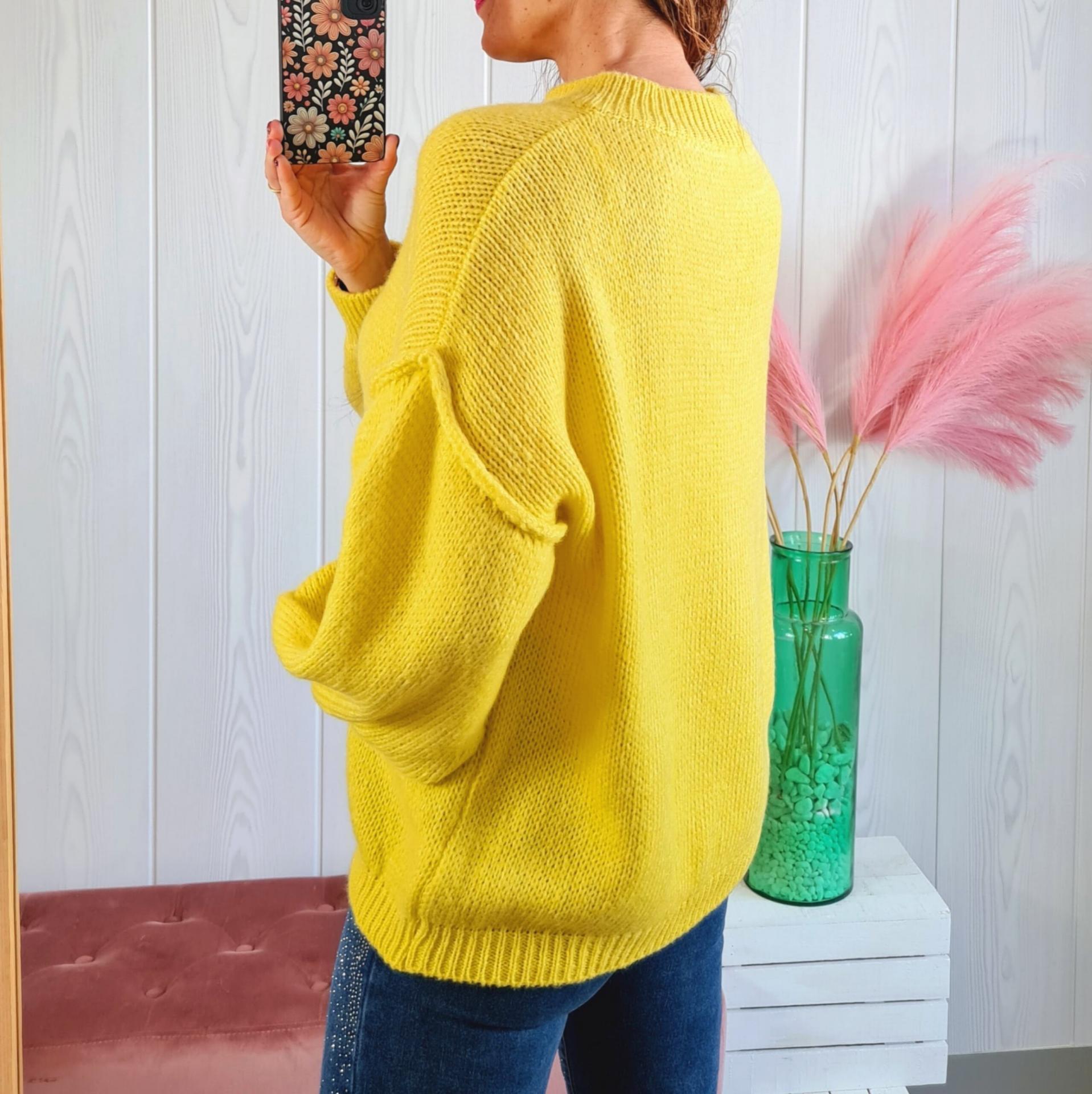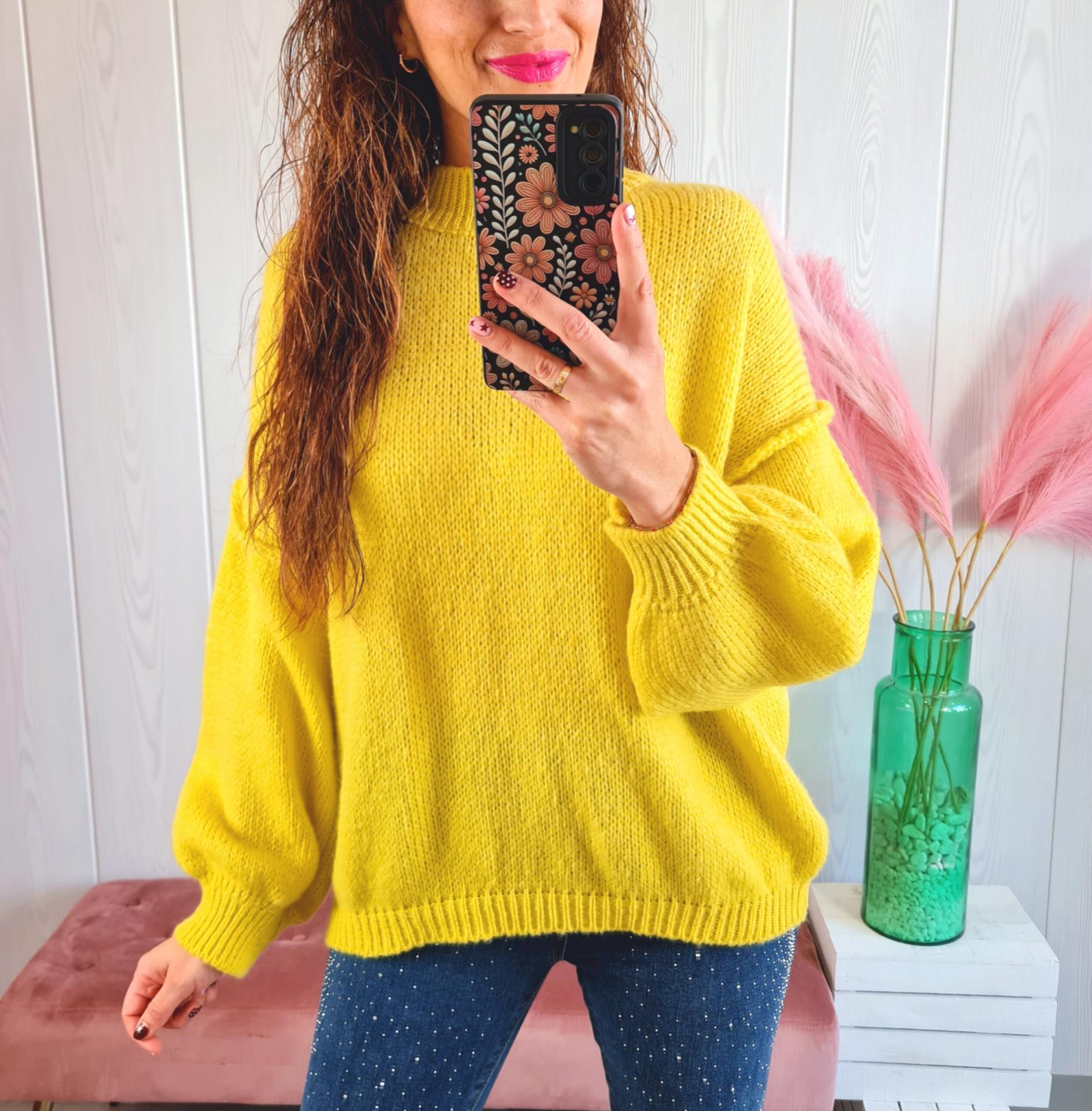 Maxi jersey de color amarillo, cuello redondo y manga larga.