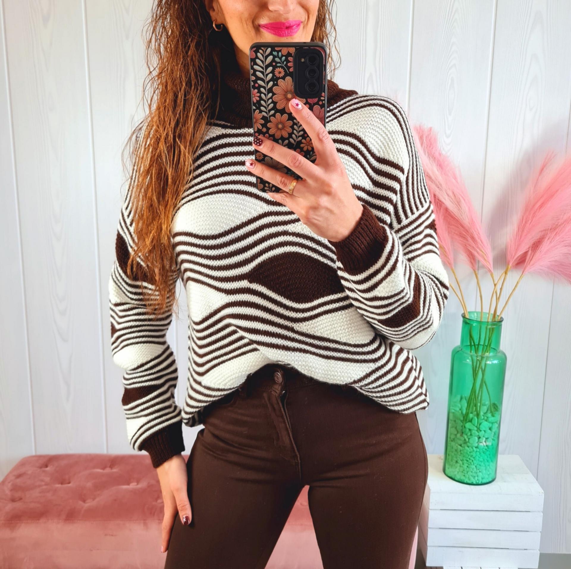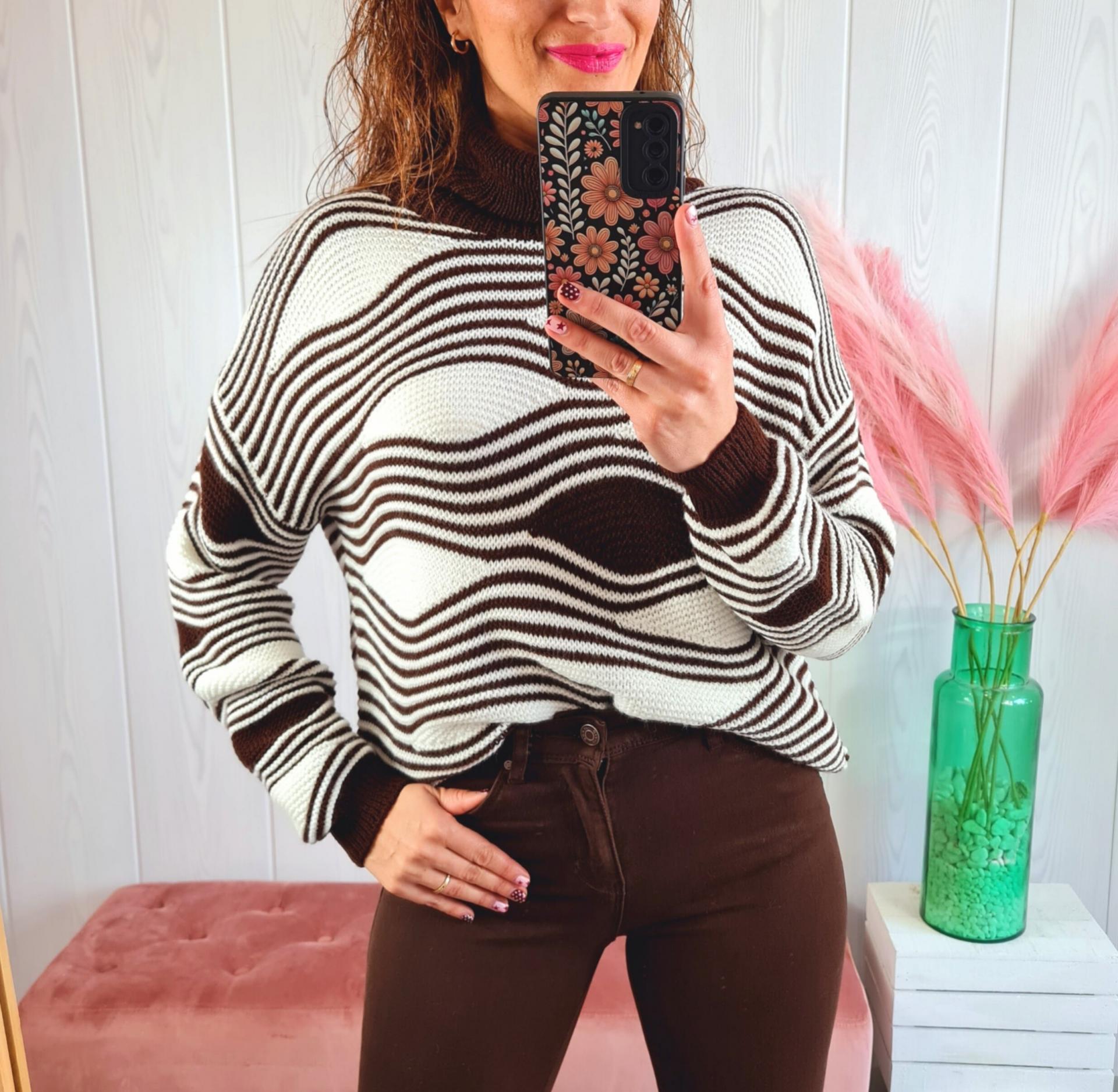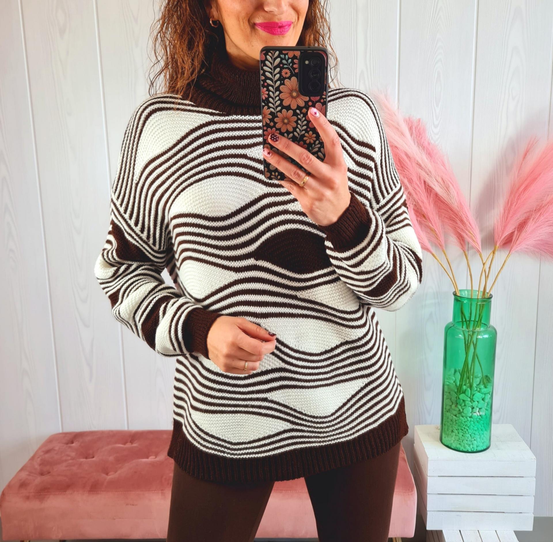 Jersey estampado en colores marrón chocolate y blanco, tiene cuello vuelto y manga larga.