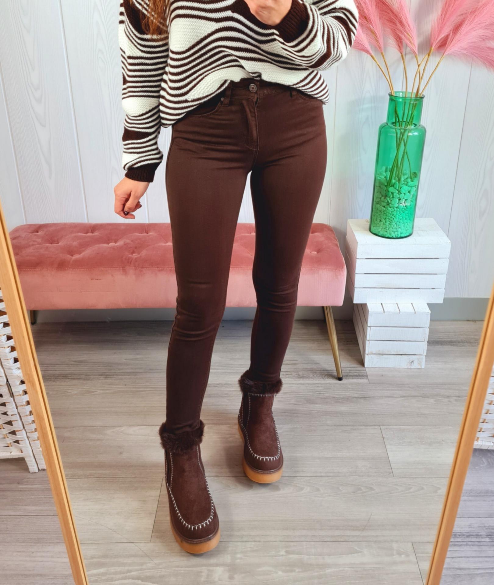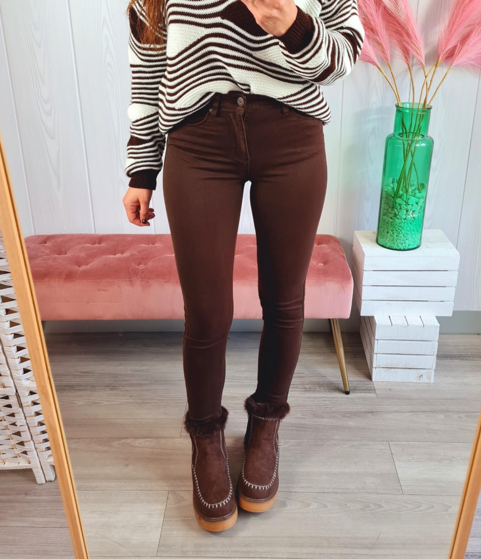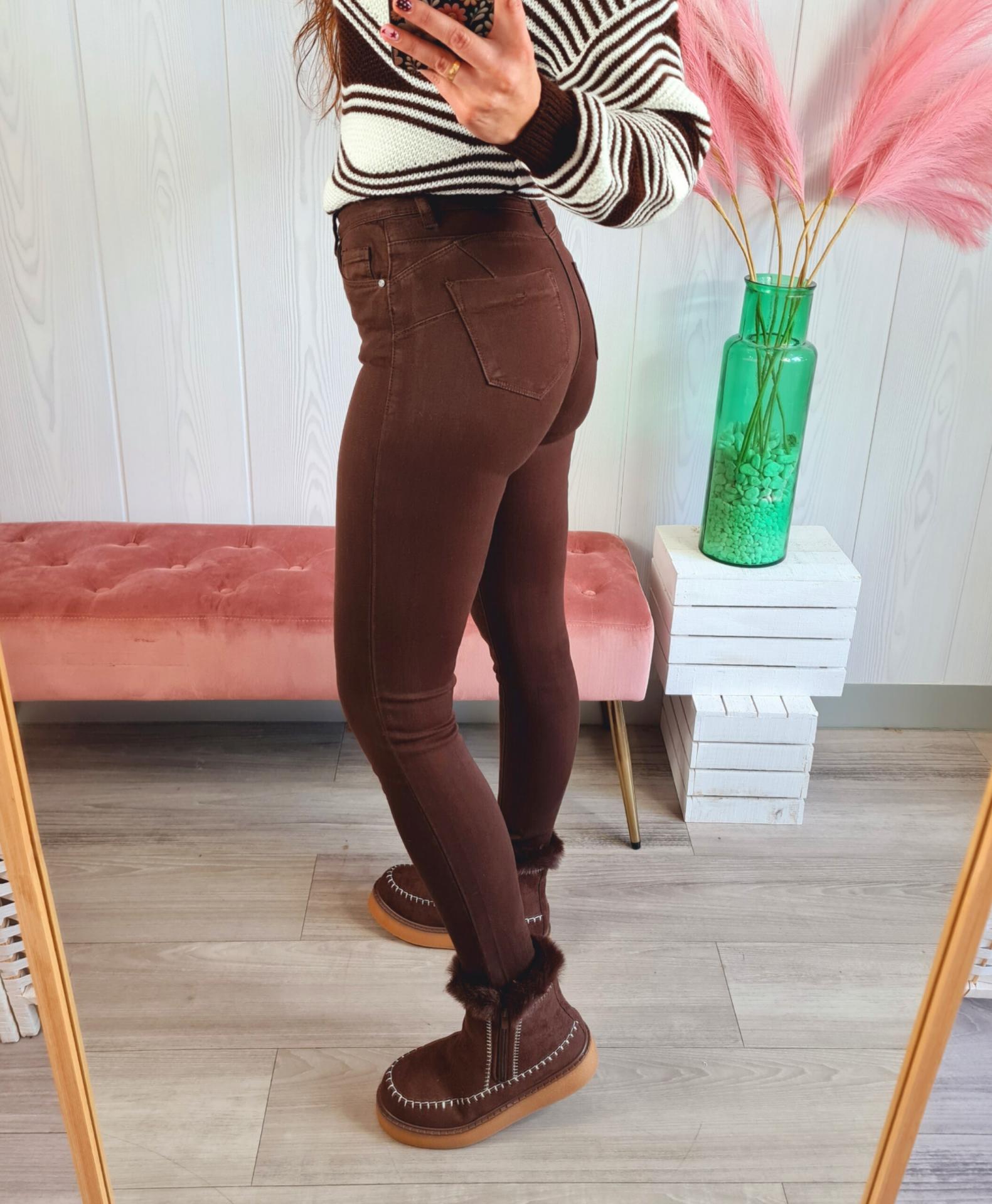 Pantalón skinny de color marrón oscuro, con tiro medio y efecto push-up.